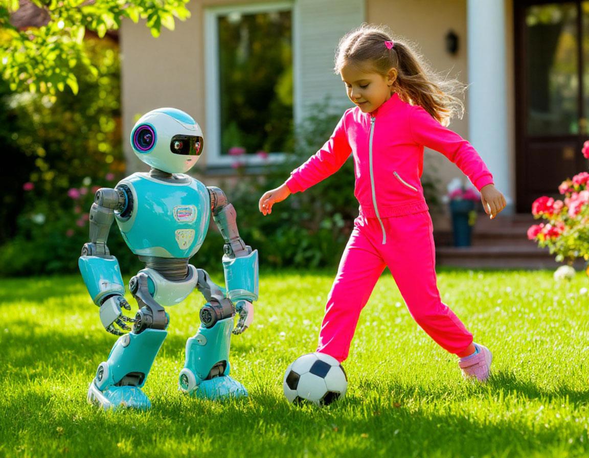 Запрос: «Стиль светлое будущее хай-тек кибернетика, девочка в ярком комбинезоне играет с роботом в мяч на лужайке у дома, день, лето, трава и цветы, добрая яркая картинка, динамика движение».