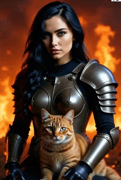 На спине кота сидела всадница в доспехах, темные волосы развевались, зеленые глаза горели в свете пожарищ.