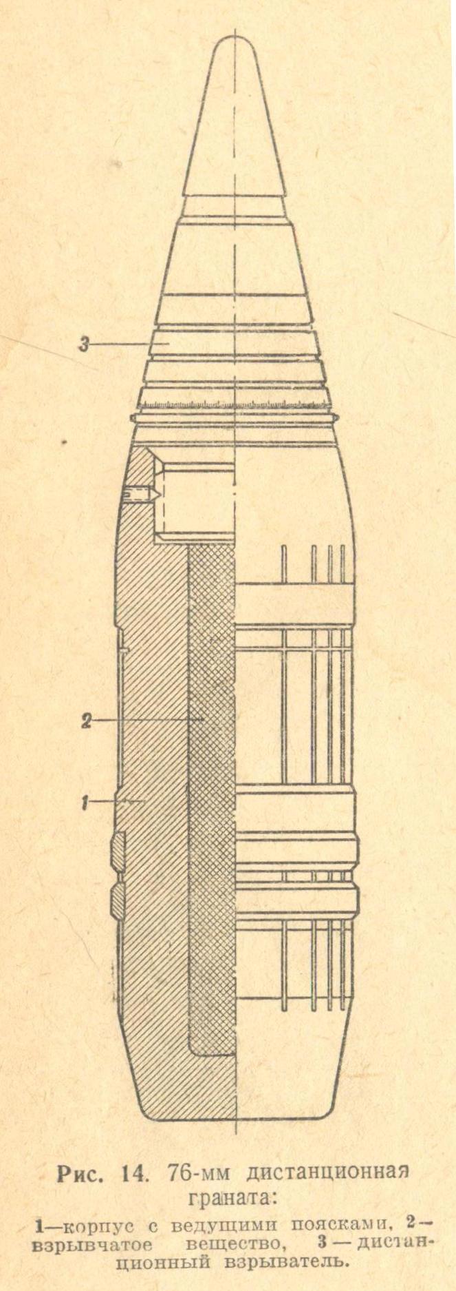 Шрапнель с трубкой Т-6 53-Ш-354Т. Добавочная скорость, сообщаемая пулям вышибным зарядом, составляет около 80 м/с.