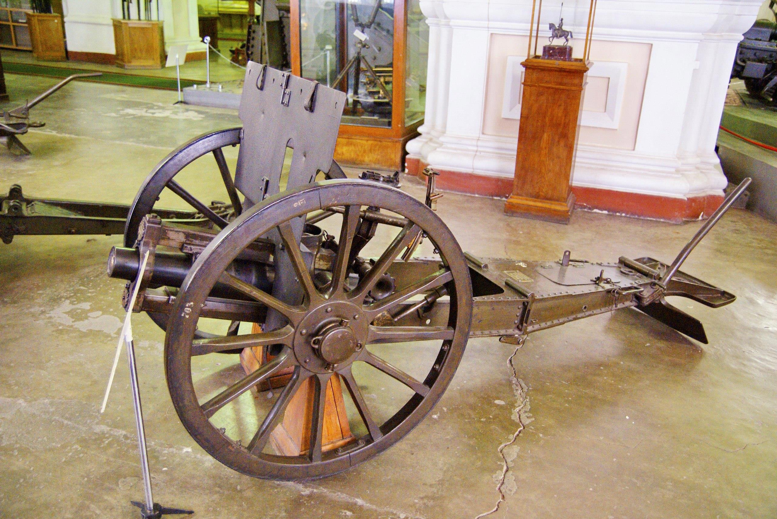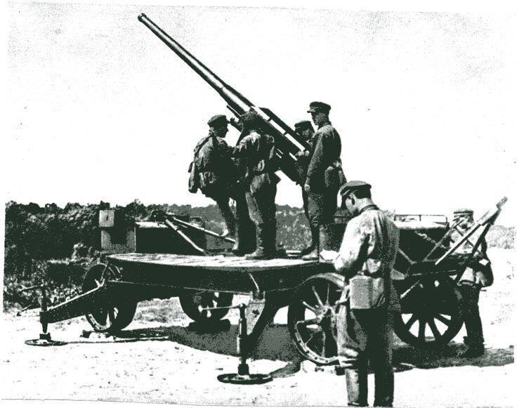 Зенитная пушка Тарновского-Лендера обр. 1914/15 гг. Длина ствола 30,5 калибров. Начальная скорость снаряда 588 м/сек. Досягаемость по высоте с 22-секундной трубкой — 5800 м. Замок клиновой вертикальный, полуавтоматический. Устанавливалась на тумбе с кузове грузового автомобиля ("Уайт" или "Руссо-Балт").