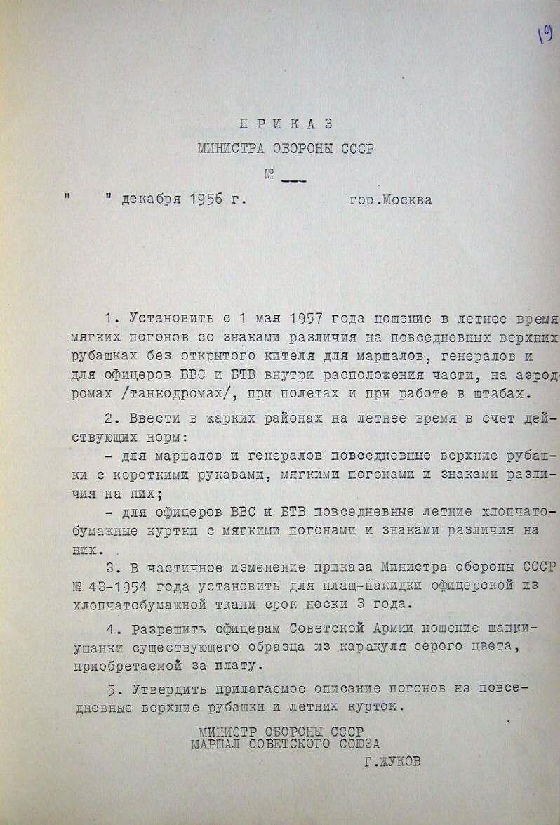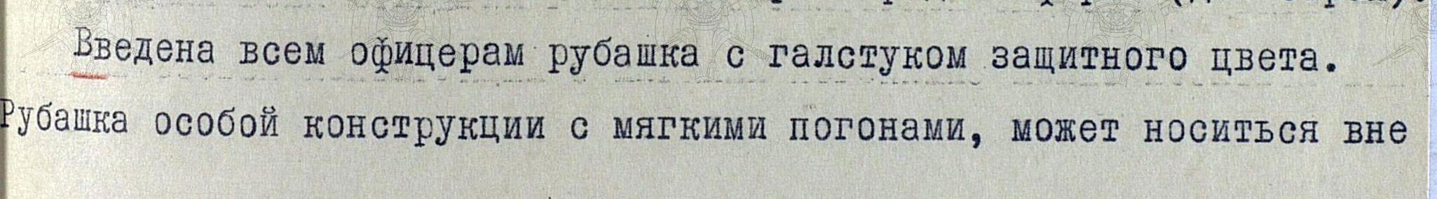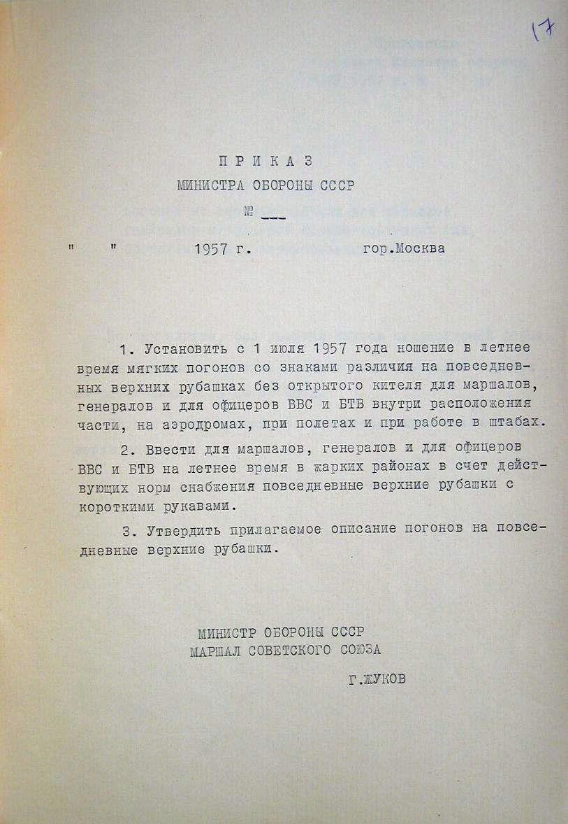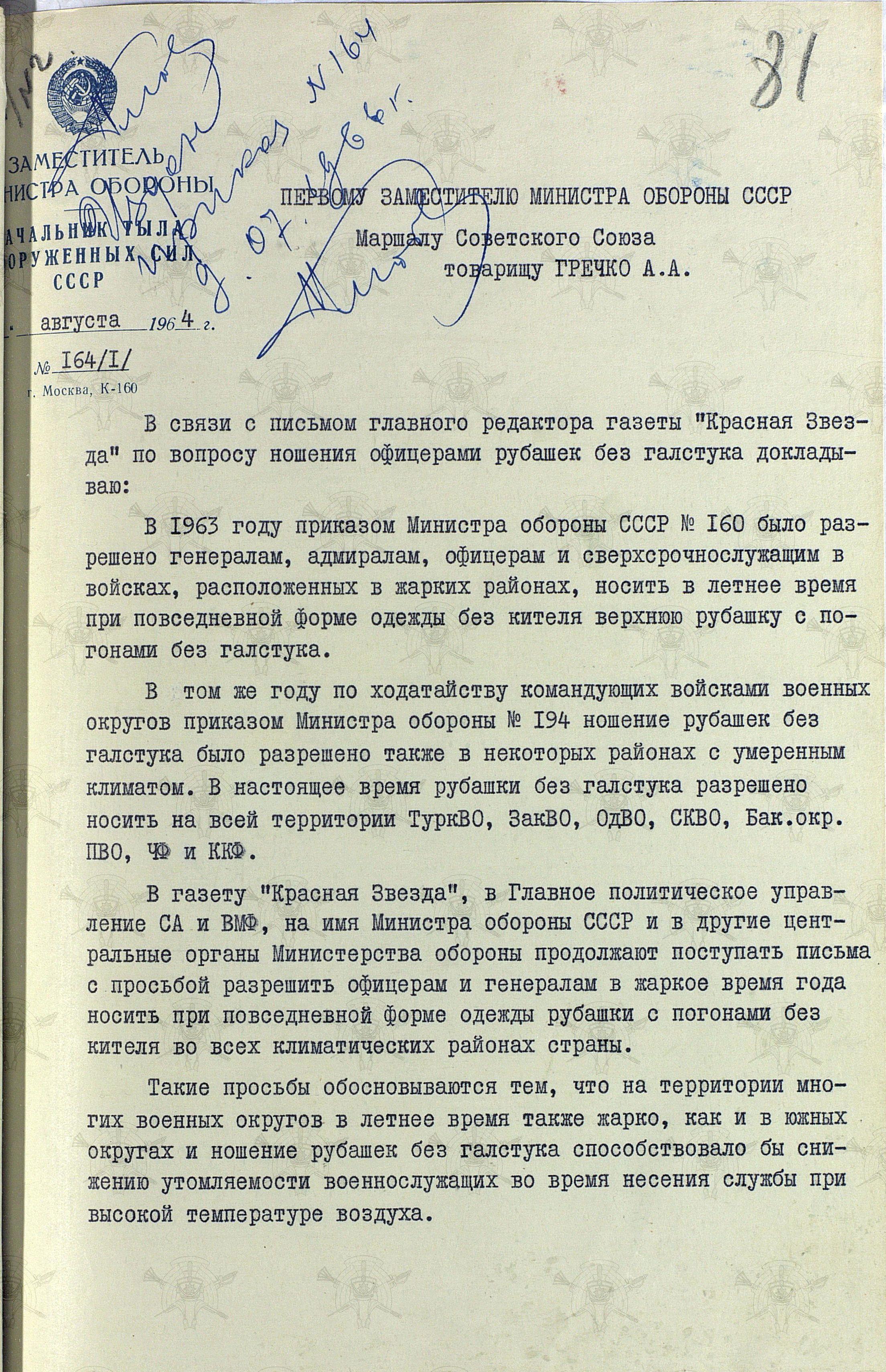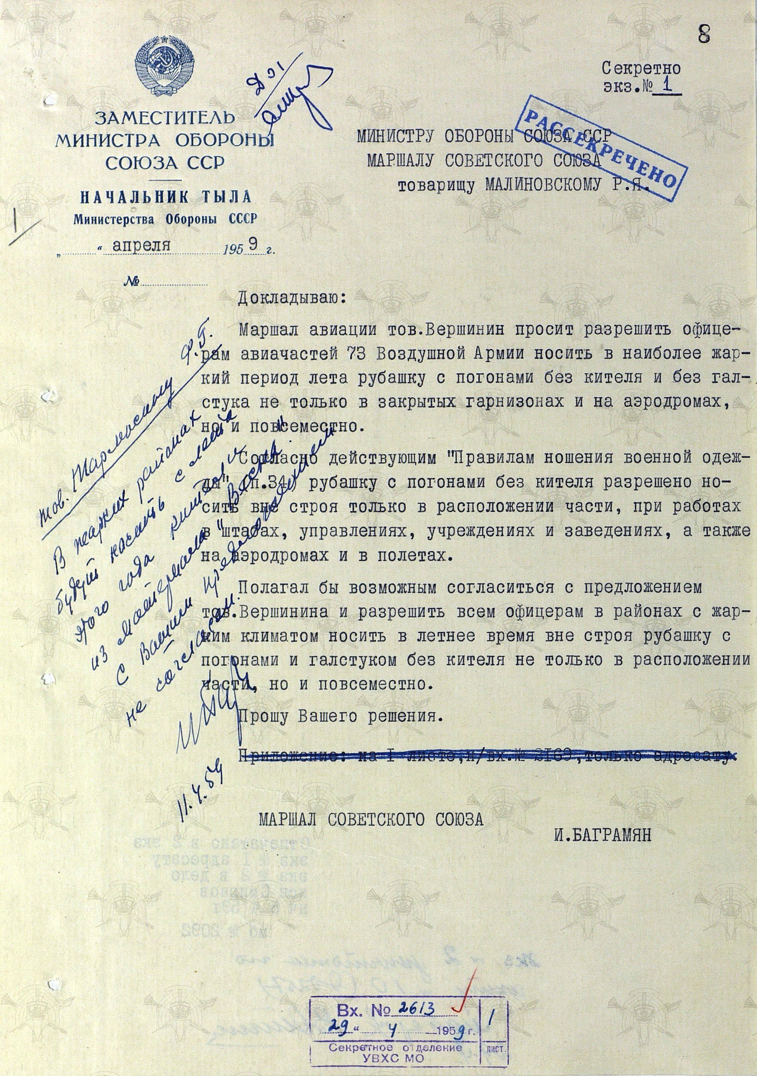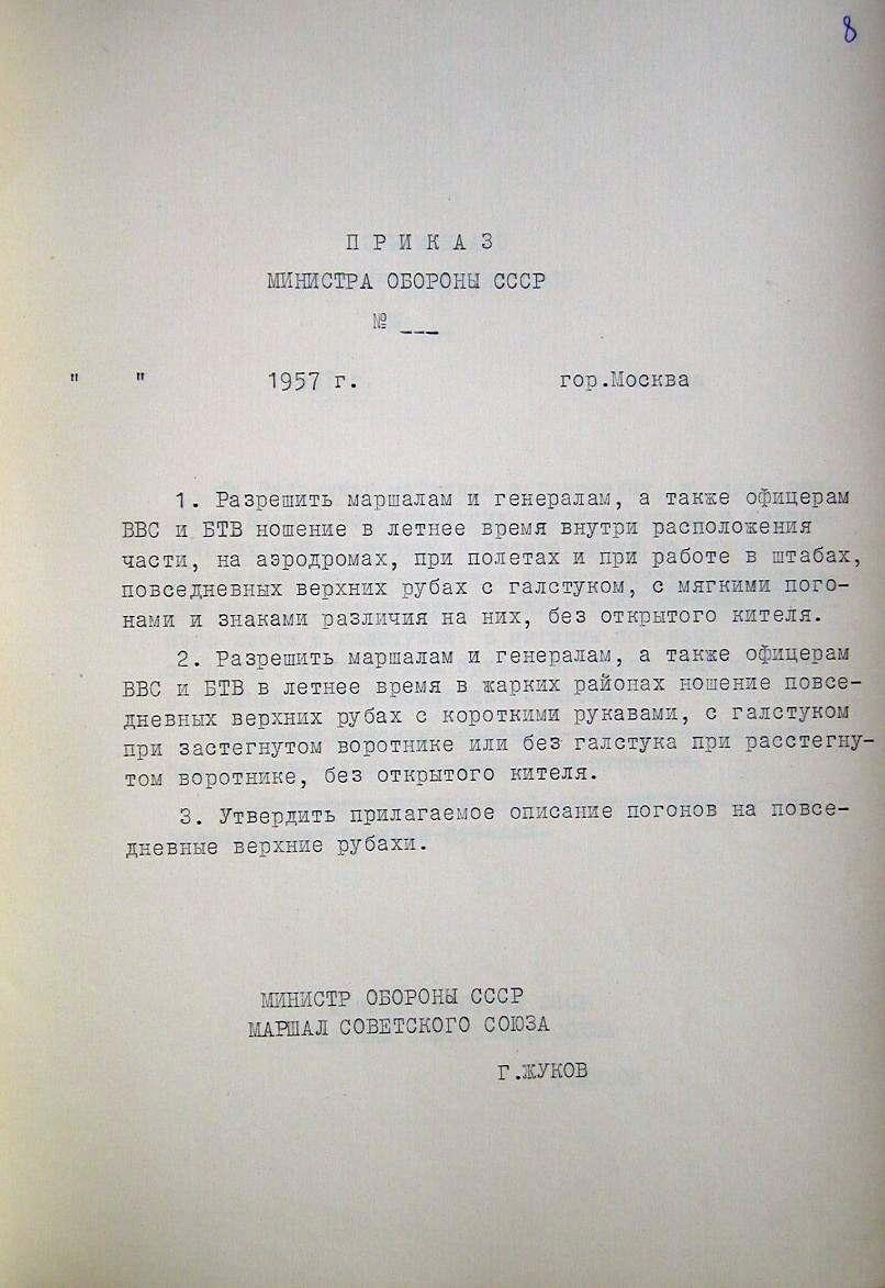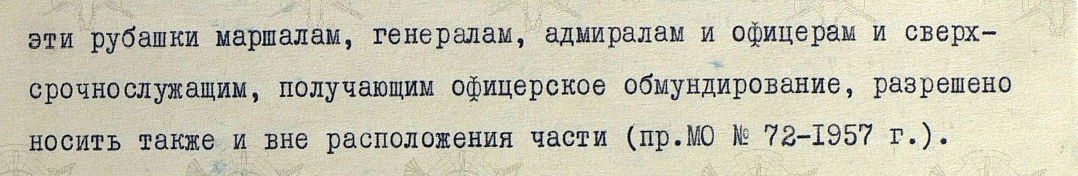 В ответ на запрос маршала авиации К.А. Вершинина и ходатайство начальника Управления вещевого снабжения МО СССР генерала Ф.Г. Тармосина о разрешении офицерам 73 Воздушной армии носить в наиболее жаркий период лета рубашку с погонами без кителя и без галстука не только в гарнизон, но и повсеместно, наложена резолюция следующего содержания: