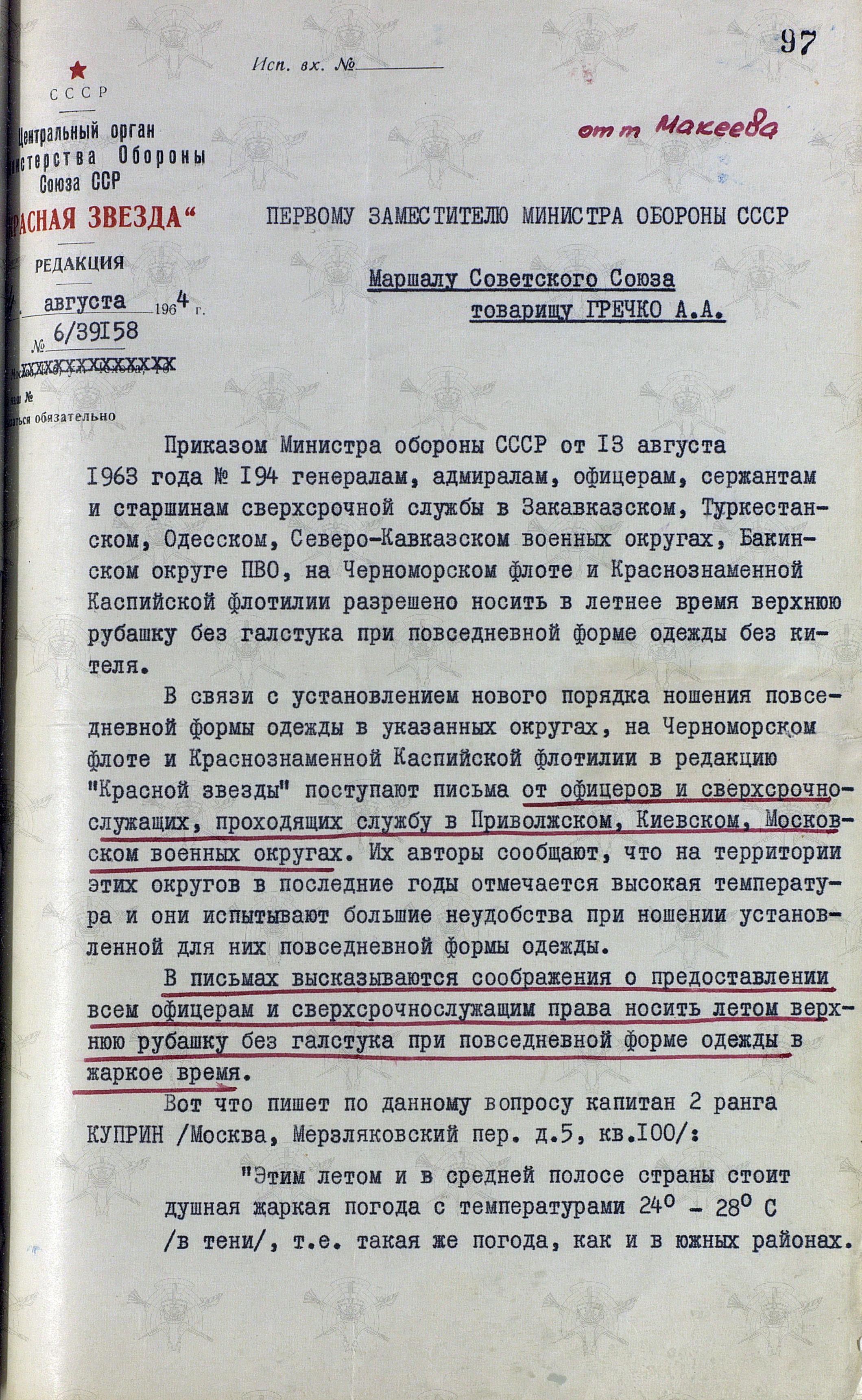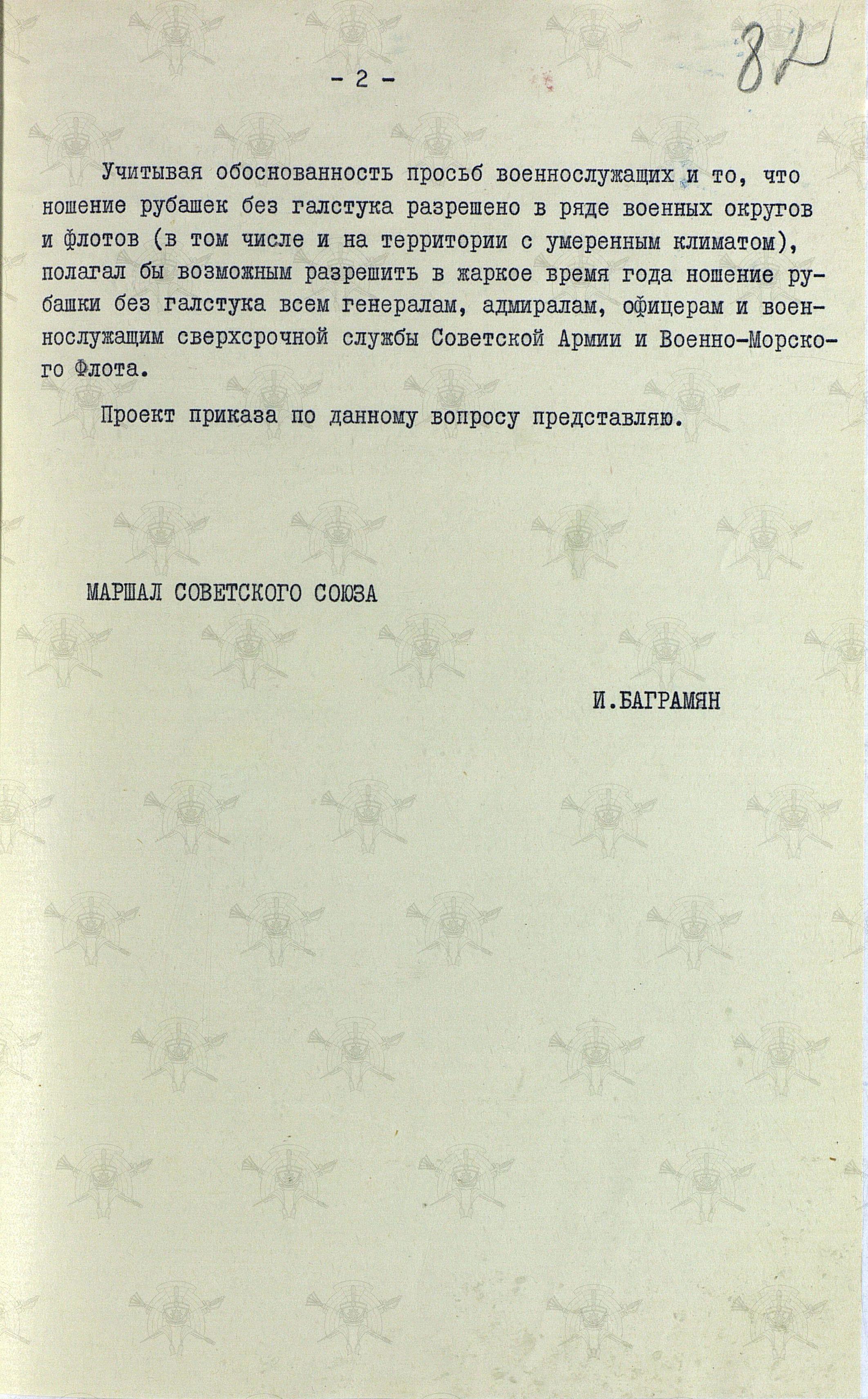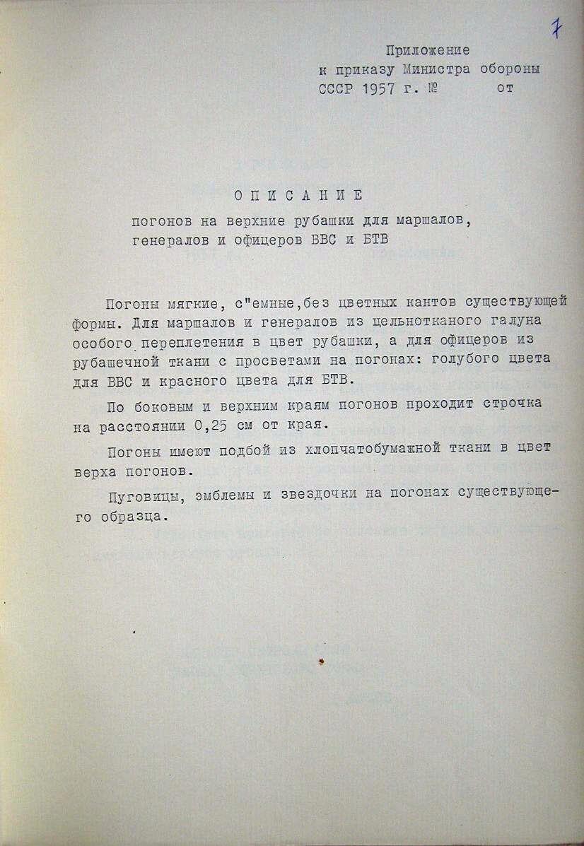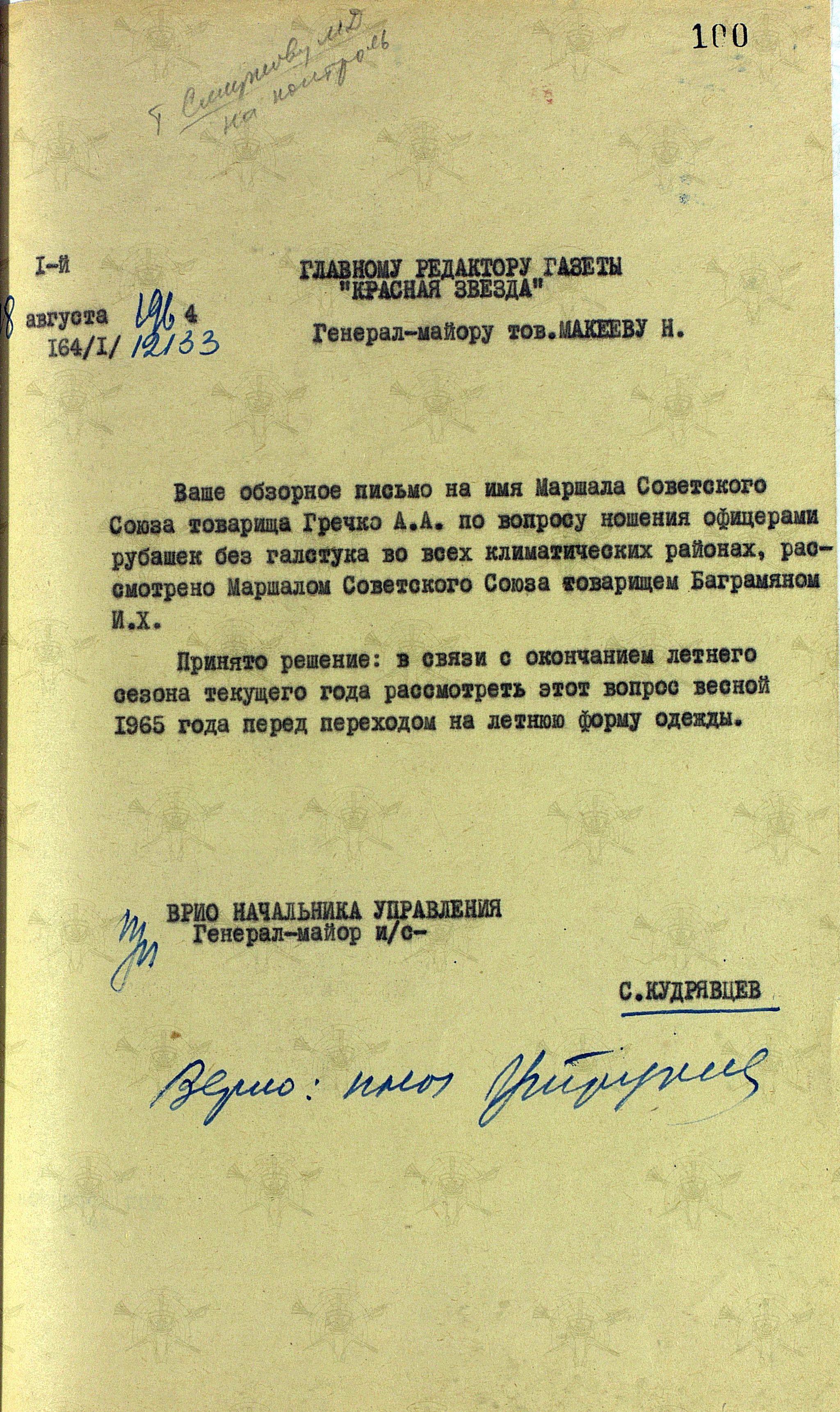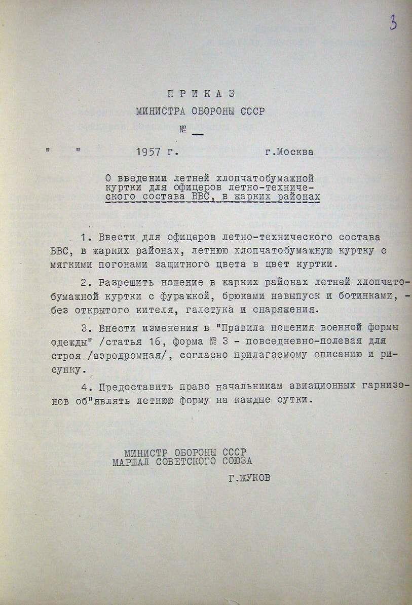 В ответ на запрос маршала авиации К.А. Вершинина и ходатайство начальника Управления вещевого снабжения МО СССР генерала Ф.Г. Тармосина о разрешении офицерам 73 Воздушной армии носить в наиболее жаркий период лета рубашку с погонами без кителя и без галстука не только в гарнизон, но и повсеместно, наложена резолюция следующего содержания: