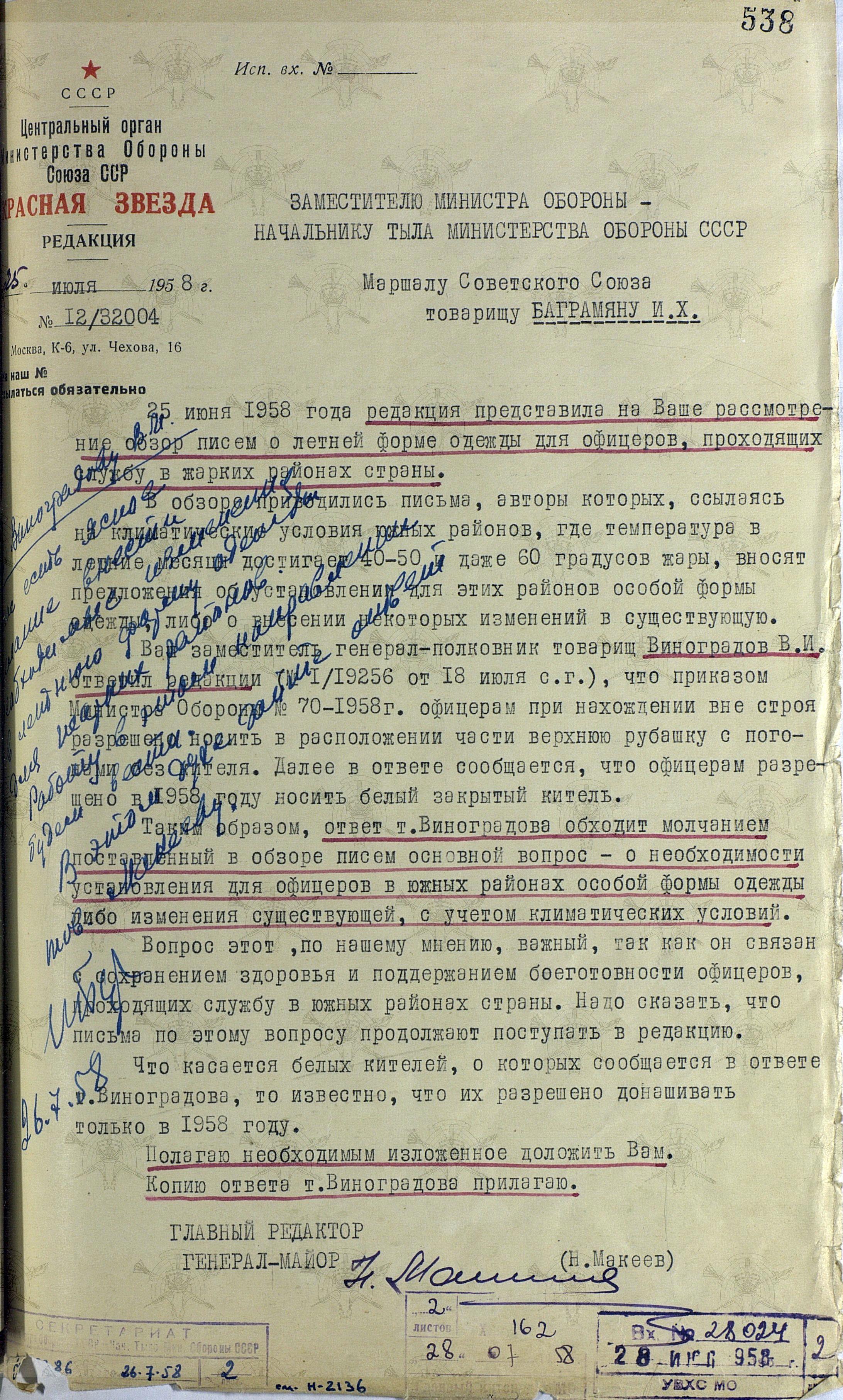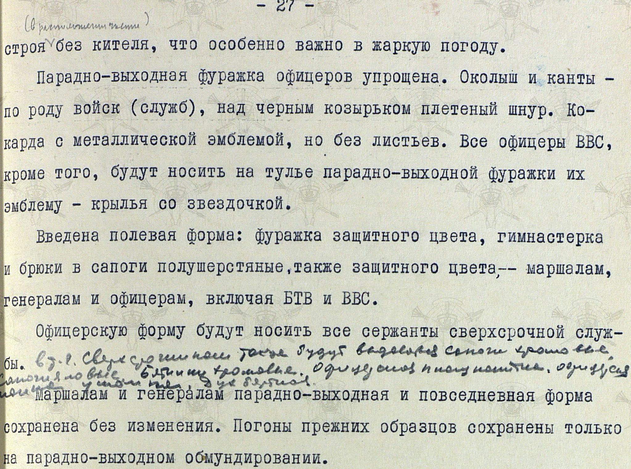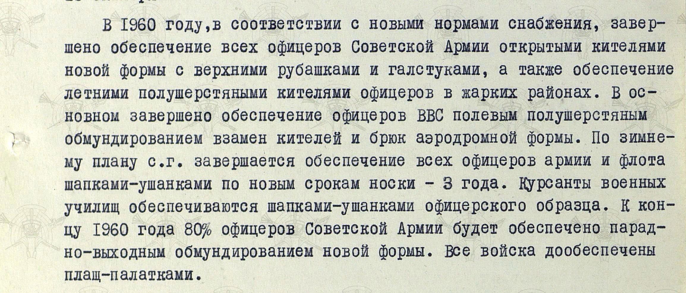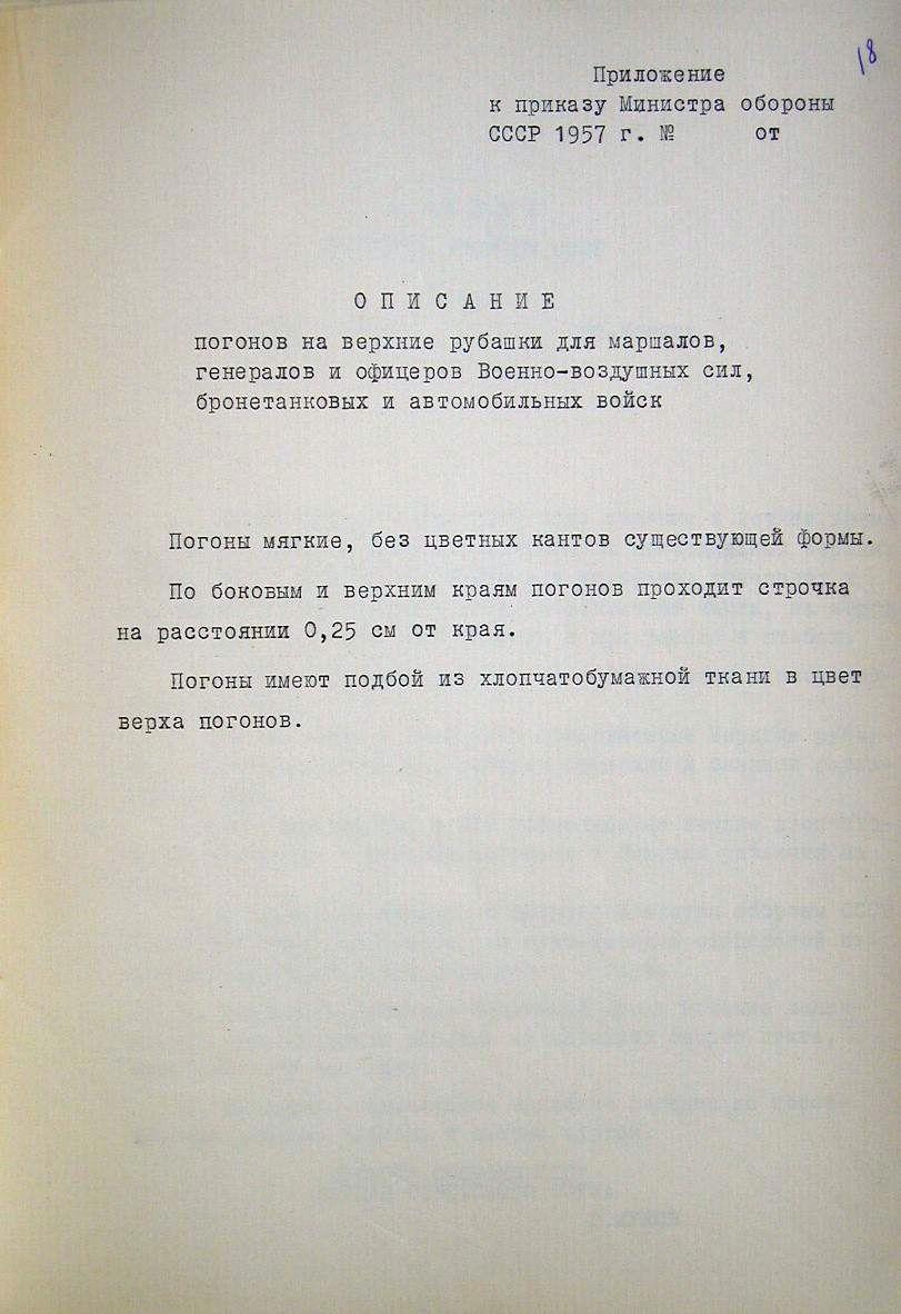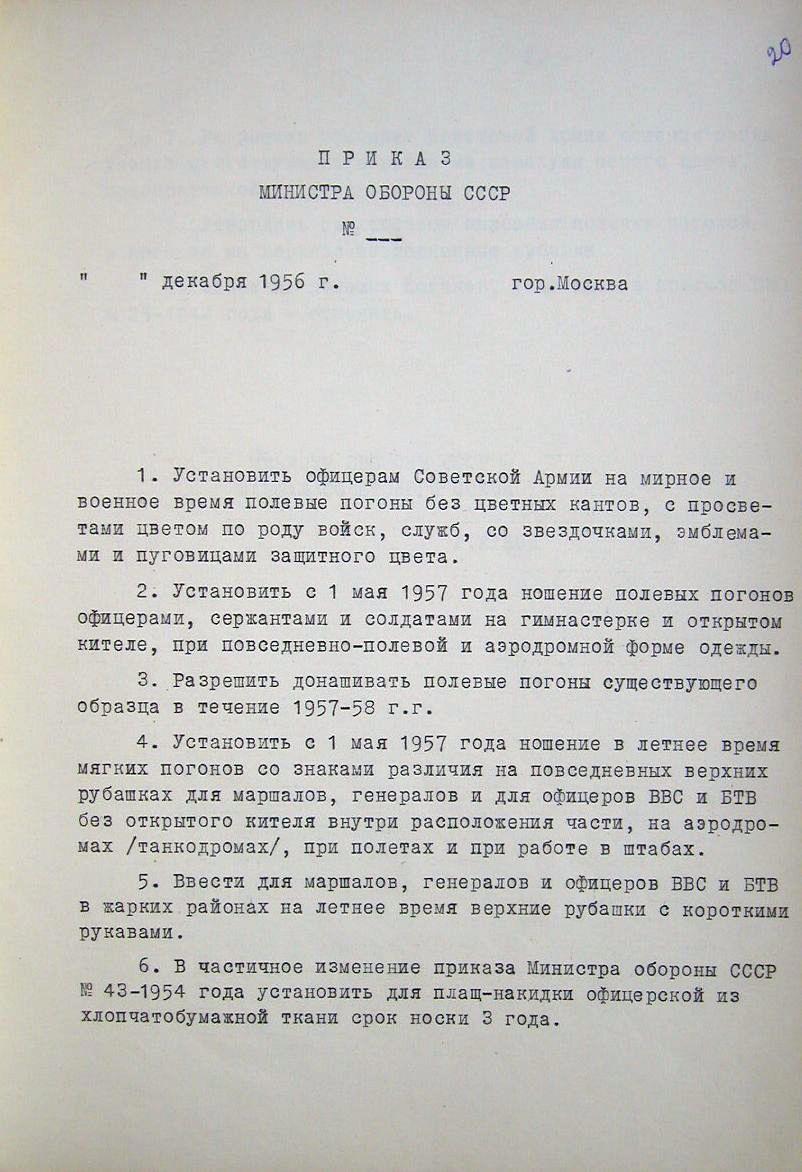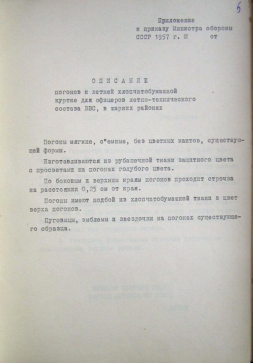 В ответ на запрос маршала авиации К.А. Вершинина и ходатайство начальника Управления вещевого снабжения МО СССР генерала Ф.Г. Тармосина о разрешении офицерам 73 Воздушной армии носить в наиболее жаркий период лета рубашку с погонами без кителя и без галстука не только в гарнизон, но и повсеместно, наложена резолюция следующего содержания: