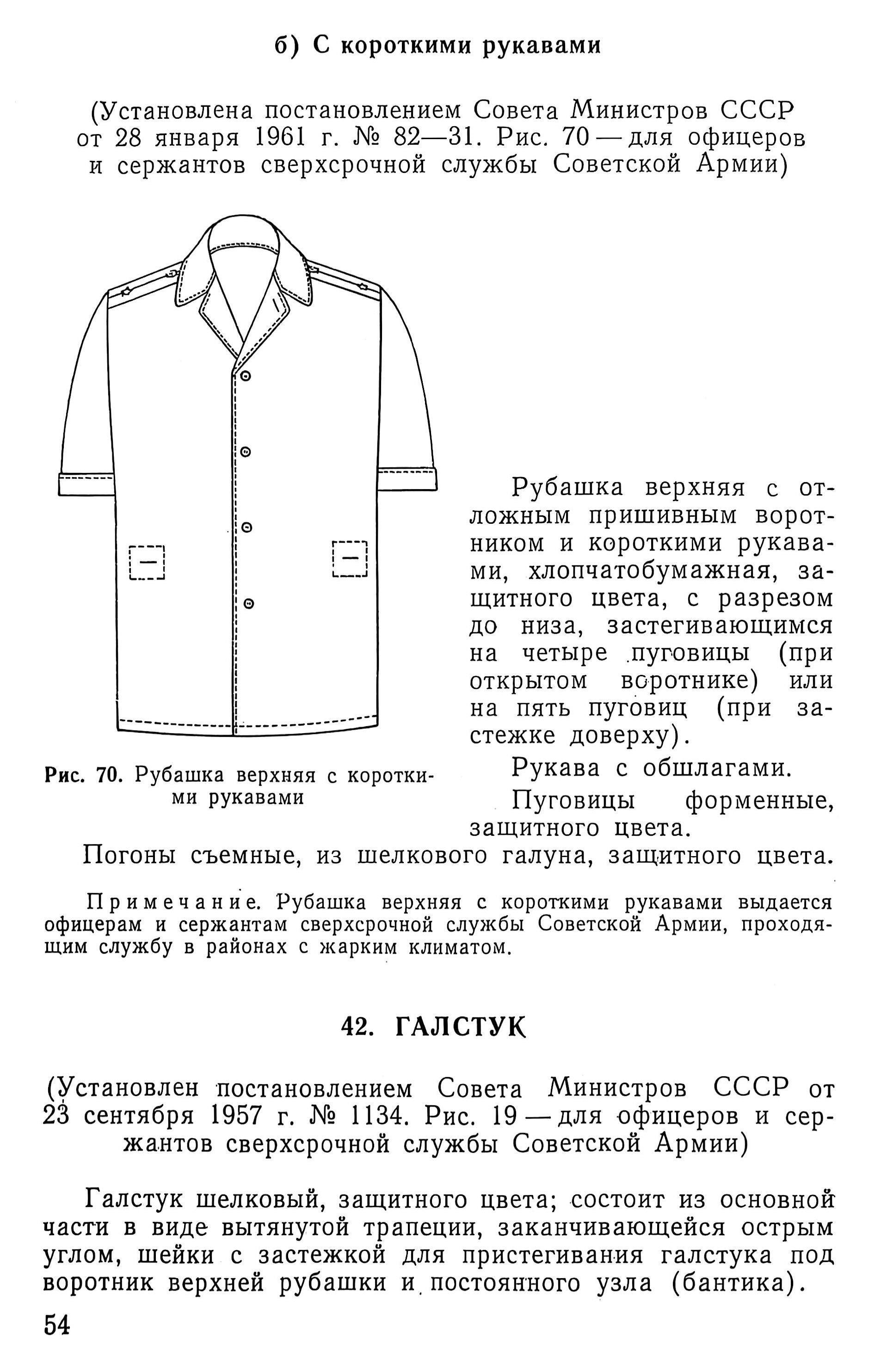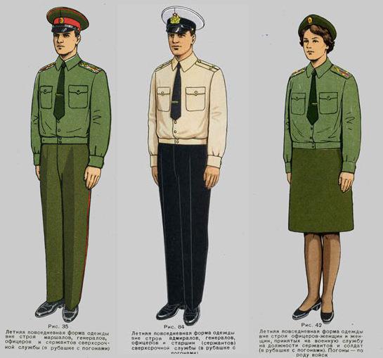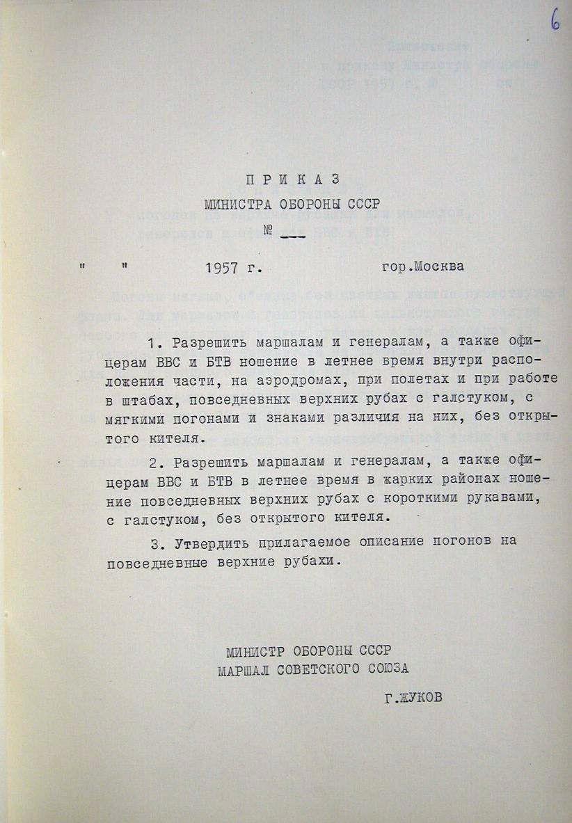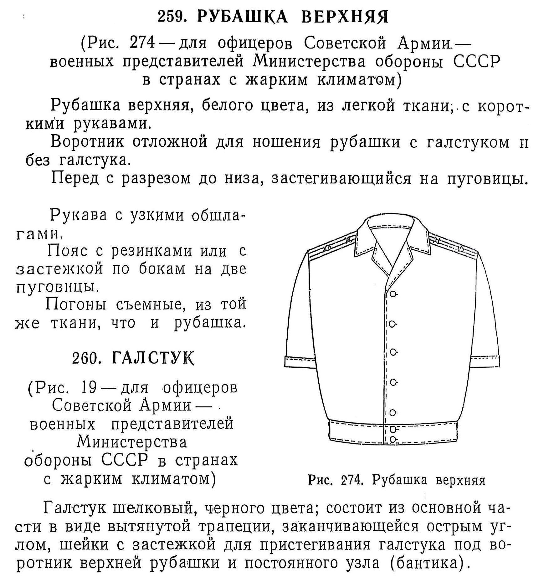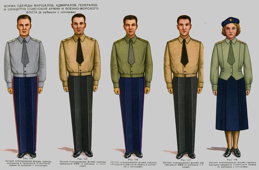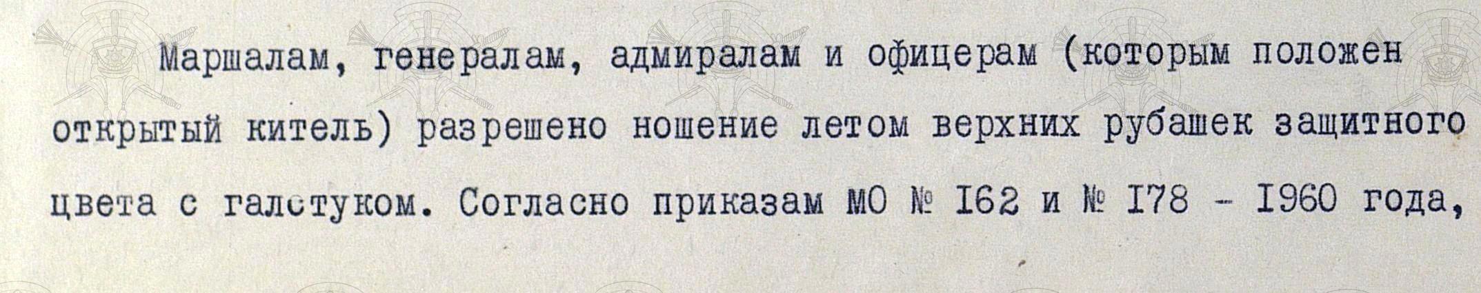 - во всех климатических районах, в летнее время, разрешить маршалам, генералам, офицерам ВВС и БТВ внутри расположения части носить рубашки с галстуком, а в жарких районах - всем перечисленным категориям военнослужащих разрешалось ношение рубашек с коротким рукавом, как с галстуком, так и без него.