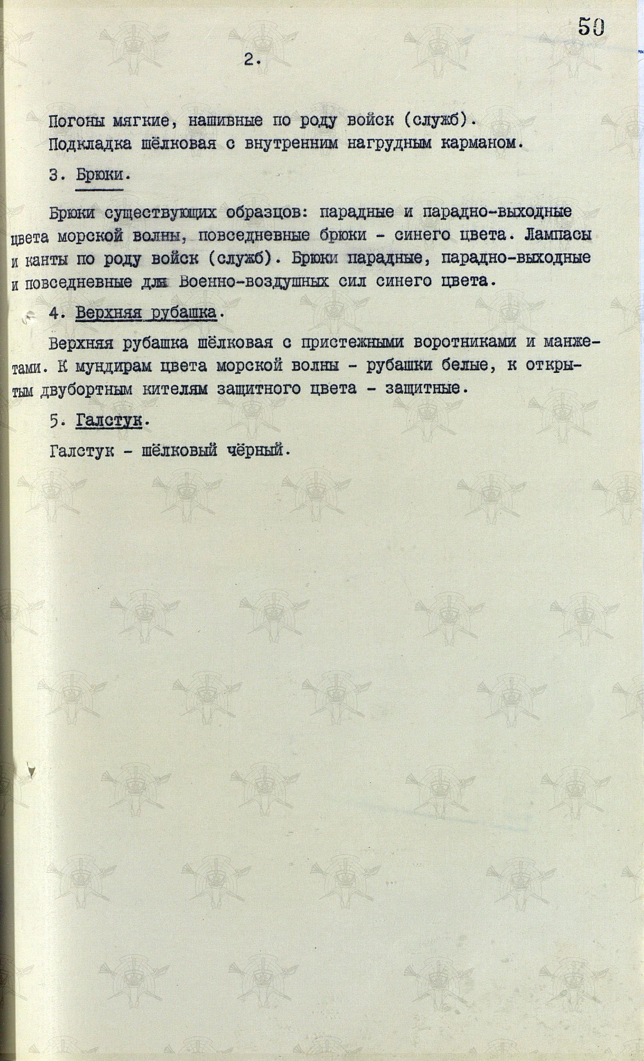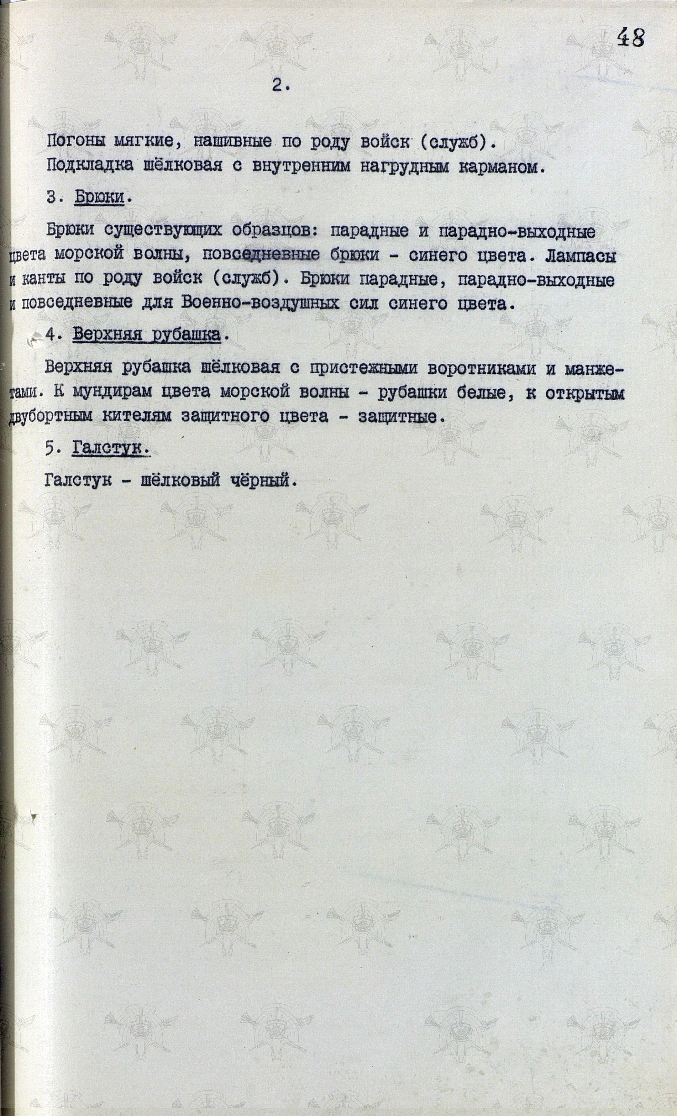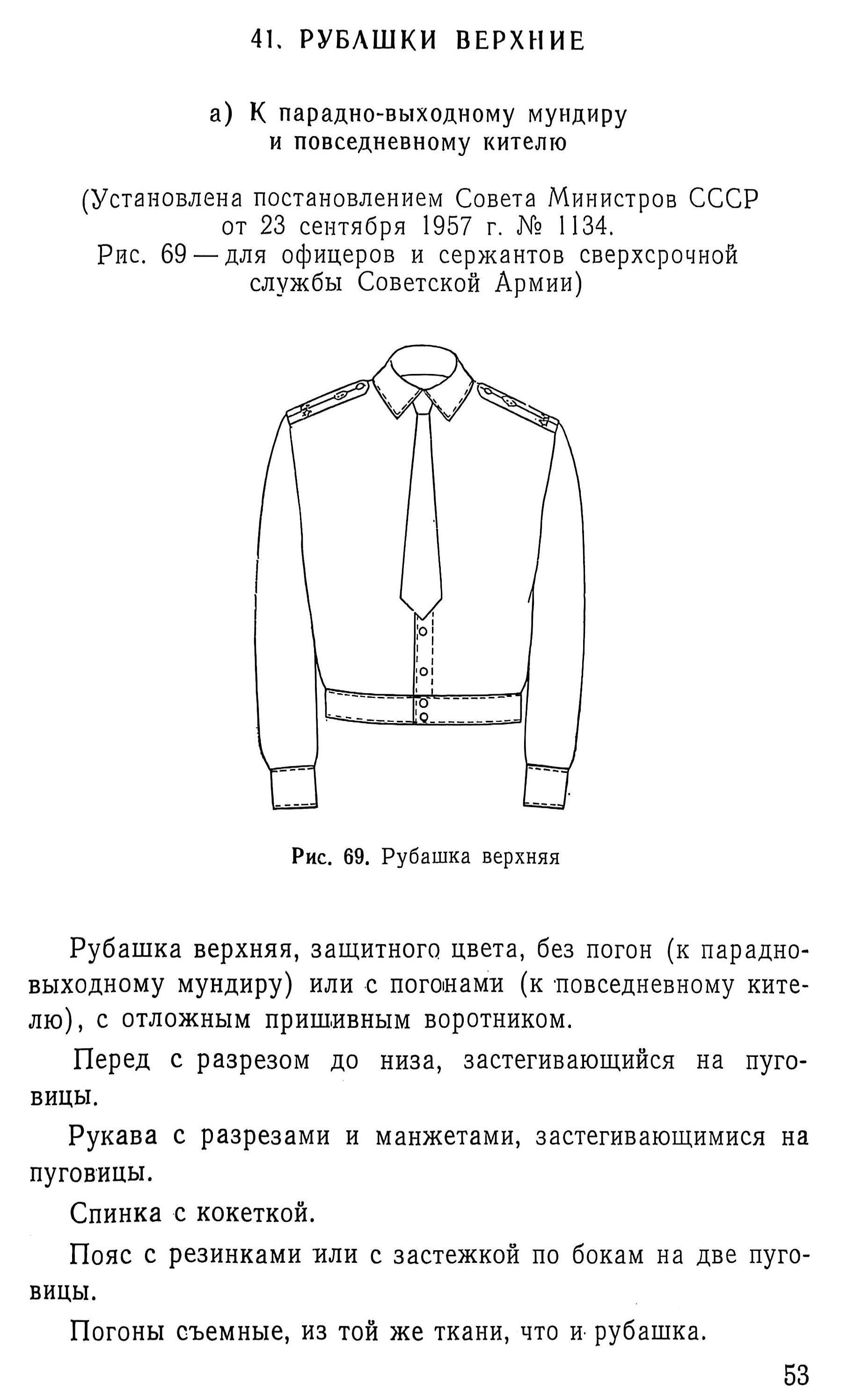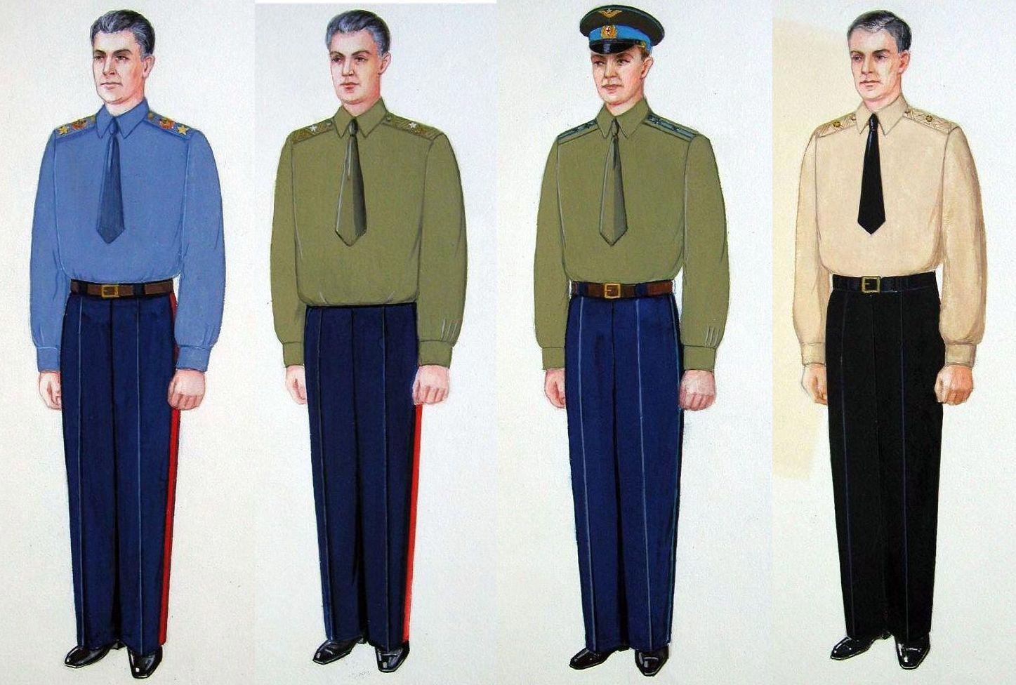 - во всех климатических районах, в летнее время, разрешить маршалам, генералам, офицерам ВВС и БТВ внутри расположения части носить рубашки с галстуком, а в жарких районах - всем перечисленным категориям военнослужащих разрешалось ношение рубашек с коротким рукавом, как с галстуком, так и без него.