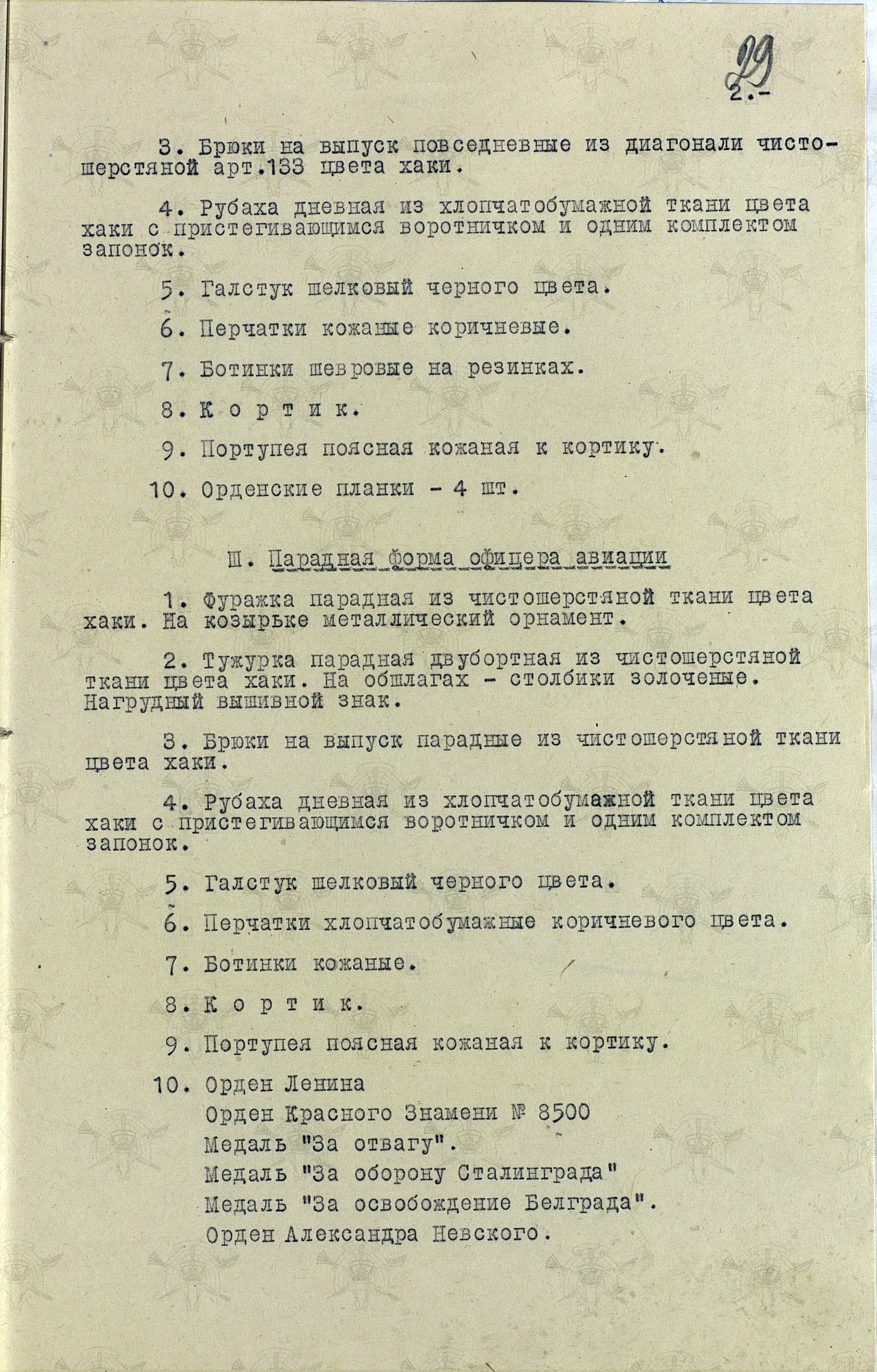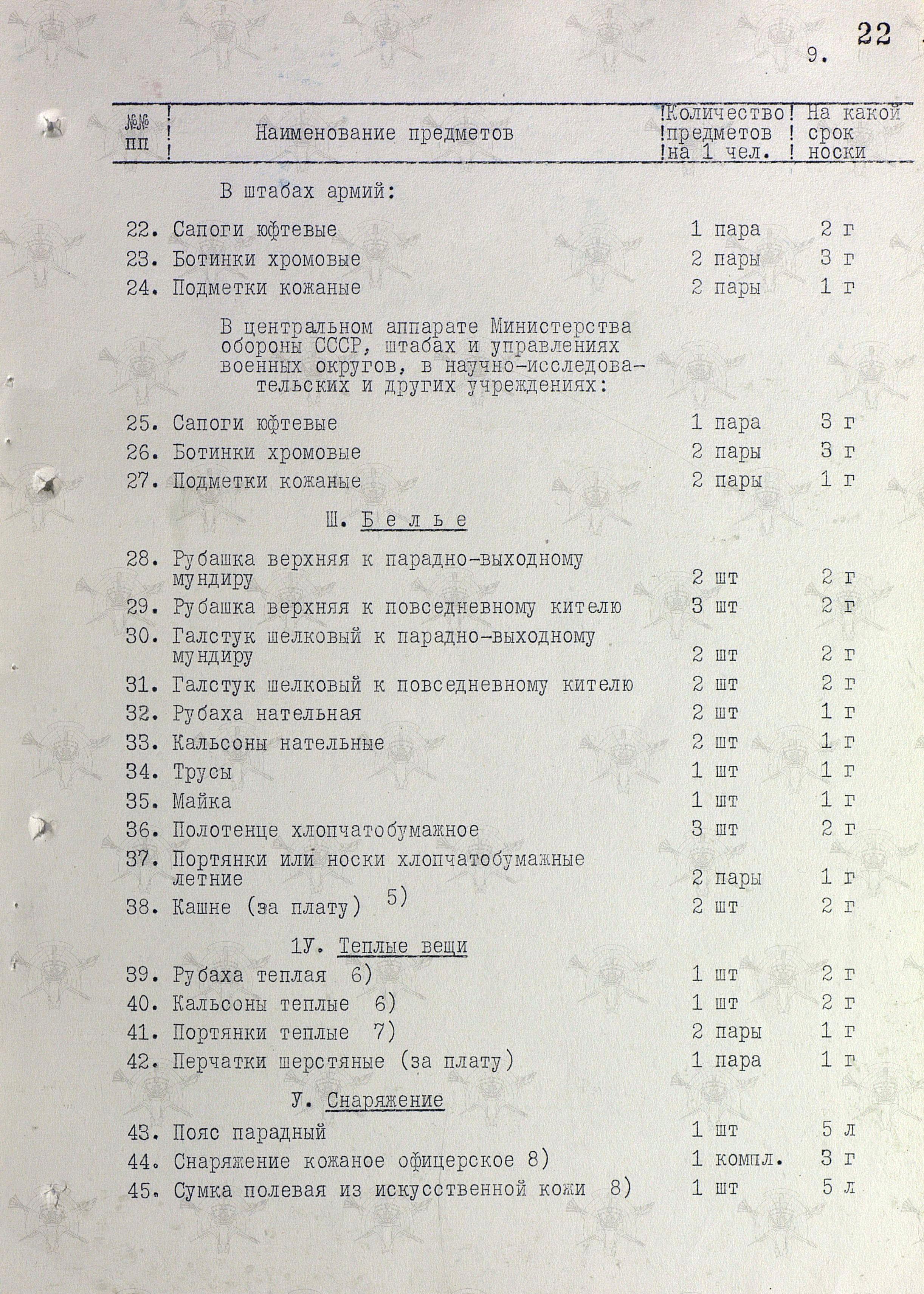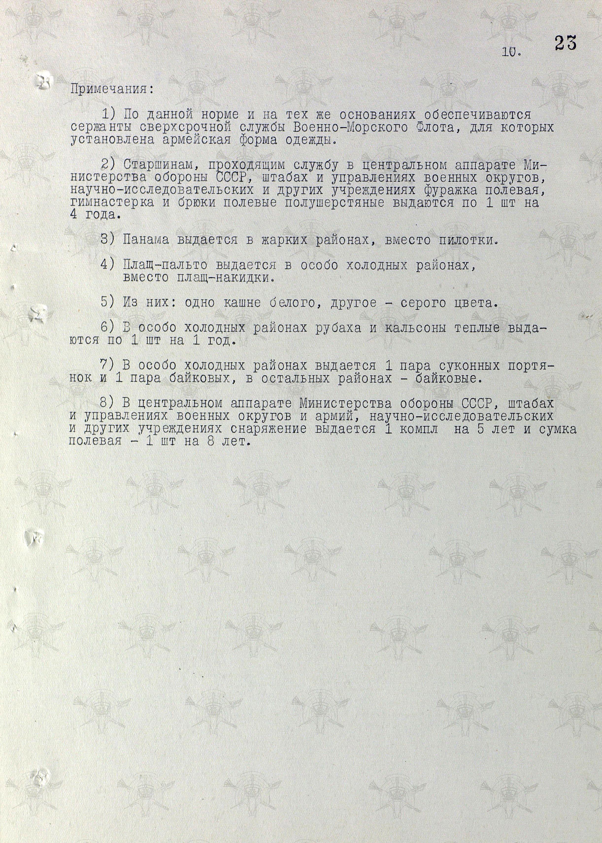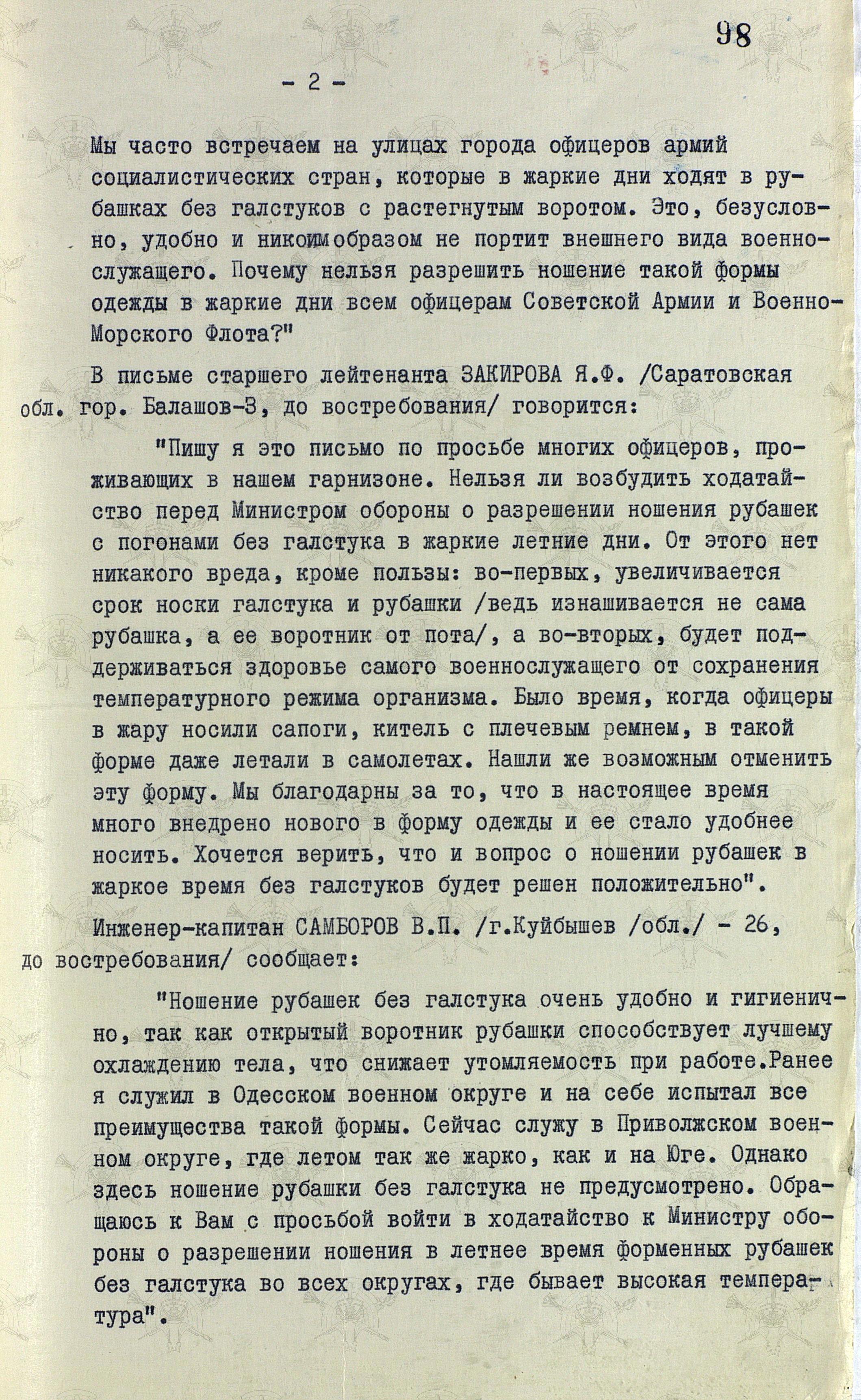 - во всех климатических районах, в летнее время, разрешить маршалам, генералам, офицерам ВВС и БТВ внутри расположения части носить рубашки с галстуком, а в жарких районах - всем перечисленным категориям военнослужащих разрешалось ношение рубашек с коротким рукавом, как с галстуком, так и без него.