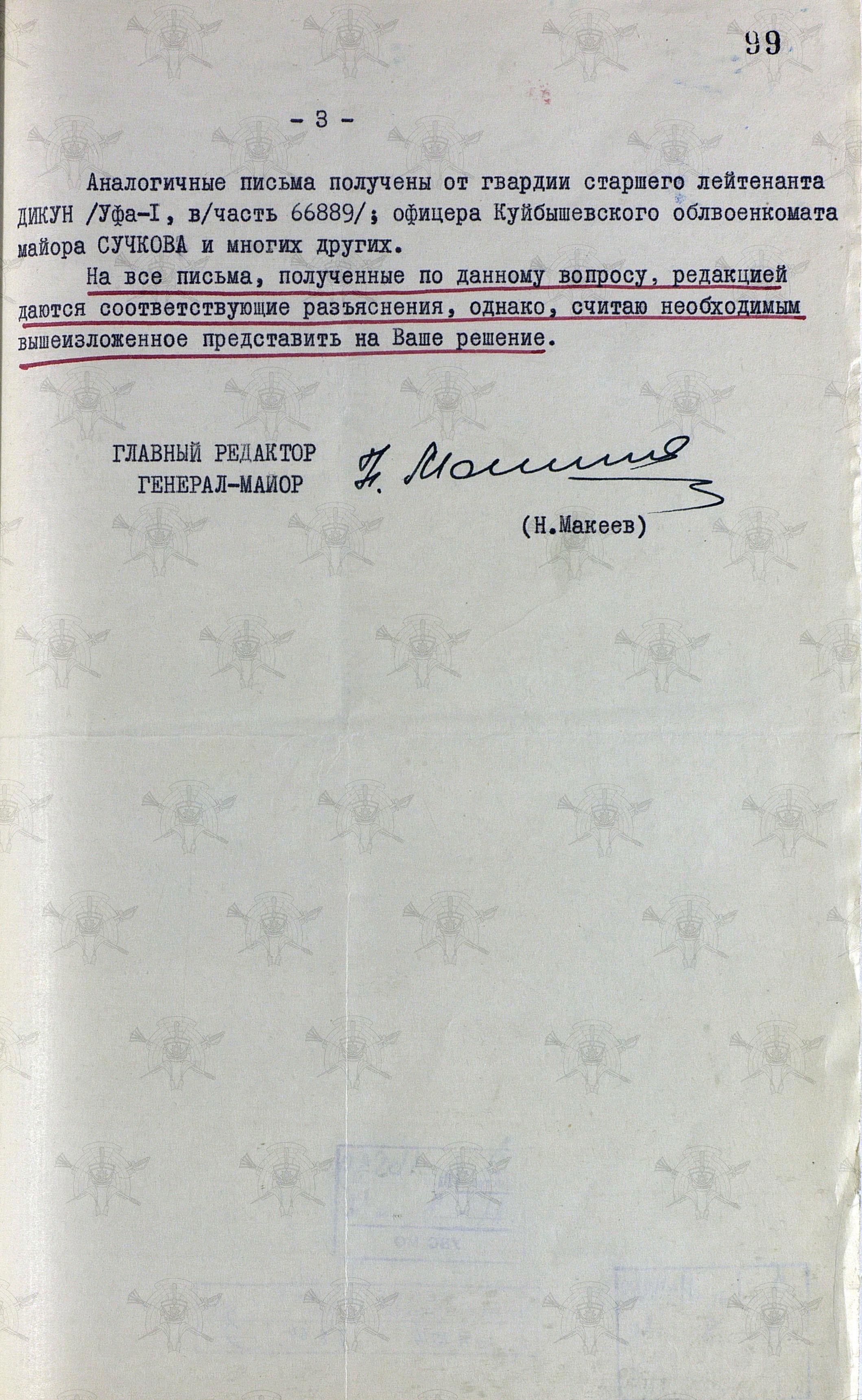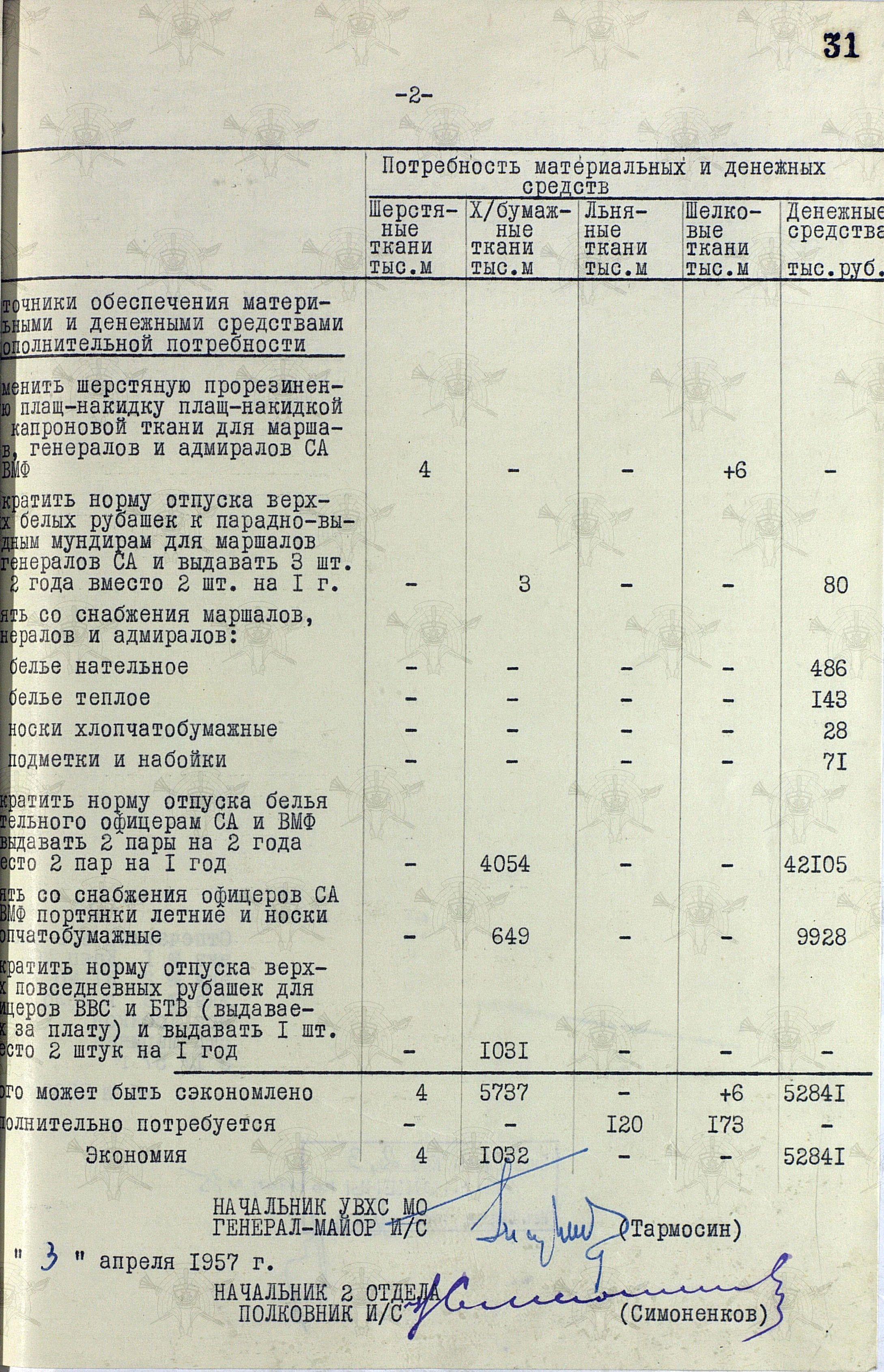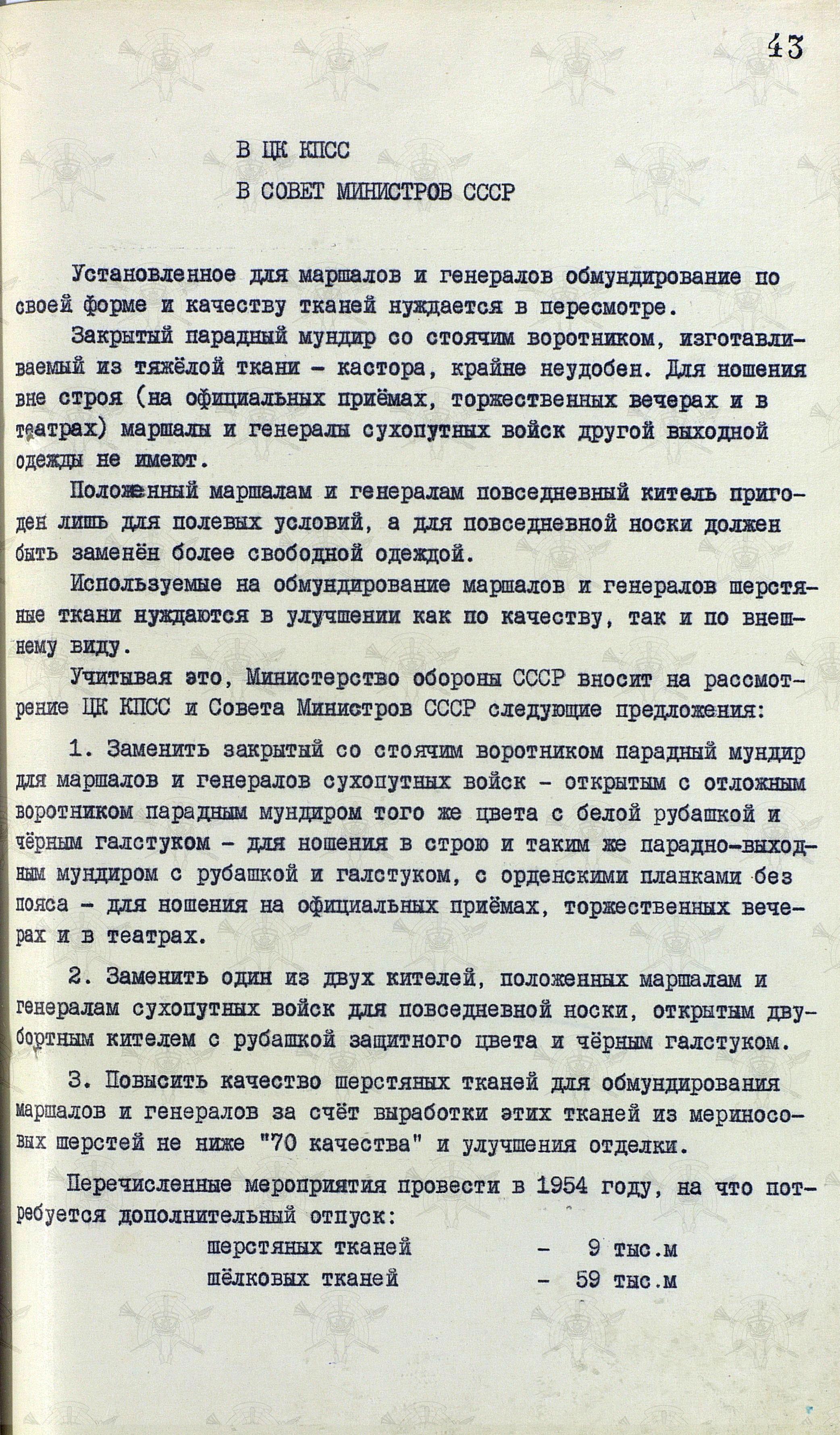 «тов. Тармосину Ф.Г. В жарких районах будут носить с лета этого года кители из материала «Весна». С Вашим предложением не согласен.