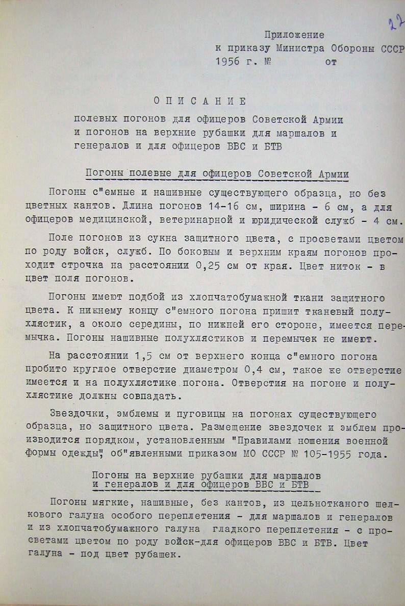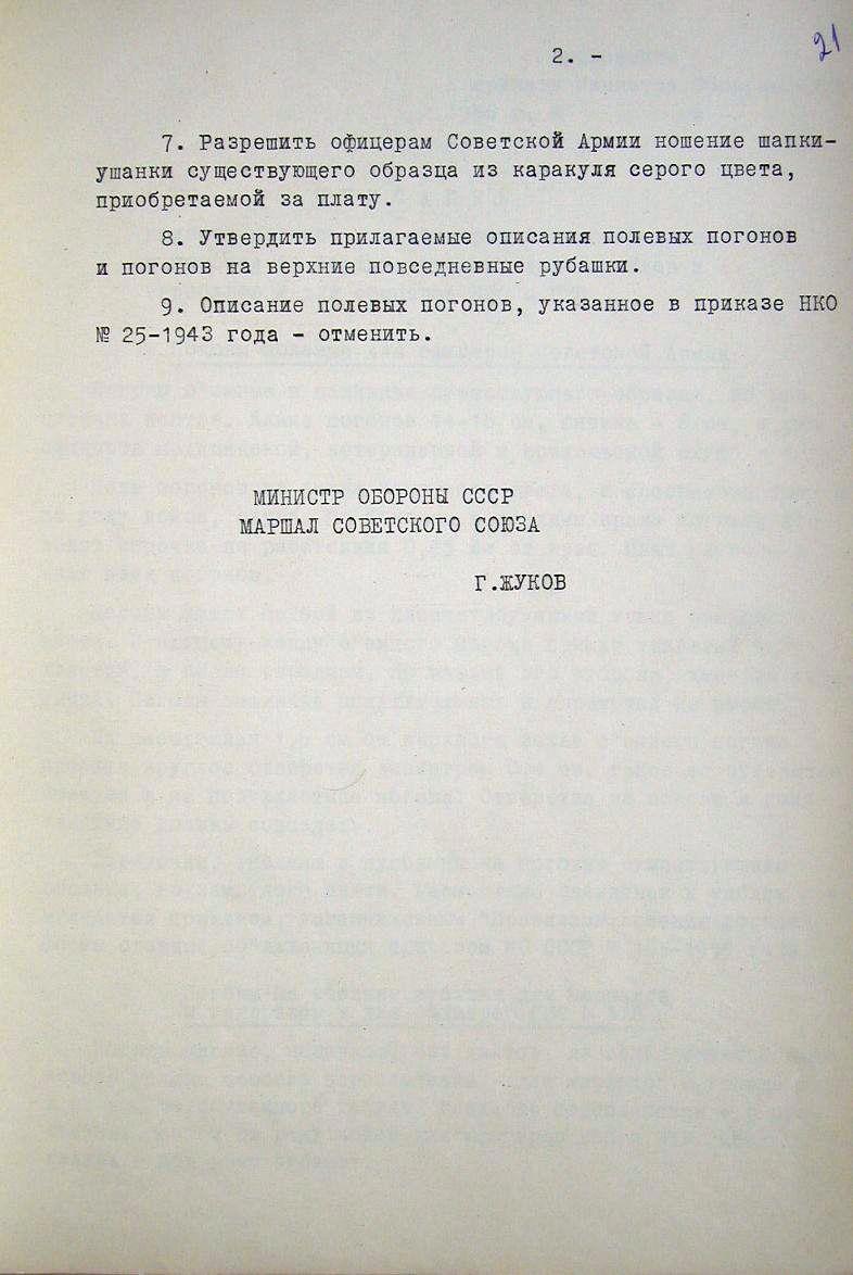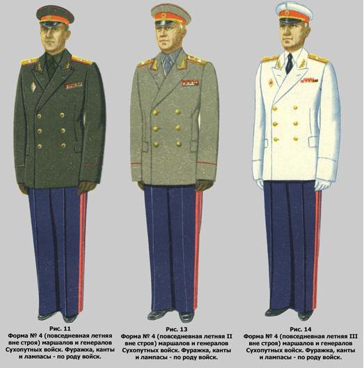 В июне 1955 г., уже новый Министр обороны СССР, маршал Советского Союза Г.К. Жуков подписывает приказ № 105 «О введении в действие Правил ношения военной формы одежды маршалами Советского Союза, адмиралами флота Советского Союза, маршалами, генералами, адмиралами и офицерами Советской Армии и Военно-Морского Флота (на мирное время)». В соответствии с ним:
