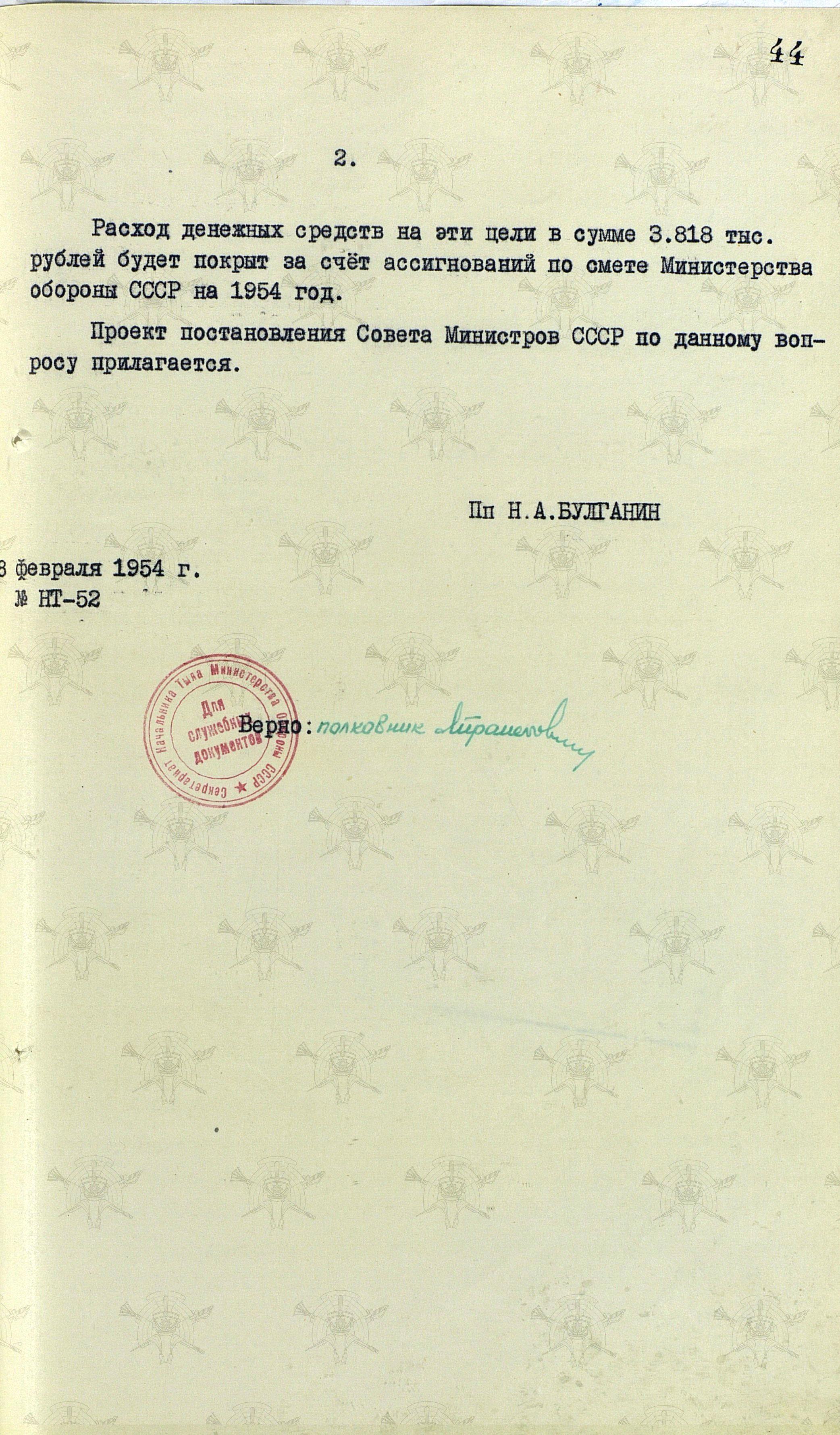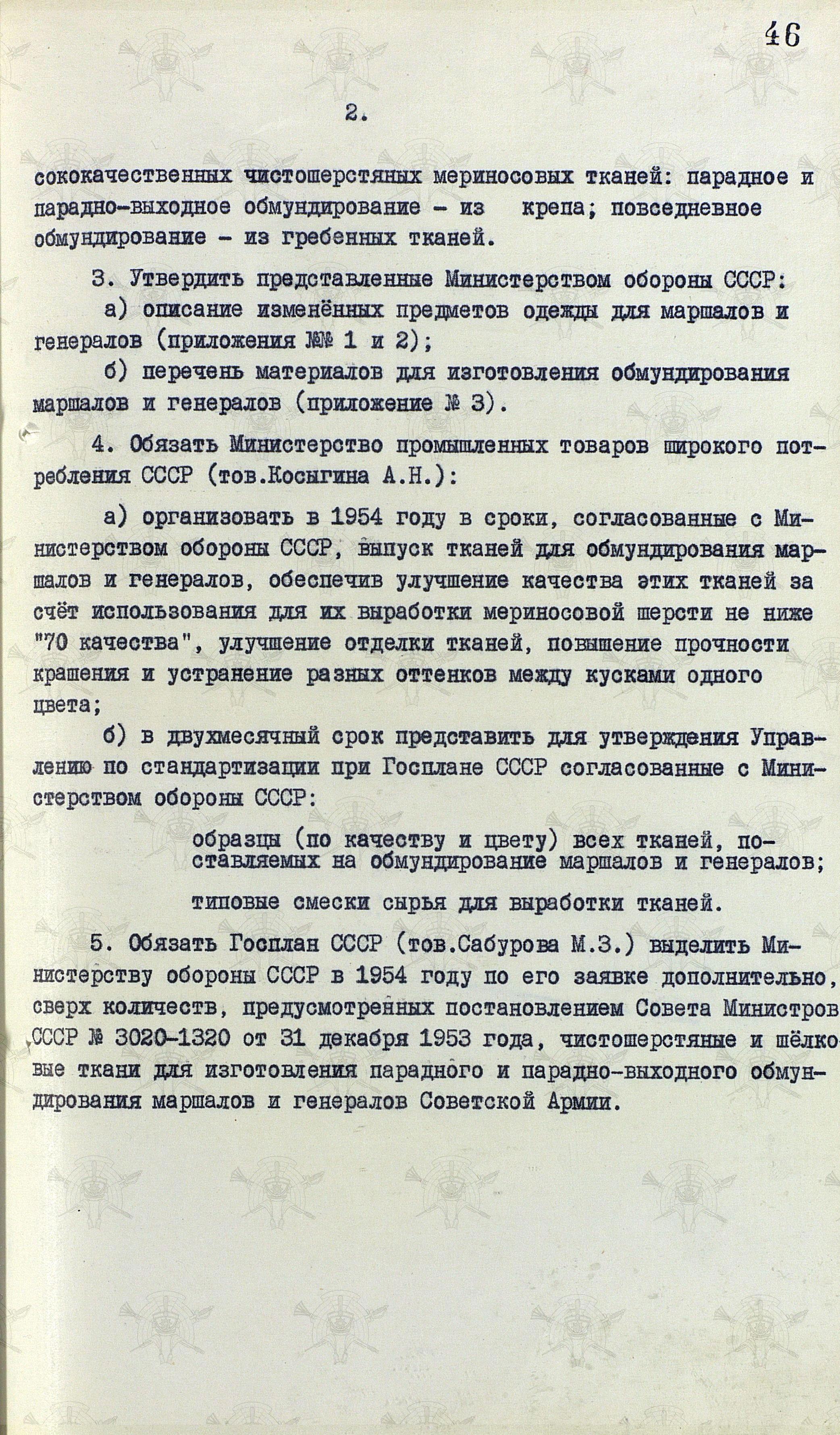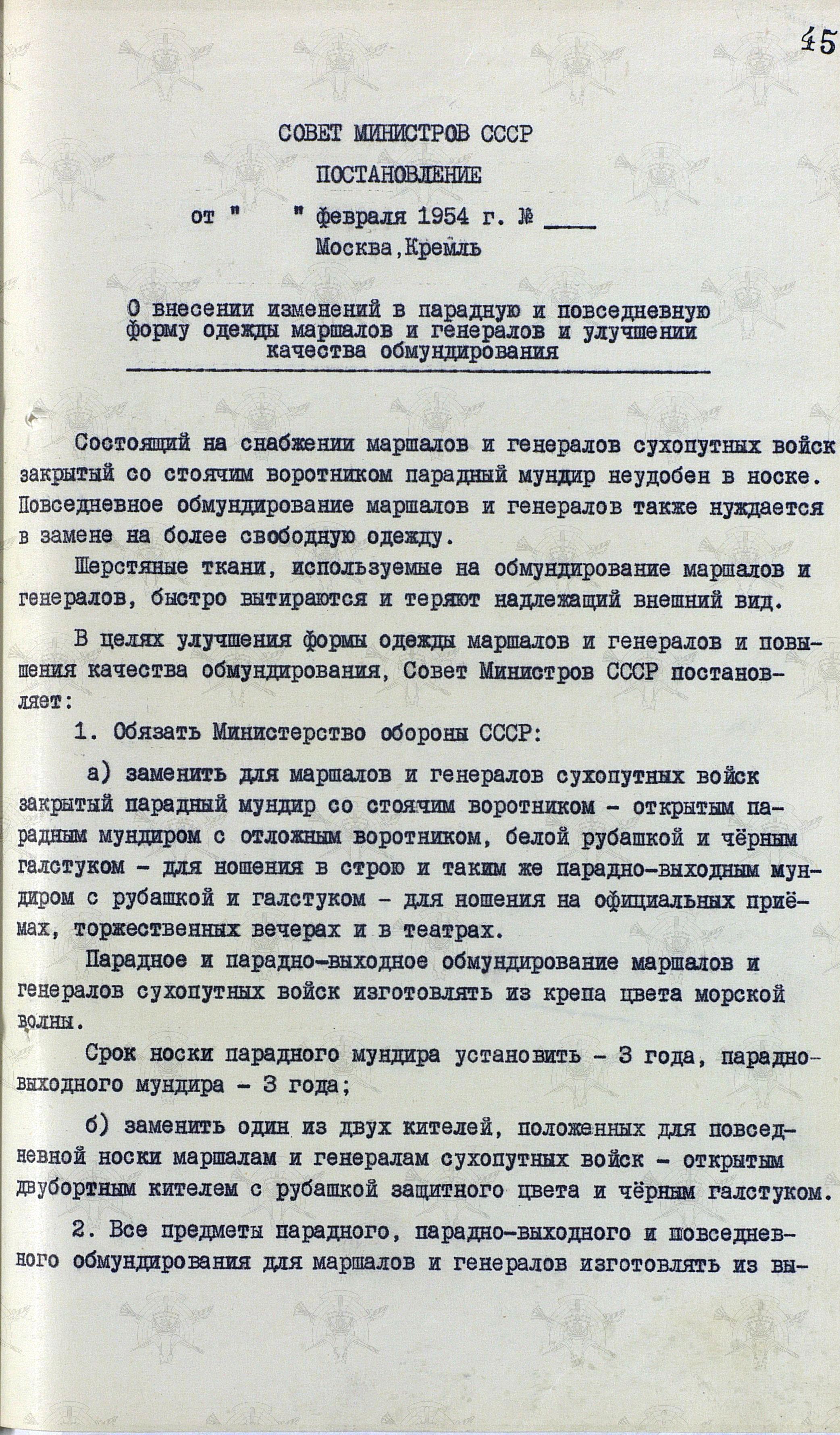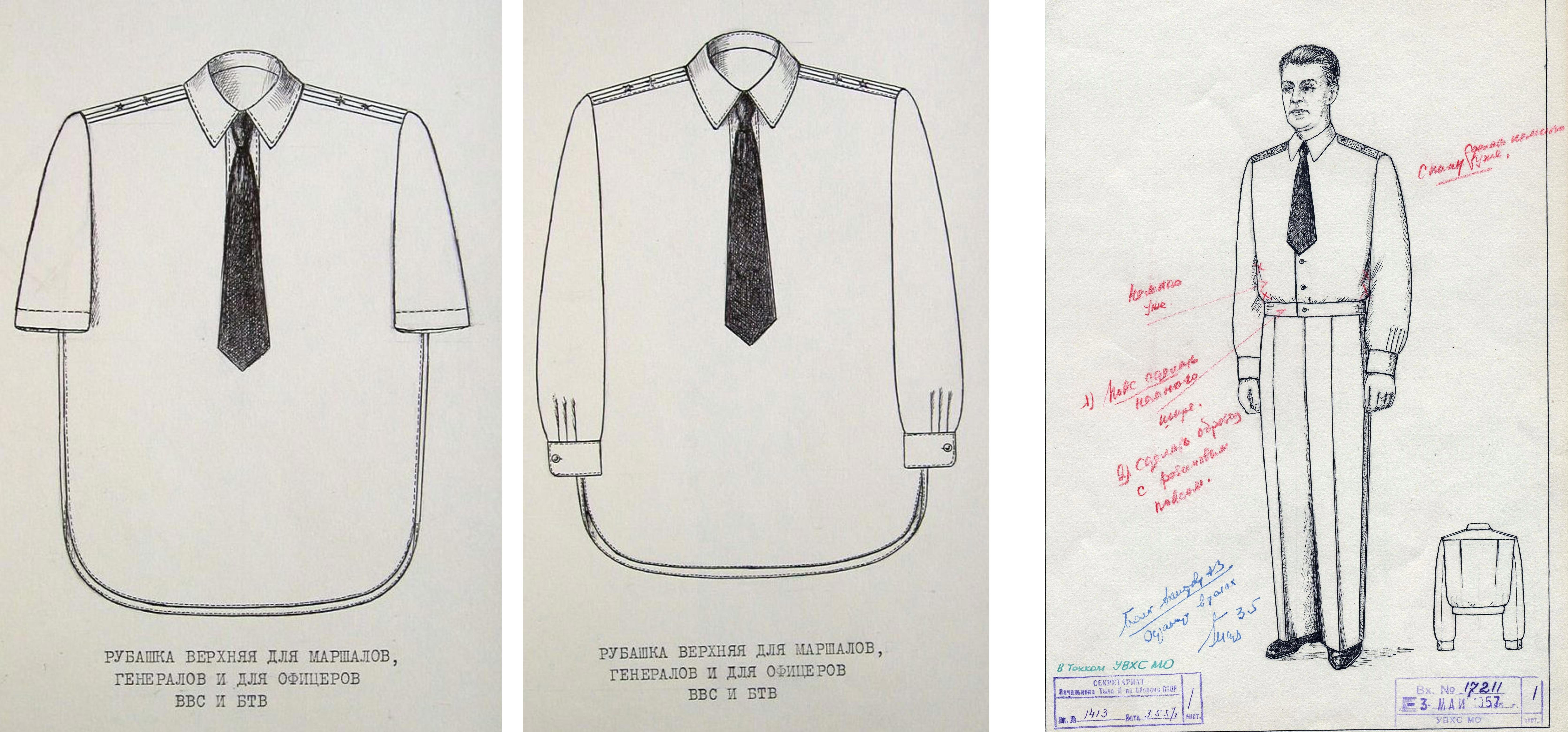 8 февраля 1954 г. секретариат Начальника тыла Минобороны СССР направляет в адрес министра обороны СССР Н.А. Булганина очередной проект обращения в ЦК КПСС с приложением проекта постановления Совмина СССР «О внесении изменений в парадную и повседневную форму одежды маршалов и генералов и улучшении качества обмундирования». Среди прочих нововведений, предлагалось обеспечить высших офицеров рубашками двух цветов: белой и защитной.
