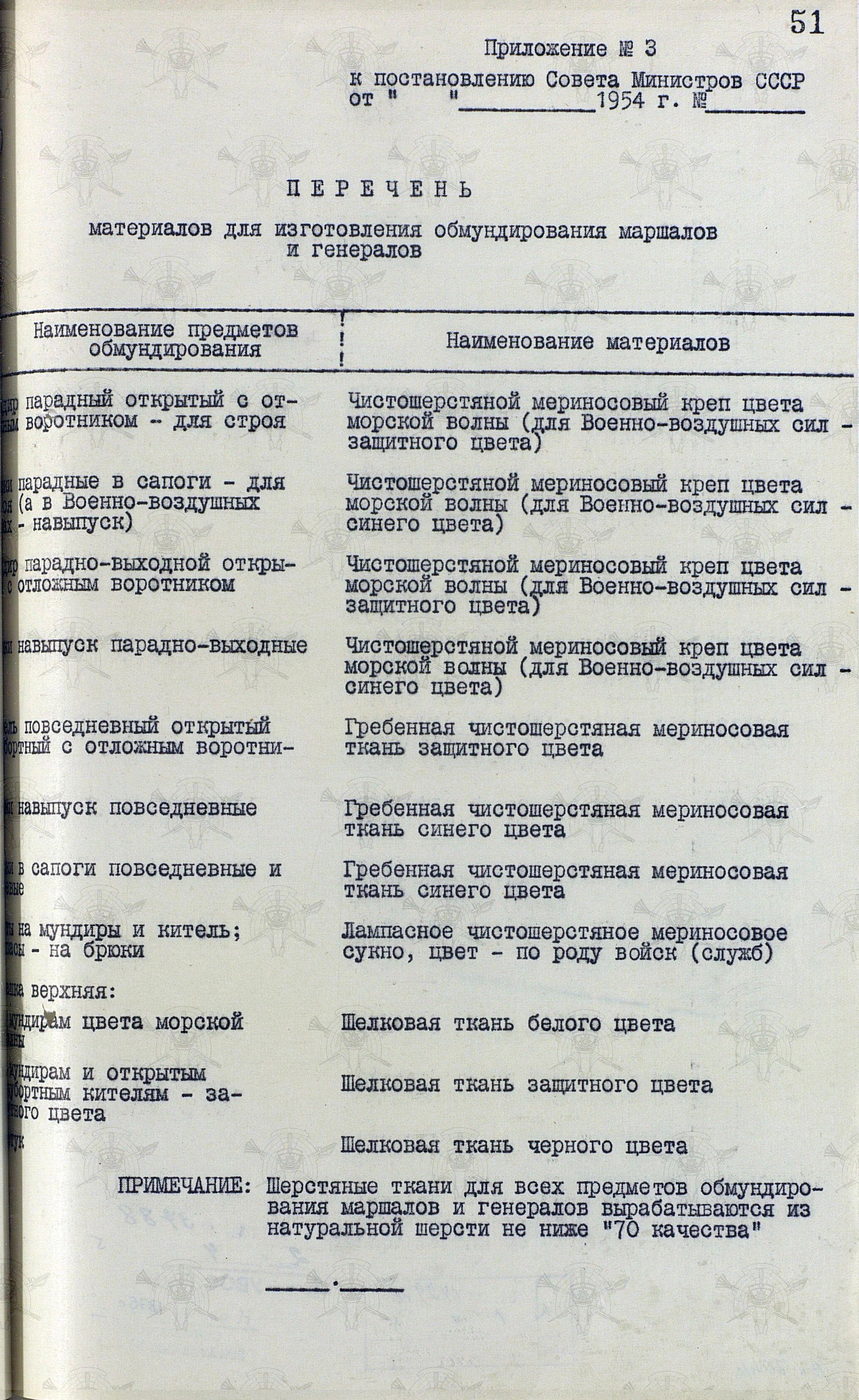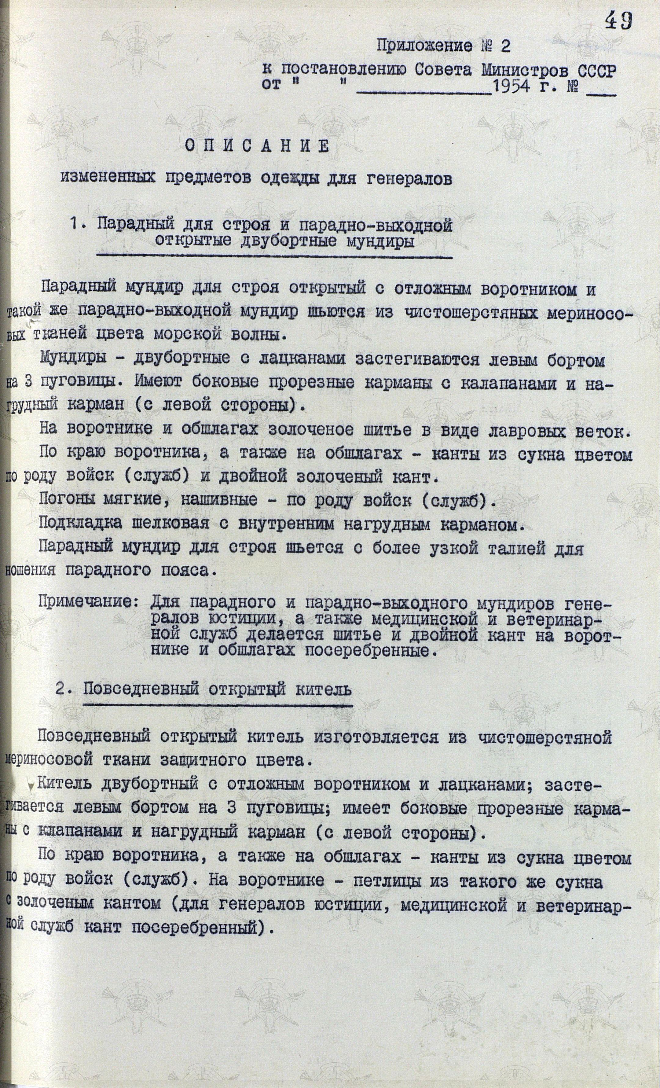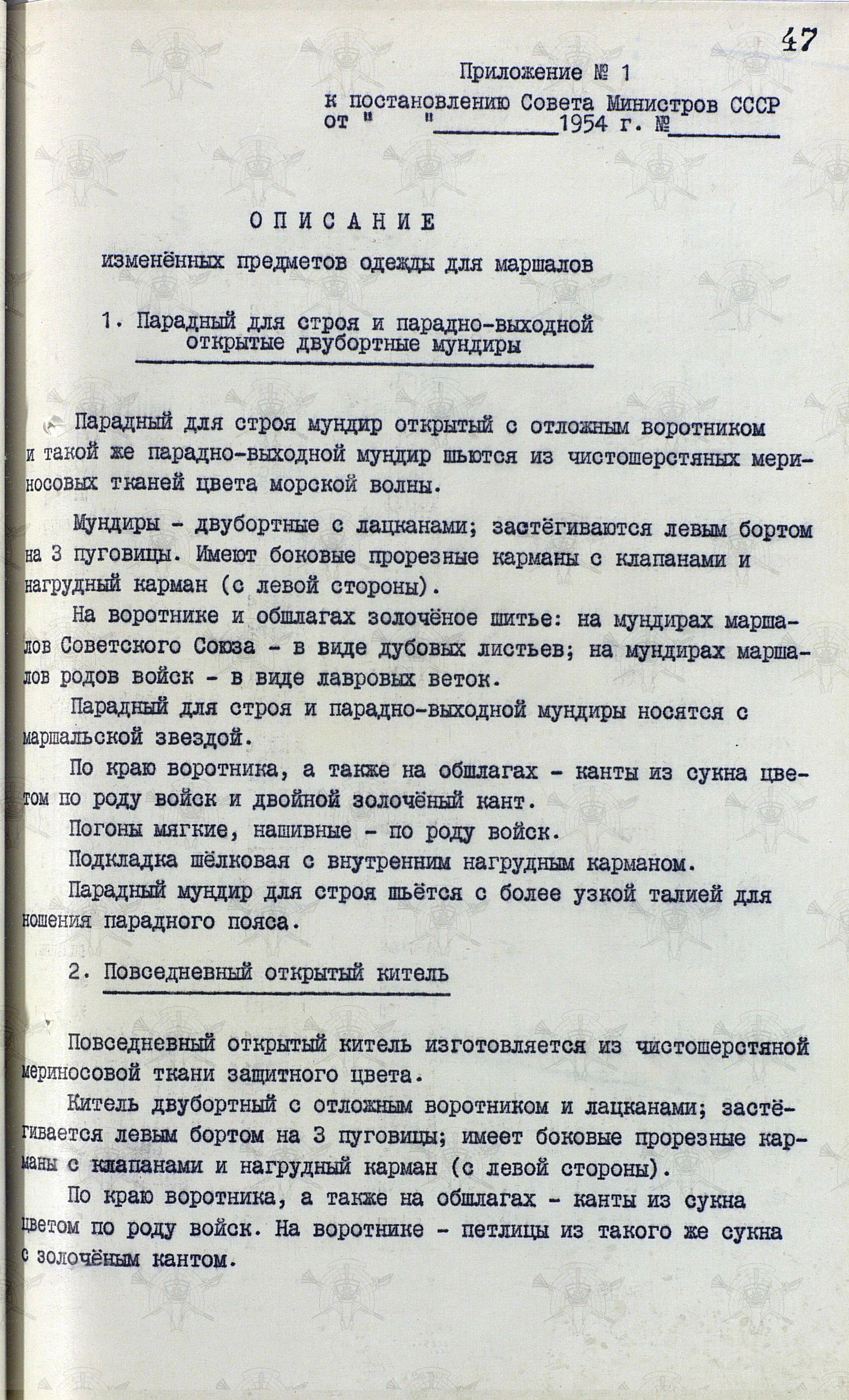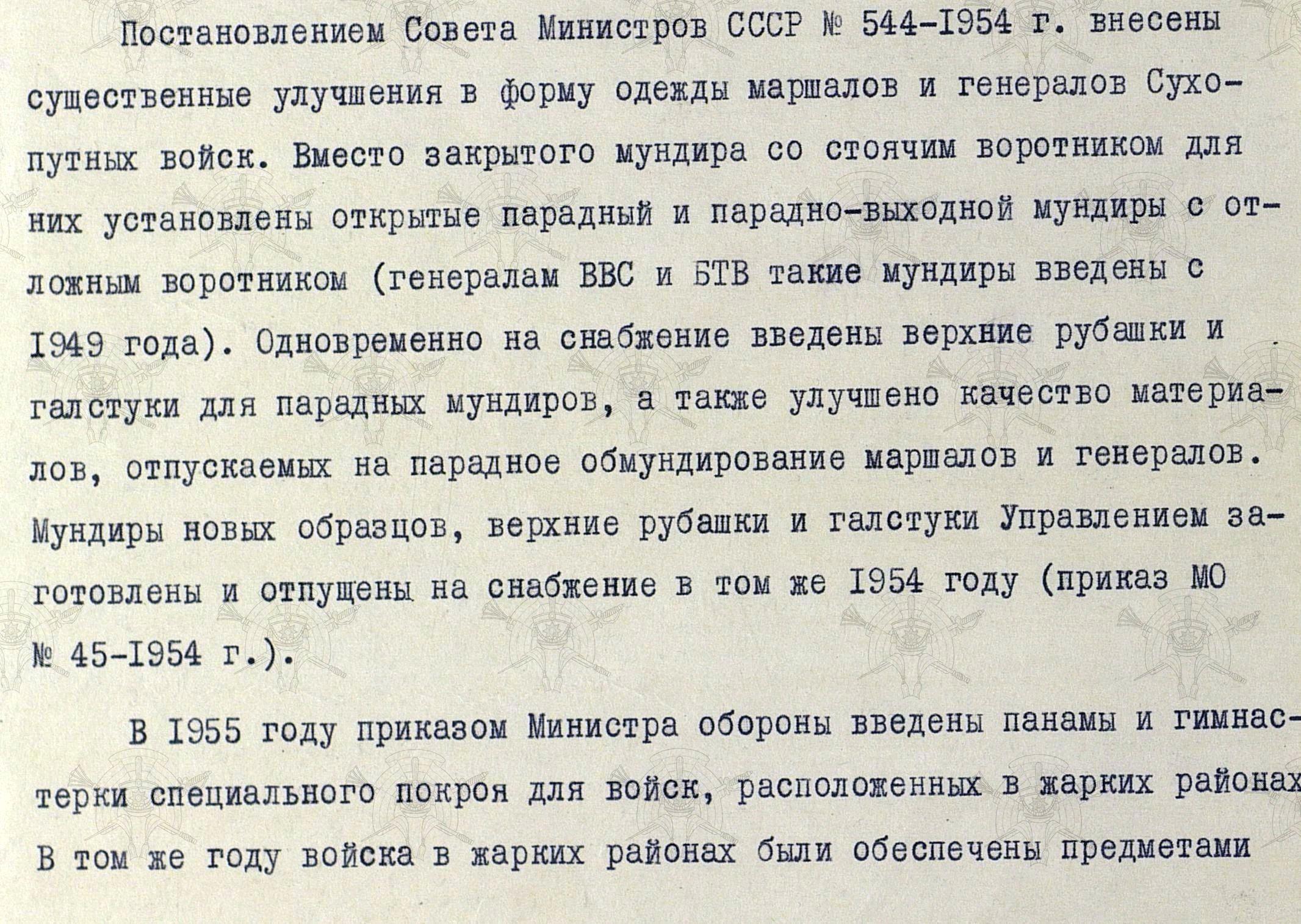 Изменения в парадное и парадно-выходное обмундирование маршалов и генералов Сухопутных войск были утверждены постановлением Совмина СССР 1954 г. № 544.