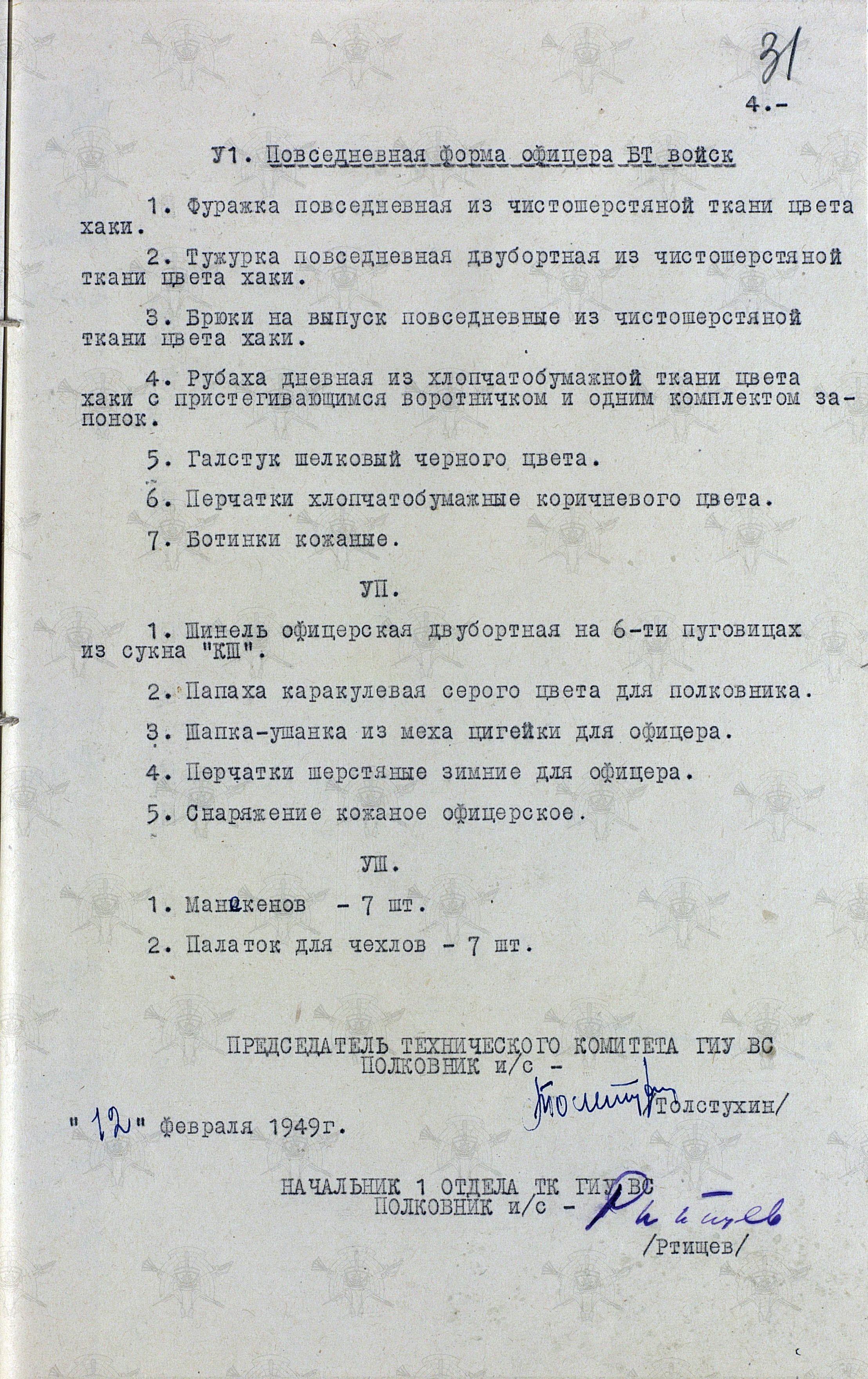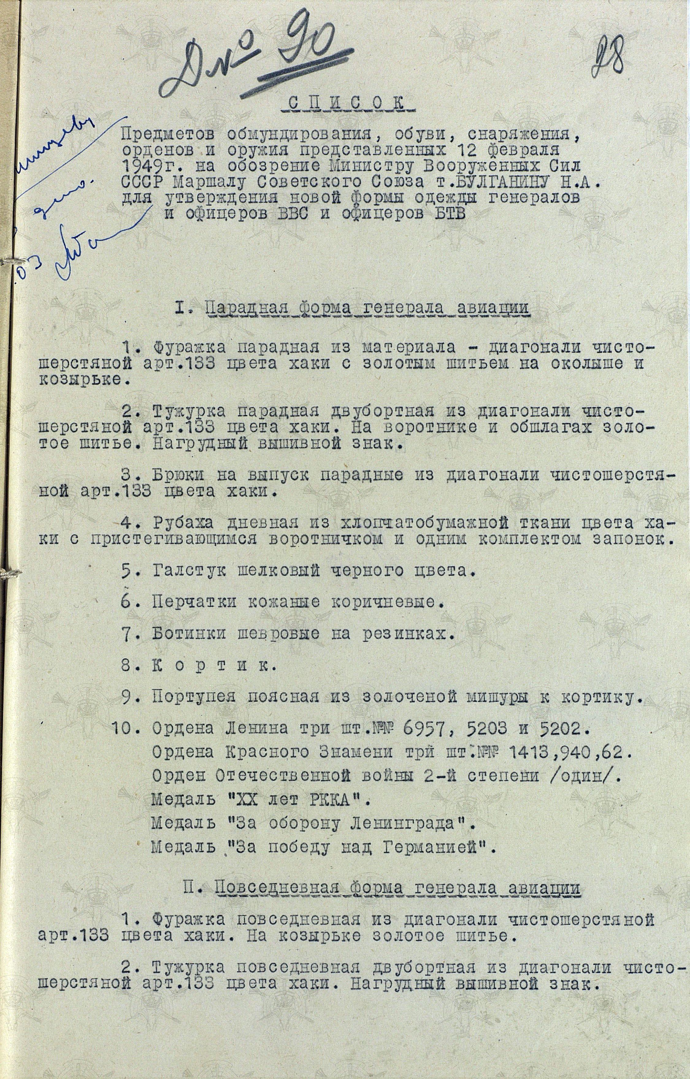 Первое, документально подтверждённое свидетельство факта разработки и попытки утверждения новой формы одежды для генералов и офицеров ВВС и БТВ, нашлось в делах аж 1949 года. 12 февраля состоялся показ новых разработок обмундирования, обуви и снаряжения на обозрение Министру Вооруженных Сил СССР Маршалу Советского Союза Н.А. Булганину. Среди предметов, предлагаемых Техническим комитетом ГИУ ВС СССР в качестве парадного и повседневного обмундирования генералам и офицерам ВВС и БТВ значится «рубаха дневная из хлопчатобумажной ткани цвета хаки с пристегивающимся воротничком и одним комплектом запонок», а также «галстук шелковый черного цвета».