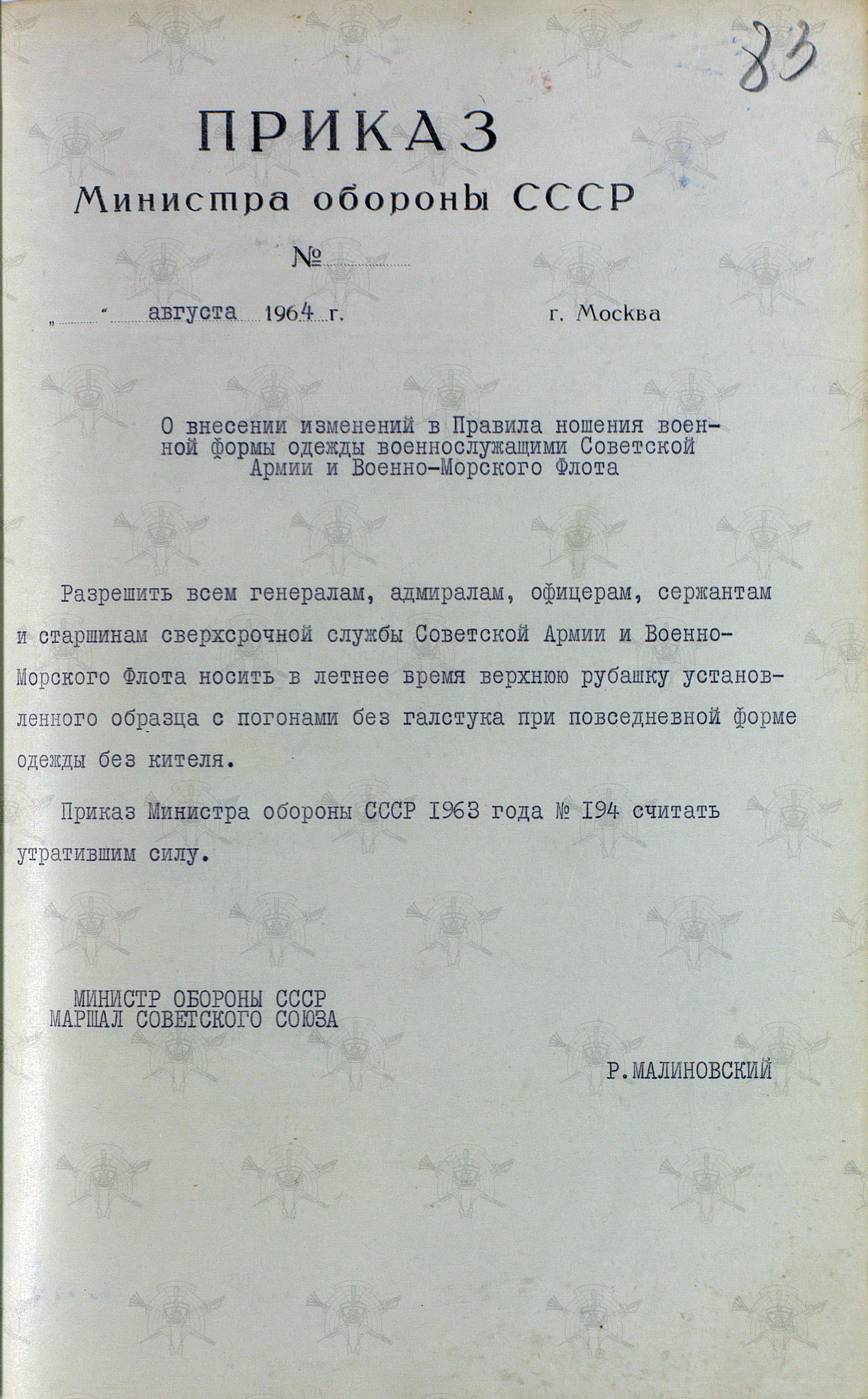 В 1963 г. ещё два. Первым приказом МО СССР, № 160, генералам, адмиралам, офицерам и сверхсрочнослужащим в войсках, расположенных в жарких районах, разрешается носить рубашку без галстука. Приказом от 13.08.1963 г. № 194 разрешение на ношение рубашек без галстука распространяется и на некоторые районы с умеренным климатом. К сожалению, копий этих приказов мне найти не удалось.