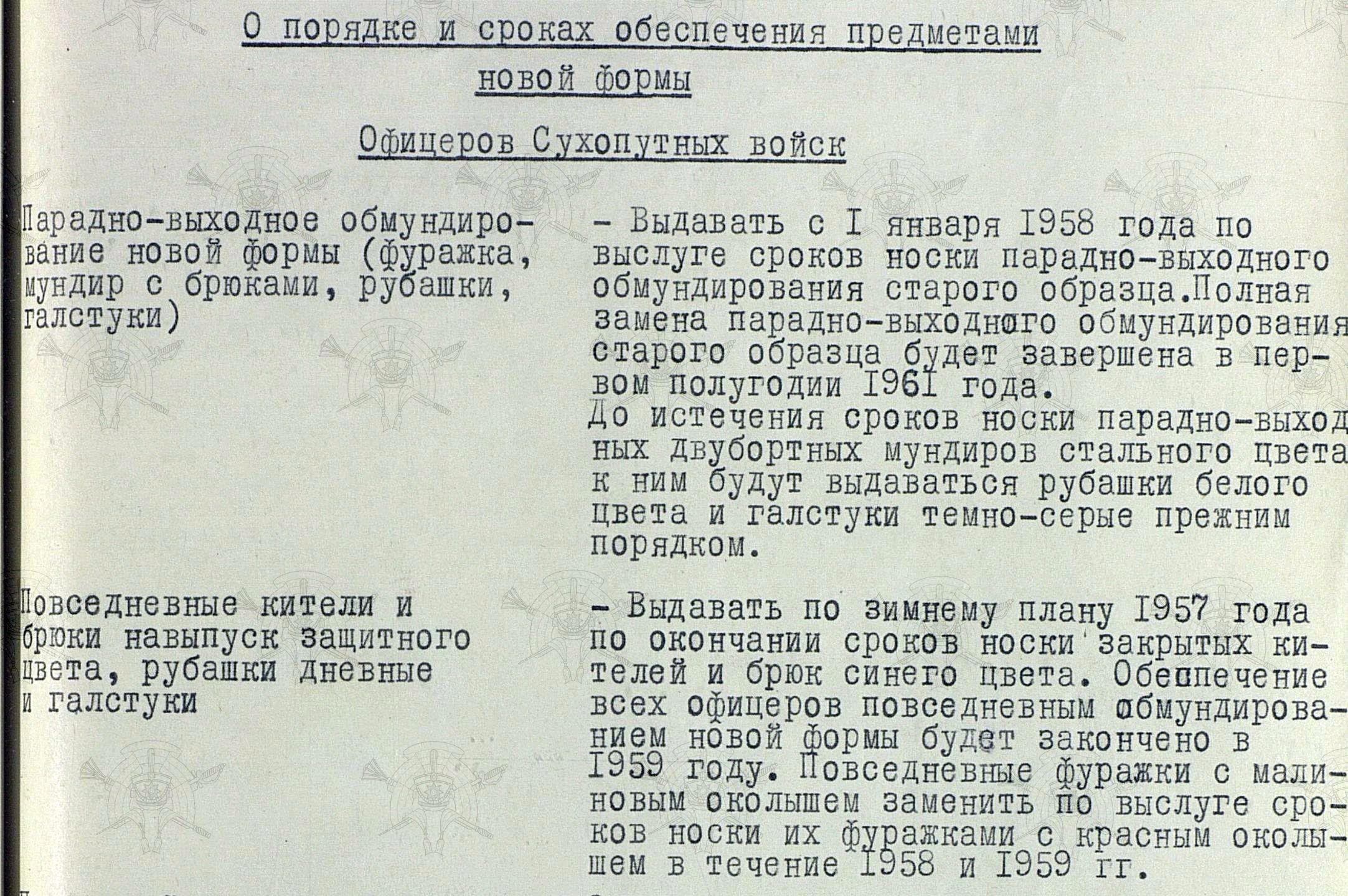 Указом Президиума Верховного Совета СССР от 26 марта 1958 г. и постановлениями Совмина СССР от 23.09.157 г. № 1134 и от 8.03. 1958 г. № 267 введено улучшение и унификация формы одежды военнослужащих Вооруженных Сил СССР. Эти изменения и новые правила ношения военной формы были объявлены приказом Министра обороны СССР маршала Советского Союза Р.Я. Малиновского от 29.03. 1958 г. № 70.