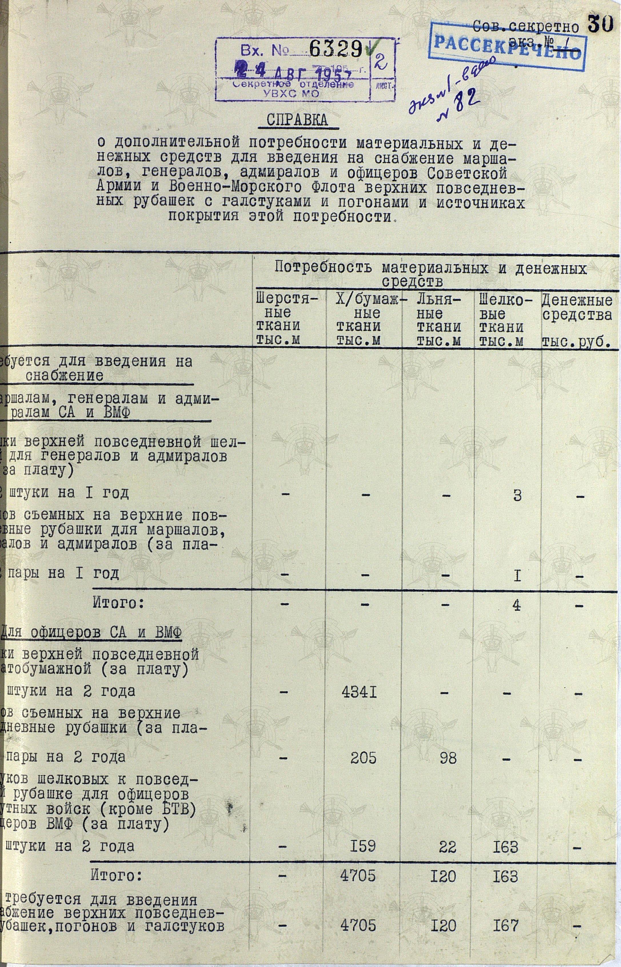 В августе 1957 г., специалистами вещевой службы был сделан расчёт потребности материальных и денежных средств, необходимых для введения на снабжение генералов, адмиралов и офицеров рубашек с галстуками и погонами.