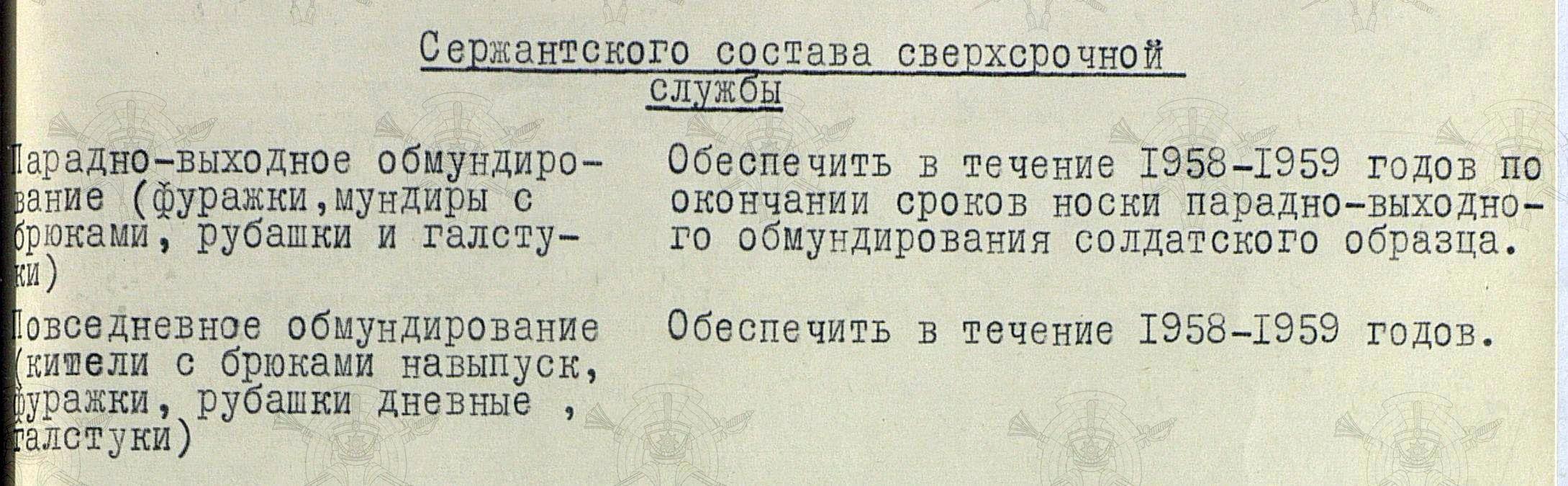 В ноябре 1958 года, издаётся постановление Совмина СССР № 1230-592 о введении с января 1959 г. новых норм снабжения военнослужащих Советской Армии и ВМФ. Они объявляются и приказом МО СССР от 02.02. 1959 г. № 51 «Положение о снабжении вещевым имуществом Советской Армии и Военно-Морского Флота». В этих нормах есть рубашка с галстуком, для отдельных категорий военнослужащих, за исключением курсантов, солдат и ефрейторов сверхсрочной службы, и, конечно же, военнослужащих срочной службы.