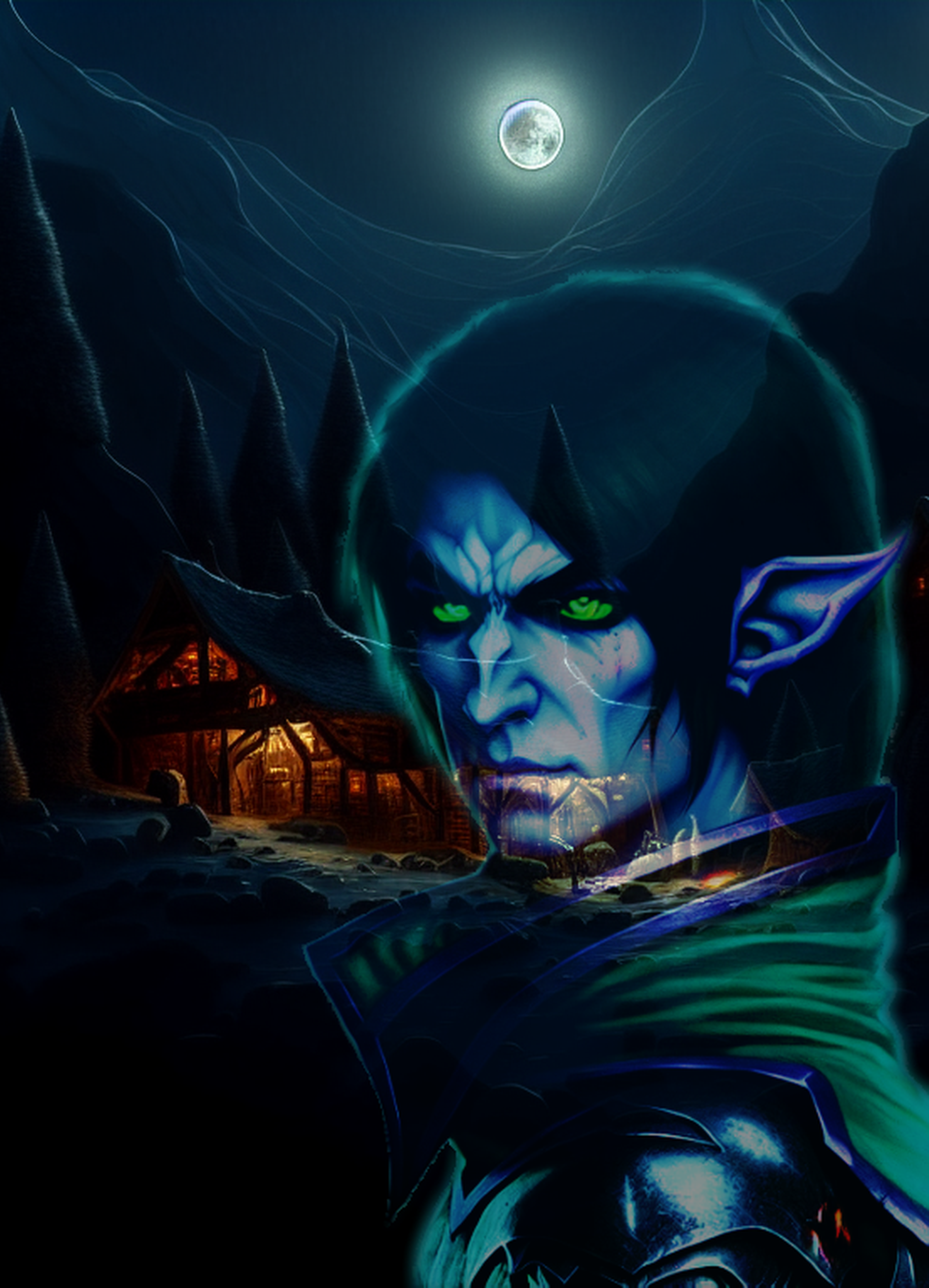 В общем и целом: высок, худощав, красив. Глаза изумрудные, волосы чёрные, максимум по плечи. Призрачно бледен. Наш с нейронкой вариант опять-таки прямо на обложке.