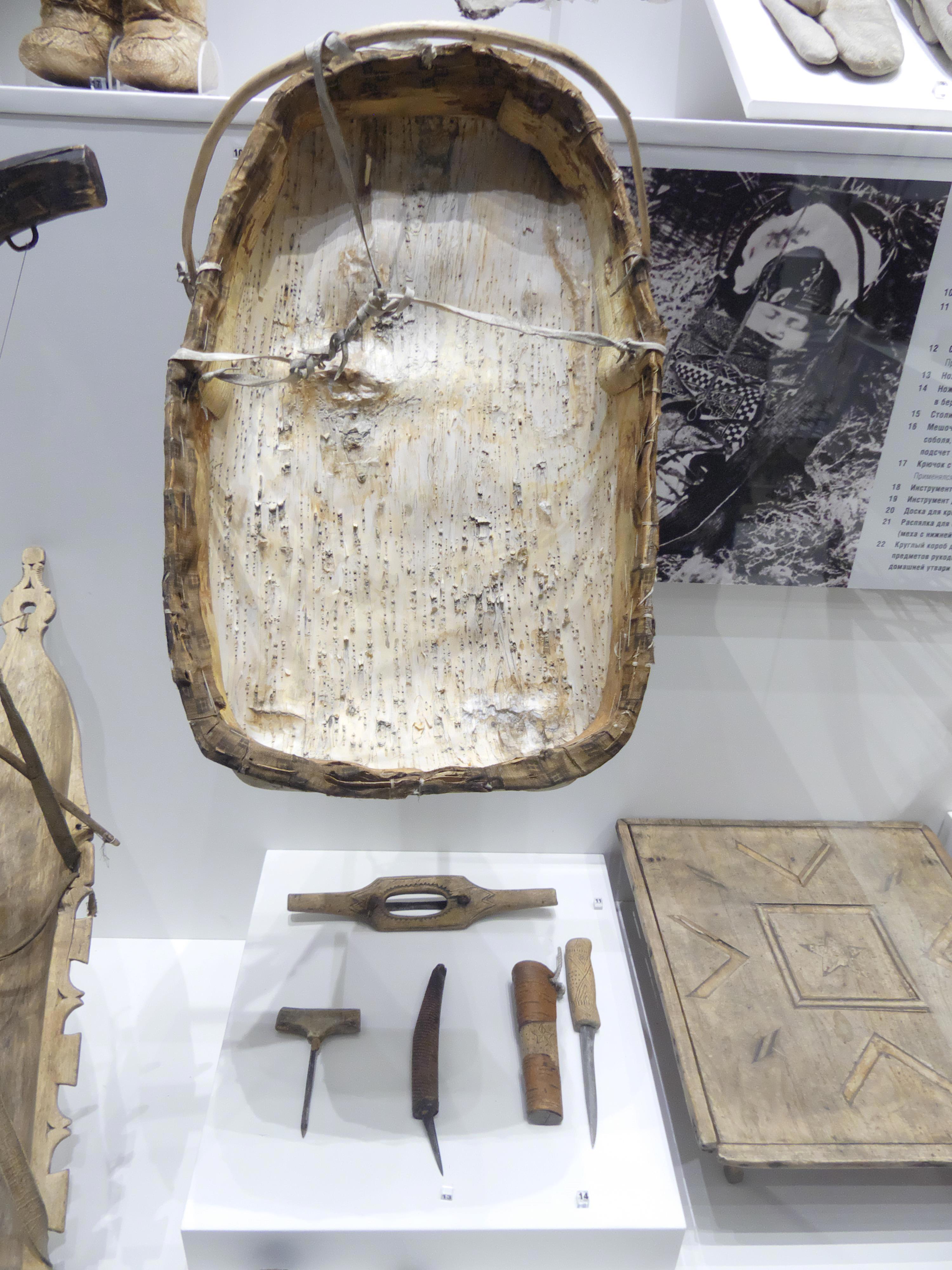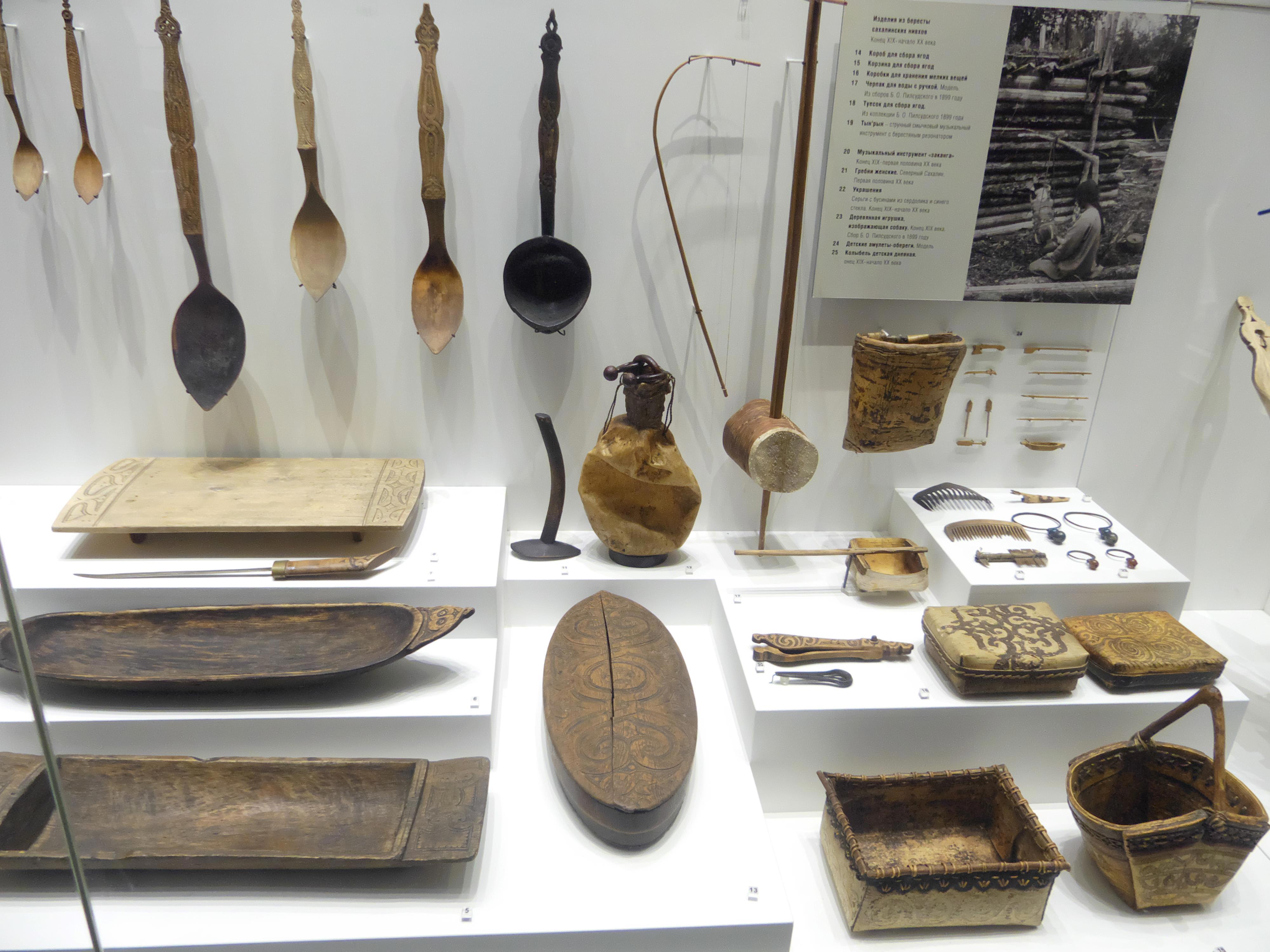 Изделия нивхов из бересты - короб, туесок, гребни, украшения, ложки, а также деревянные корыта.