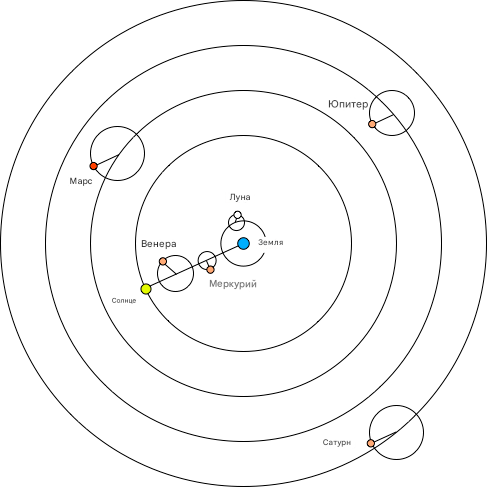 Птолемей же, чтобы спасти теорию о Земле в центре, придумал мудрёные эпициклы, некую выдуманную систему кругов внутри кругов на небесных картах, по которым якобы правильно двигались планеты. Эти выдуманные эпициклы стали настоящим математическим костылём, подпиравшим иллюзию того, что все небесные тела движутся вокруг Земли.