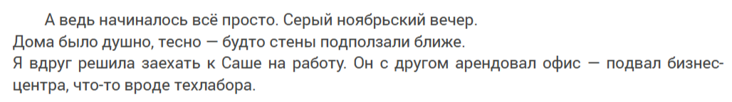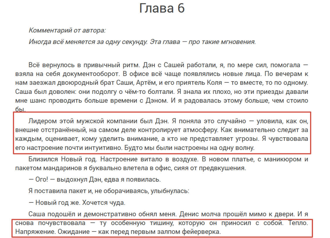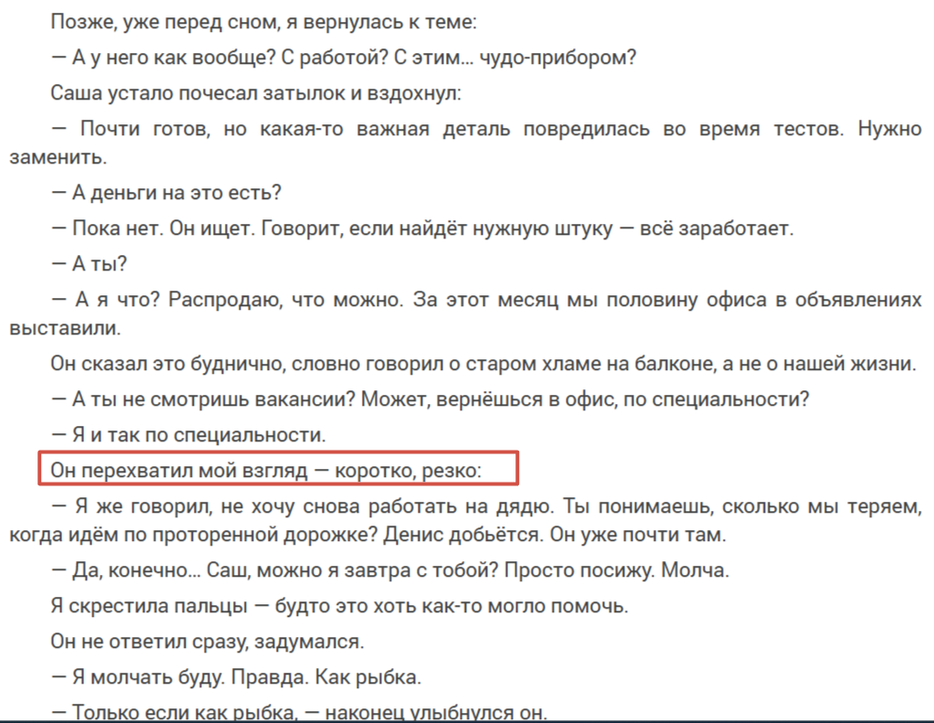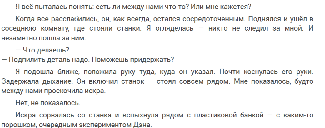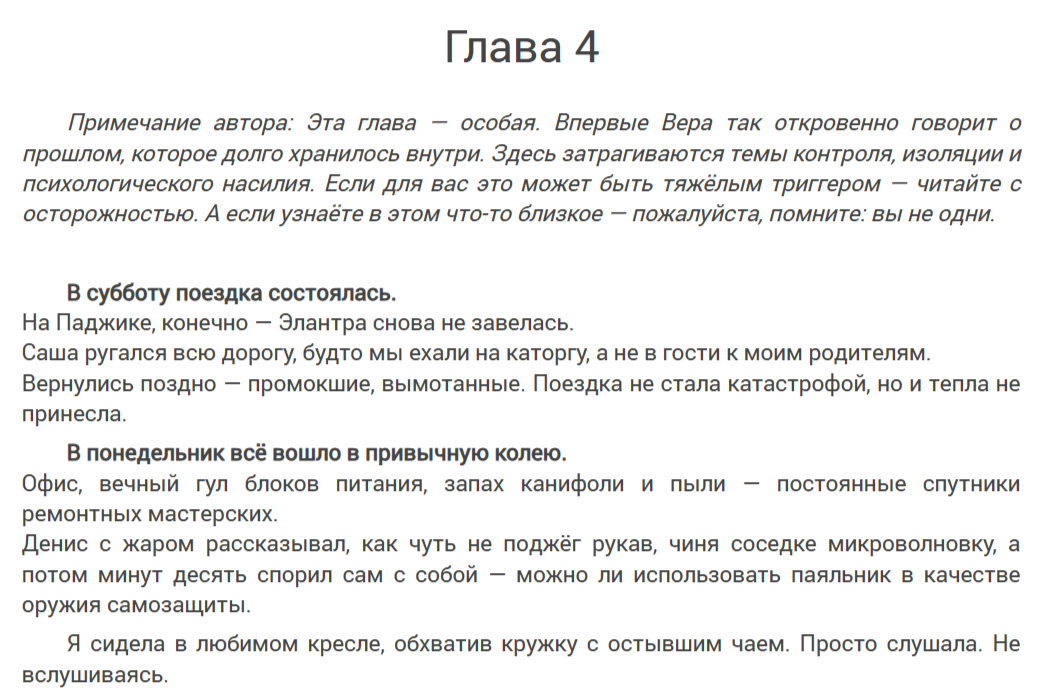 Вот например, Саша с Верой приехали на работу в третьей главе. Вера просит, чтобы ее отвезли к маме на день рождения в четверг или дали машину, чтобы она поехала сама. У Саши "проект, который надо сдать до понедельника", Дэн его не отпускает, потому что сидит на столом "с какой-то платой в руках". Им прислали какое-то ТЗ, прислал какой-то "инженер ихний". Очень взрослая ситуация, конечно. День рождения в четверг, поэтому все должны забыть о работе, особенно люди, которые работают на себя. И я напоминаю, Вера уже давно сломана абьюзером, уже давно живет с ним под одной крышей, но все еще не принимает ситуацию, когда ей говорят "нет, мы не поедем к маме в четверг, мы поедем в субботу".