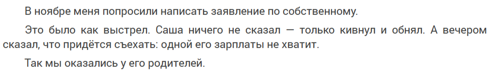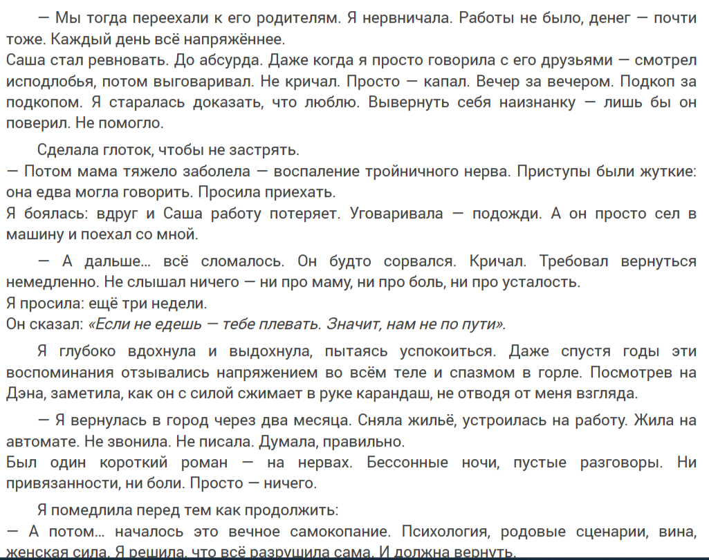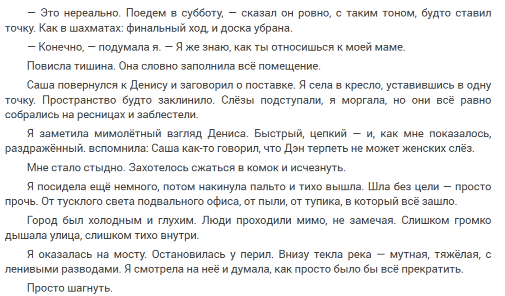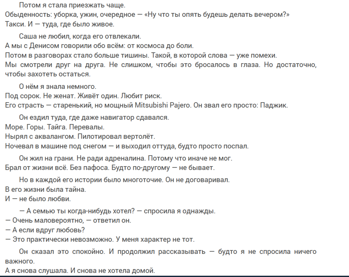 Тут читатель окончательно теряет возможность понимать, что было раньше, что произошло после, где прошлое, где сейчас, где причина, где следствие. Почему безработная Вера не могла поехать к маме лечить ее воспаление? Почему из-за этого Саша должен потерять работу? Сколько времени Вера была с мамой? С Сашей она помогала маме или без Саши? Когда и почему все сломалось? ЧТО У САШИ С РАБОТОЙ? Почему Вера бросила маму и Сашу и стала просто снимать квартиру в городе и завела короткий роман? ЧТО ТАМ С МАМОЙ-ТО?