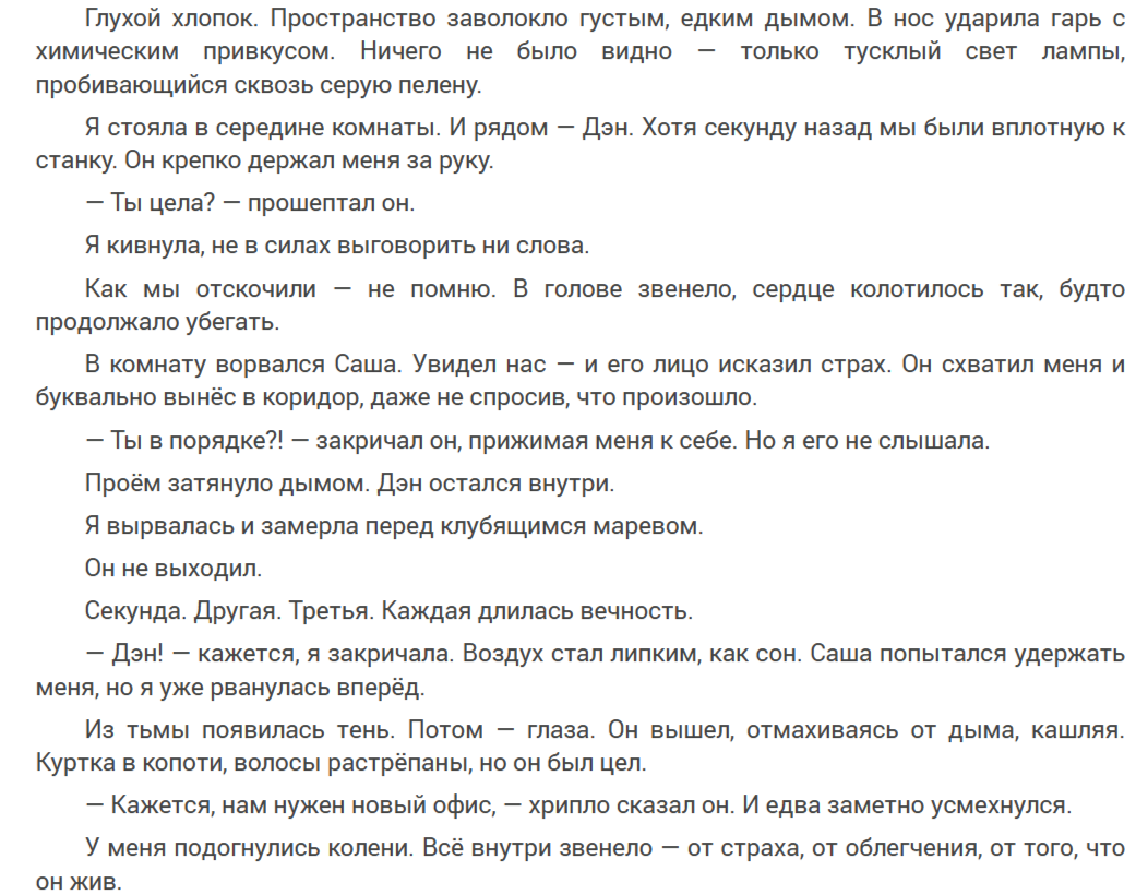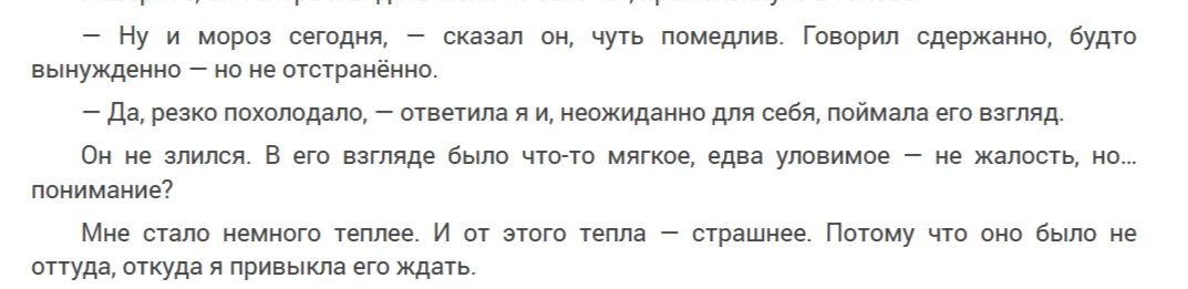 Если вы не понимаете всей глубины этих метафор в этом триллере-любовном романе (елки, я не знала, что это триллер, пока не посмотрела на жанры вот прямо сейчас), мне за вас даже неловко. Читатели, которые пишут в одном стиле и настроены на одну волну с автором этого текста, все понимают и все чувствуют, я прочитала комментарии и лично видела, как хорошо они все понимают. Стало ли мне стыдно за мои кровоточащие глаза и мое нечуткое сердце? Нет, не стало.