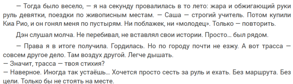 Правда, я все равно не понимаю, что это за работа у них такая, что они болтают и рассуждают о всяких отвлеченных вещах, пока героиня сидит на работе в любимом кресле с чаем и просто слушала. И даже тут лажала: не вслушивалась. Я не знаю, как она живет эту жизнь, и очень бы ей сочувствовала, не будь она бруском деревянным для будущей ложки, а всамделишной героиней романа, которая очень старается прожить свою маленькую придуманную жизнь так, чтобы кто-то потом о ней читал и всерьез переживал за неё и верил ей.