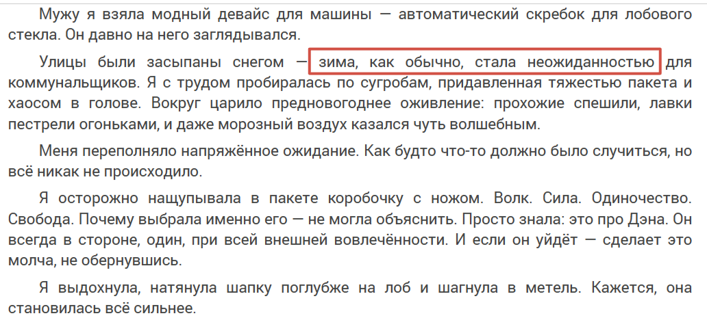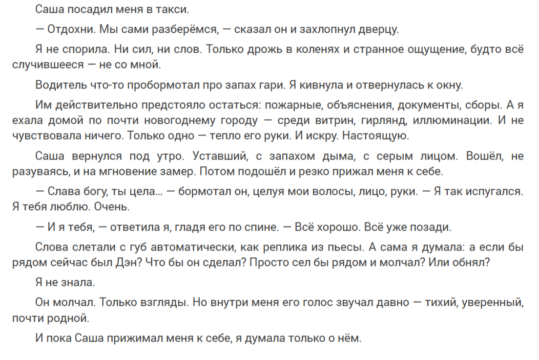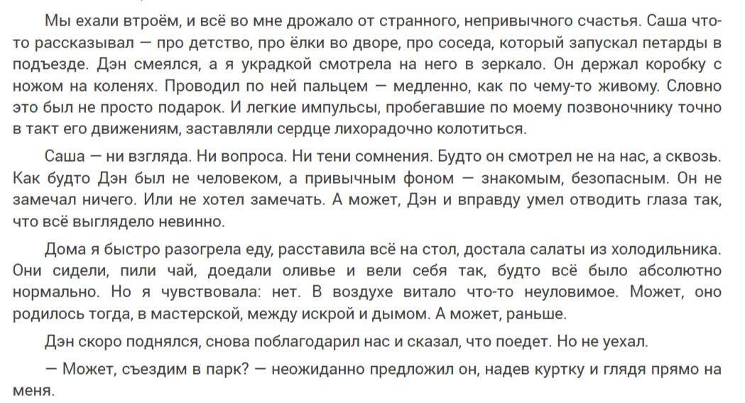 Вера - жена Саши. Саша абьюзер. У Саши есть друг и бизнес-партнер Дэн. Вера влюбилась в Дэна, но оба они боятся Саши, который может убить обоих, поэтому просто смотрят друг на друга на протяжении 20 глав, которые наструганы не по какому-то принципу, а просто под размер. Я бы не сказала, что в главах происходит хоть какое-то событие. Событий тут на самом деле практически нет. В первой главе героев останавливает полиция - это флешфорвард. Где-то постфактум упоминается пожар в офисе, после которого героиня носит в кармане и постоянно трогает какой-то медный брусок - я это просто не уловила в бесконечных пустых разговорах и рубленых рефлексиях, какой подарок Дэну на новый год подарить. Пожар просто упоминается как свершившийся факт. Медный брусок на память о пожаре с собой выносить во двор, чтобы побыть с курящим мужем, и трогать - боже, ну я понимаю, откуда этот артефакт как артефакт, но почему его не вырезали - не понимаю. Это просто лишняя раздражающая деталь: брусок? медный брусок в кармане? зачем же она его носит? что же это значит? Этакая наживка. Люди этим приемом пользуются аккуратнее, хотя не всегда, конечно.