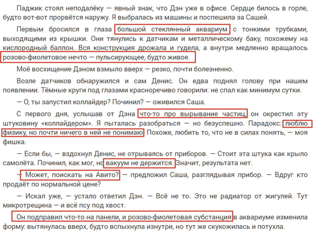 Я прочитала 20 глав, и я так и не поняла, а кем Саша и Дэн работают. У них крупный заказчик, для которого закупили материалы на какие-то совершенно неприличные деньги, вероятно в кредит, и он кинул их. И они не могут распродать материалы. Не могут найти новых заказчиков, а все старые поотваливались. У Дэна на столе лежат "платы" и "инструменты", в полном бардаке. Дэн, просиживая в офисе сутками, пытаясь спасти бизнес, мастерит коллайдер, в котором плавает розовое нечто. Что э т о за бизнес? Что такое техлабора?