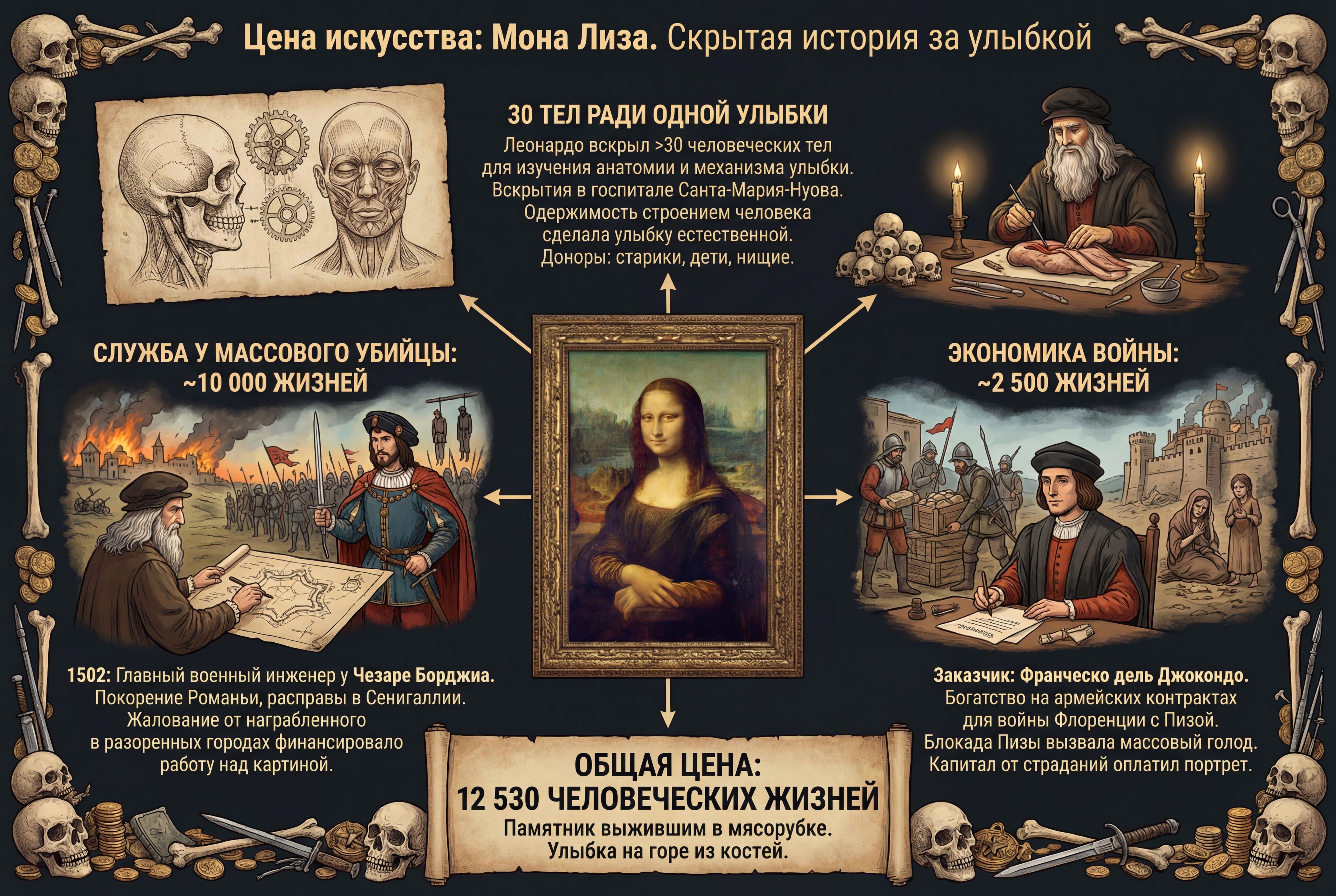 Автор: Лев ЯсенскийКогда вы смотрите на «Мону Лизу» в Лувре, вам рассказывают о загадочной улыбке, мягком свете и гении Леонардо да Винчи. Но никто не пишет на этикетке в музее, что этот портрет — побочный продукт войн, торговых спекуляций и вскрытия трупов.