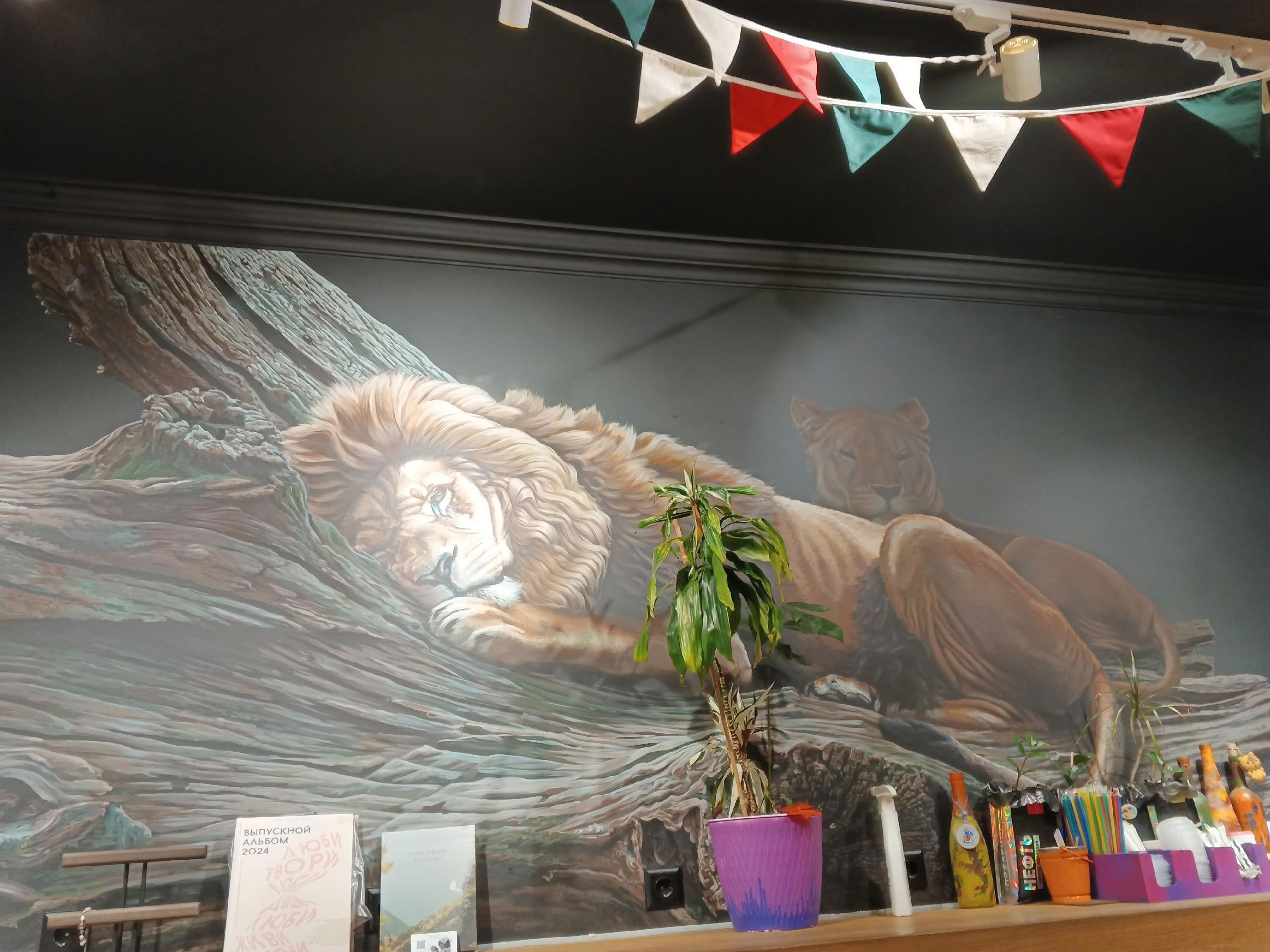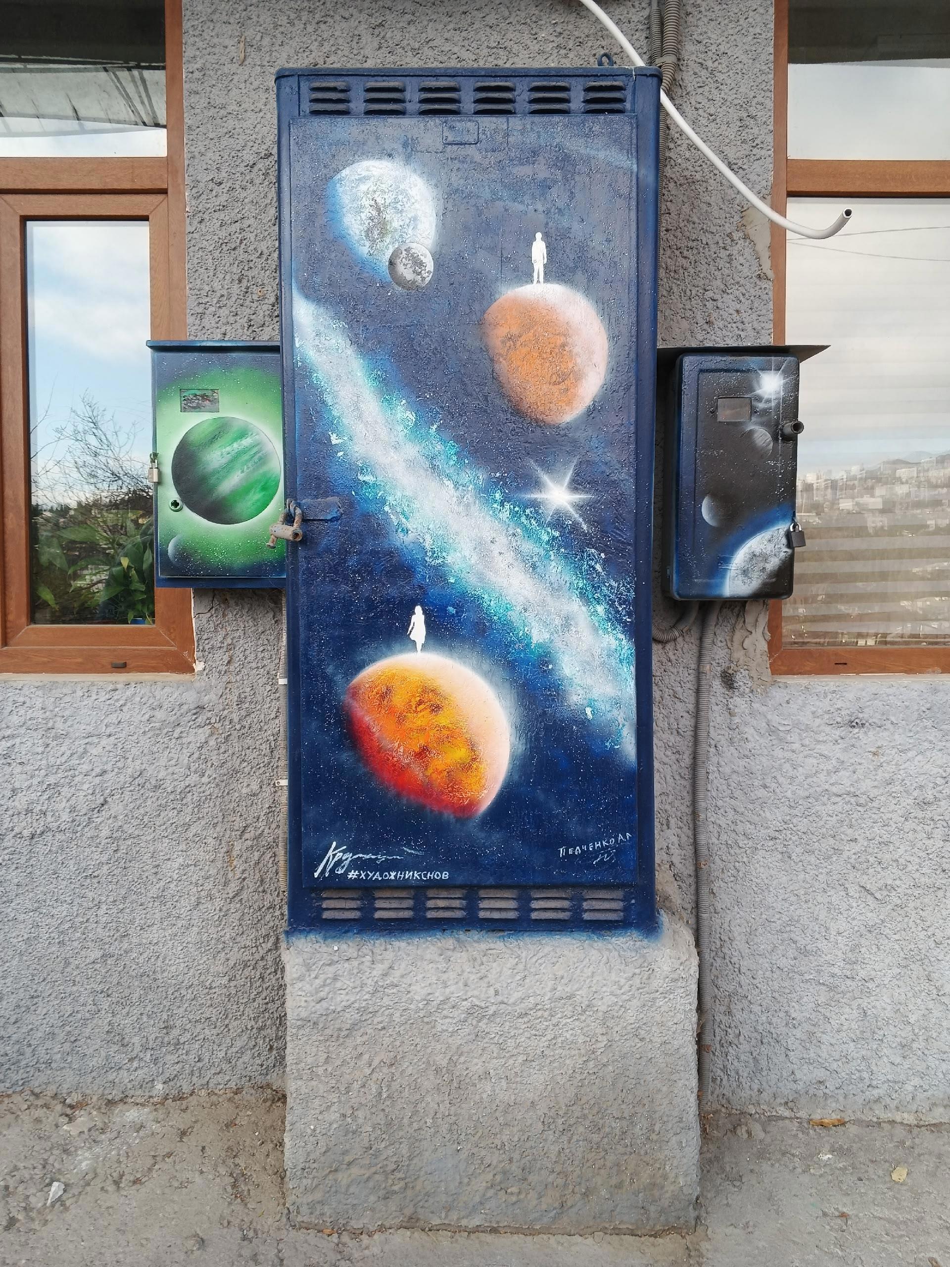 Что сказать. Высоко, узко, старые хрущёвки. Дороги даже подремонтированы, а вот всё остальное ещё нуждается в ремонте. Пока ожидали заказчика погуляли, подышали воздухом и обнаружили очень симпатичную роспись.
