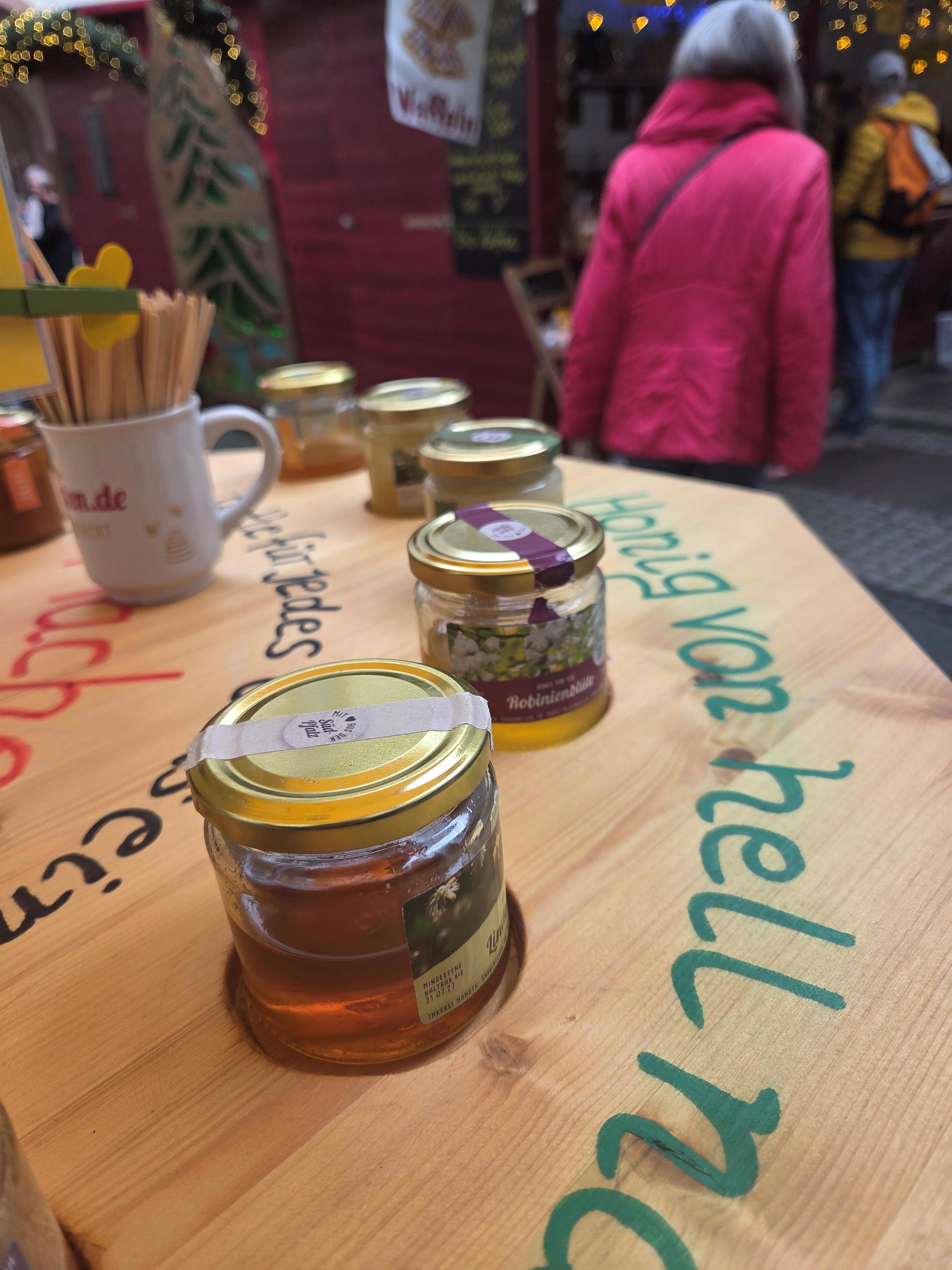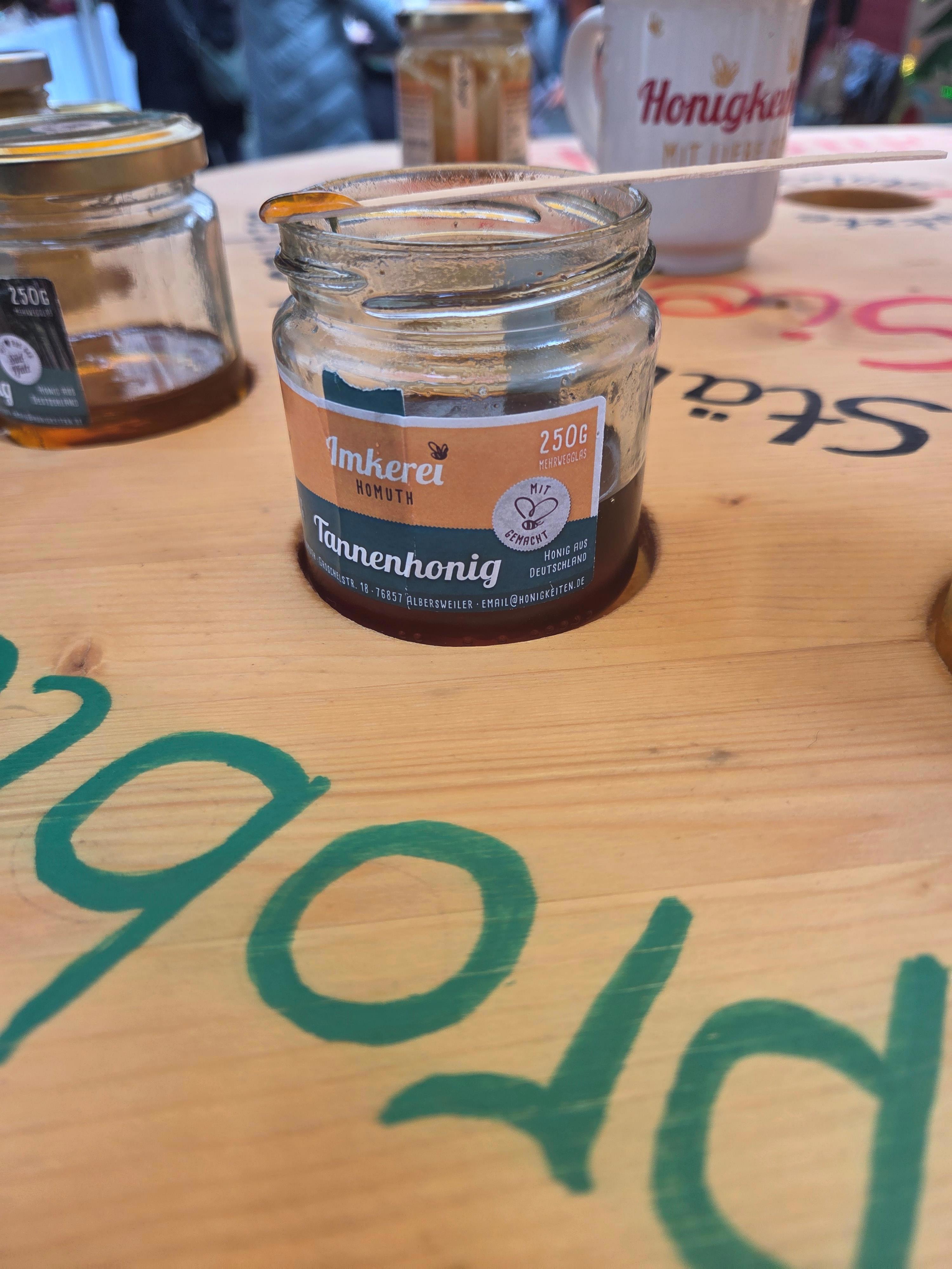 А это наши сорта мёда: еловый, каштановый, липовый и цветочный. Кстати, можно попробовать бесплатно