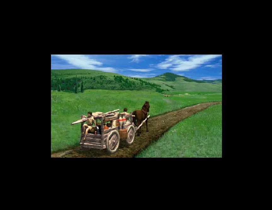 ... на перекрестке в центре местный торговец со своей крытой тележкой едет в торговые склады, а с другой стороны идет охранник со стен города.