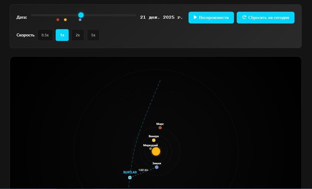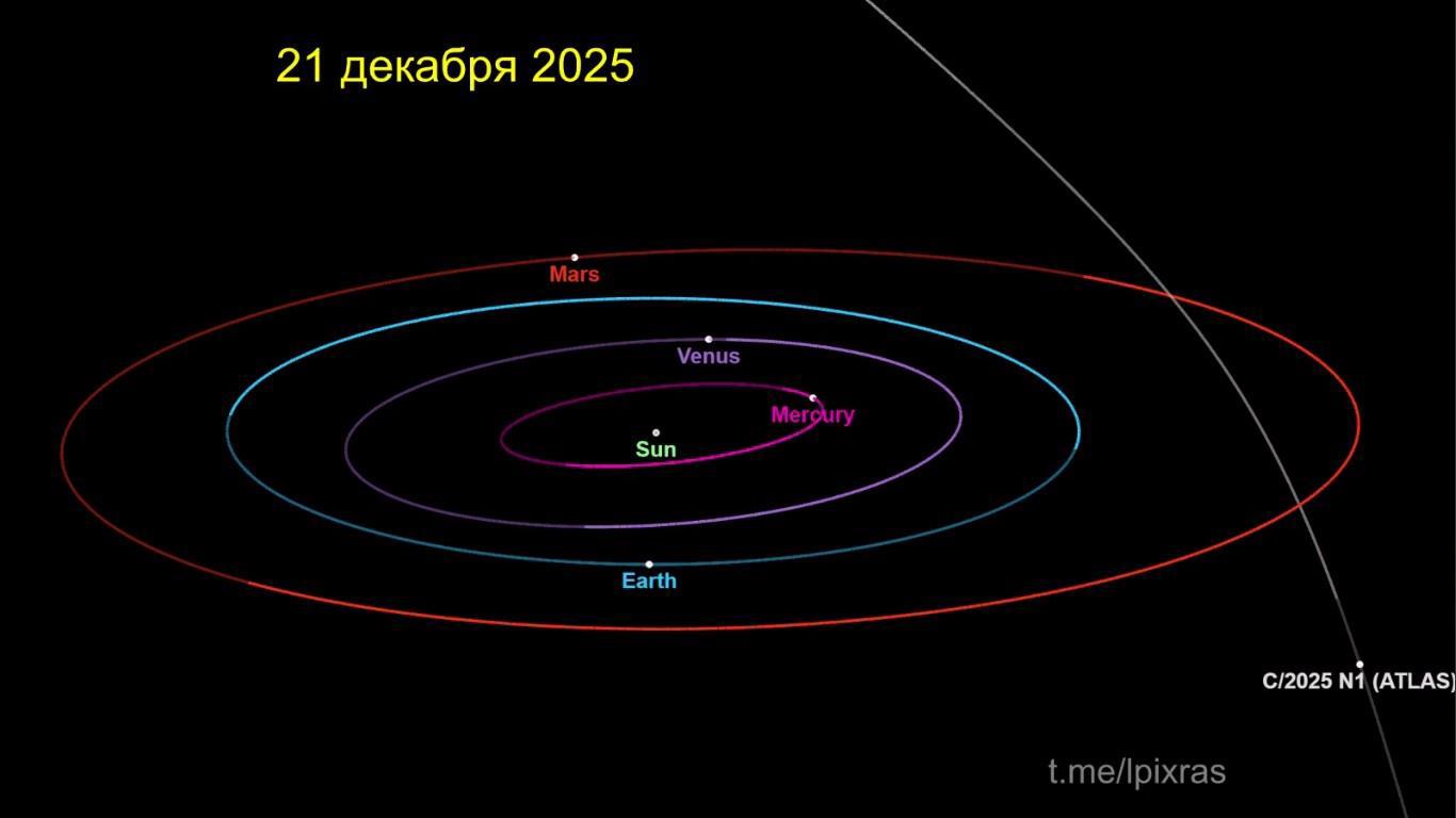 Ранее ведущий научный сотрудник Института космических исследований (ИКИ) РАН Натан Эйсмонт сообщил РИА Новости, что межзвёздная комета 3I/ATLAS в пятницу окажется на минимальном расстоянии своей траектории от Земли. По словам Эйсмонта, комета все равно будет очень далеко, на расстоянии 269 миллионов километров, что составляет почти два расстояния от Земли до Солнца.