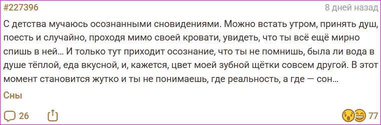"С детства мучаюсь осознанными сновидениями. Можно встать утром, принять душ, поесть и случайно, проходя мимо своей кровати, увидеть, что ты всё ещё мирно спишь в ней… И только тут приходит осознание, что ты не помнишь, была ли вода в душе тёплой, еда вкусной, и, кажется, цвет моей зубной щётки совсем другой. В этот момент становится жутко и ты не понимаешь, где реальность, а где — сон…"