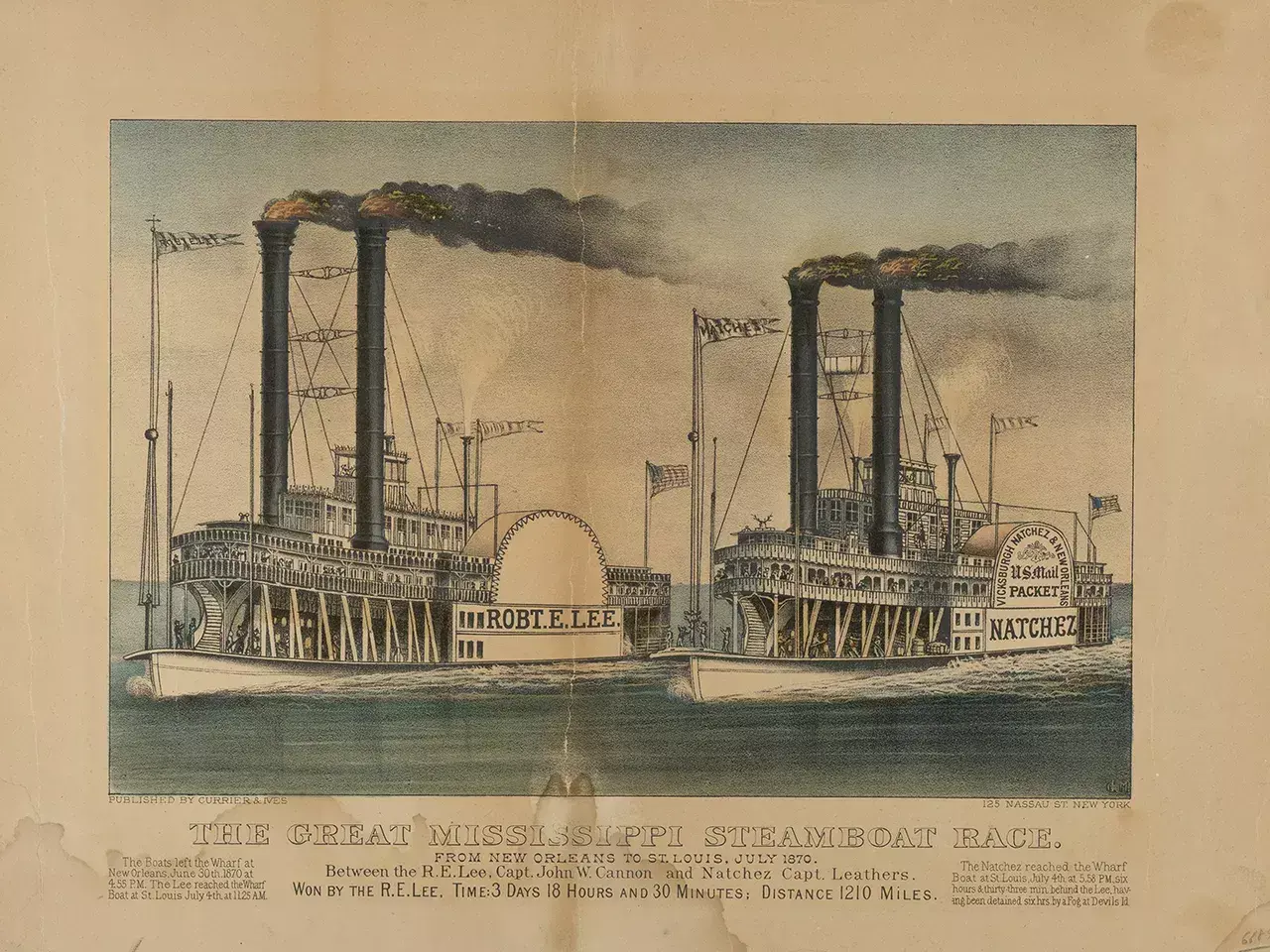P.S. С пароходами на рисунке связана отдельная история. "Роберт Э. Ли" построен в 1866 и назван, как несложно понять, в честь генерала Конфедерации (желающие могут представить постройку в РСФСР 20-х парохода "Колчак" или "Врангель"). Знаменитая гонка случилась летом 1870 года между ним и пароходом "Начез" (Natchez). В тот раз "Ли" выиграл, но 22 декабря того же года он столкнулся с пароходом "Потомак"... напротив города Начез. Получил серьезные поверждения, но был поднят, отремонтировал и еще поплавал, пока не был окончательно списан в 1876 году.