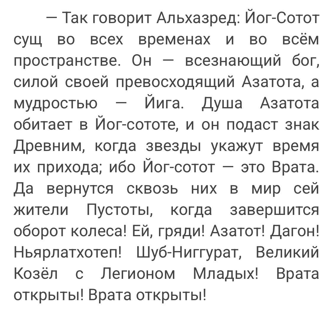 Гриб в виде человеческого детеныша без лица, который появляется позже, возвращает мой интерес. Но счастье было недолгим. Гриб-человек просит главного героя сожрать его, потому что Йог-Сотот больше ждать не может. Кто есть Йог-Сотот? Возможно, автор объяснит позже по тексту, но нет. Грибник съедает гриб, и дальше произносит это: