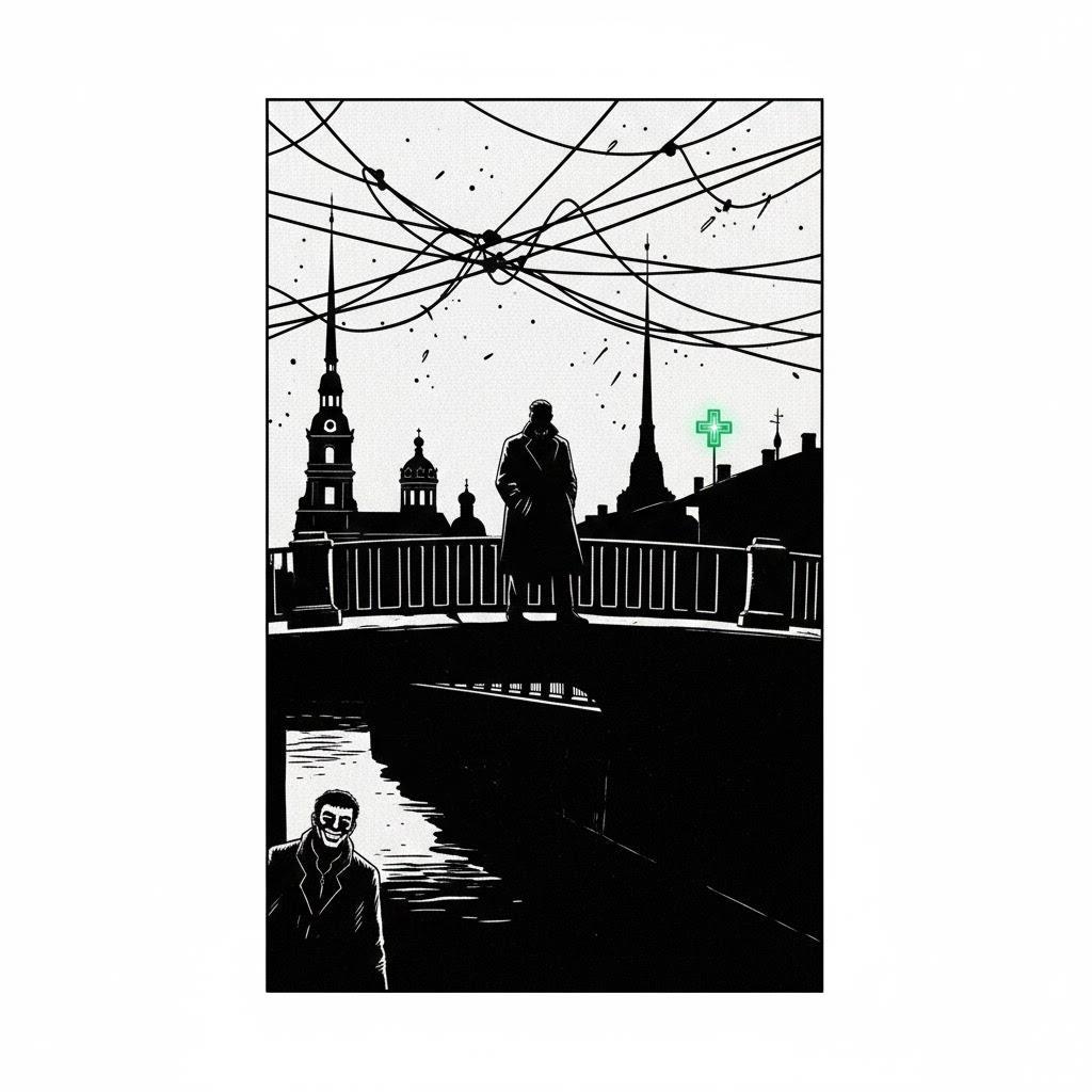 "Бронзовый ангел, что стоит на вершине Александровской колонны, мог бы с упоением наслаждаться холодным звёздным небом Санкт-Петербурга, но строгий взор его был устремлён вниз, на землю, где по одному из безлюдных переулков города пошатывался лысеющий мужичок за сорок. Василий распахнул пальто навстречу пронизывающему ветру. Колючий шарф натёр кожу докрасна. Он злился на Ирку, ненавидел весь город, который не оставил ему ничего, кроме злобы. Он хотел, чтобы она заткнулась, а не плакала на кухне, как обычно. Вернёт он все долги. Он хлопнул дверью так, что дребезжали стекла. "Так и сгниёшь тут одна", — голос его был пропитан водкой. Ирина даже не обернулась, продолжала молча смотреть в окно кухни. Она знала, что тишина бесит его больше криков. Он быстро натянул пальто и отправился за добавкой. Теперь в голове Василия не гудела ссора — её заглушил алкоголь."