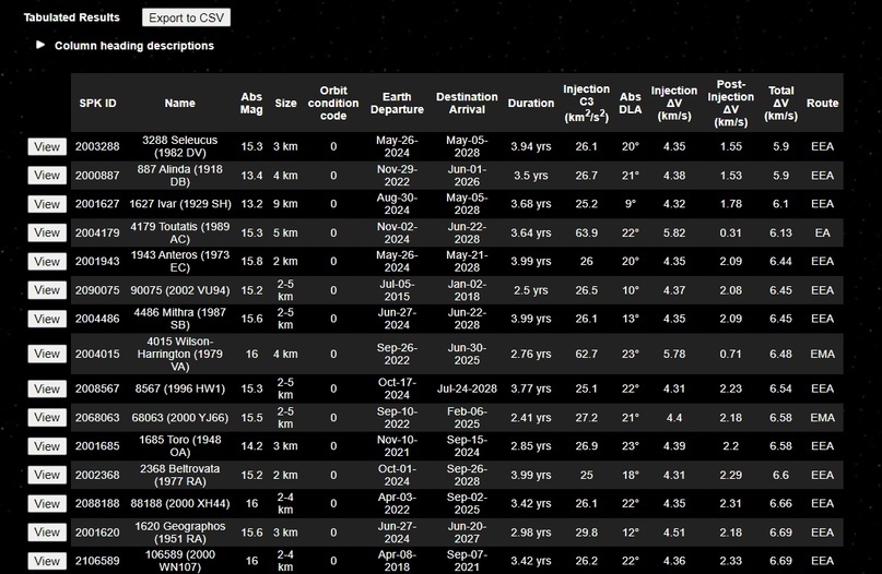 Наконец таблица с данными. Чтобы посмотреть анимацию миссии нужно кликнуть на View. В таблице основные параметры, расшифровка что означает каждая из колонок тут же. В таблице есть данные о дате запуска, размерах астероида, дате окончания и продолжительность миссии, требуемое дельта-В на разных этапах. Нажмите View на любой из объектов. Откроется не только анимация, но и детали миссии. В скриншоте ниже показана только часть таблицы.