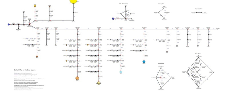 Калифорнийский студент Ulysse Carion создал эту карту (скачать полностью можно тут), которая показывает, как космический корабль может исследовать Солнечную систему. Небольшим телам, таким как крошечный спутник Марса Деймос, требуется столь же небольшое ускорение, чтобы избежать гравитационного притяжения. Для того, чтобы космический корабль мог покинуть гораздо более крупное тело, такое как Юпитер или Сатурн, ему также нужно гораздо больше топлива и большее изменение скорости (которое и есть Дельта-В). Карта была создана с использованием ракетного уравнения Циолковского, разработанного русским ученым Циолковским в 1903 году.