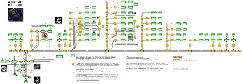 Каждая интересующая планета или спутник обозначен на карте кружком. Области «перехвата» обозначают области, где можно изменить траекторию движения к другому миру. Каждое число на графике обозначает, сколько «дельта-v» или скорости и топлива необходимо, чтобы добраться до разных пунктов назначения. Чем больше планета или луна, тем выше ее гравитация и тем больше требуется дельта-v.