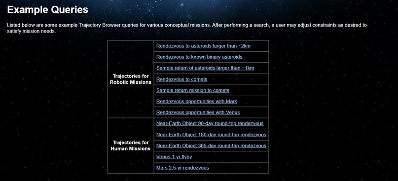 Нам доступен поиск, документация с подробным описанием всех обозначений и примеры запросов (Example queries). Туда и пойдем. Эта страница предлагает выбрать одну из двух категорий - это Траектории роботизированных (автоматических) миссий (Trajectories for Robotic Missions) и Траектории пилотируемых миссий (Trajectories for Human Missions). Все полеты представлены в двух видах полет в одну сторону (Rendezvous) и полеты в обе стороны, то есть с возвращением на Землю (Round-trip rendezvous).