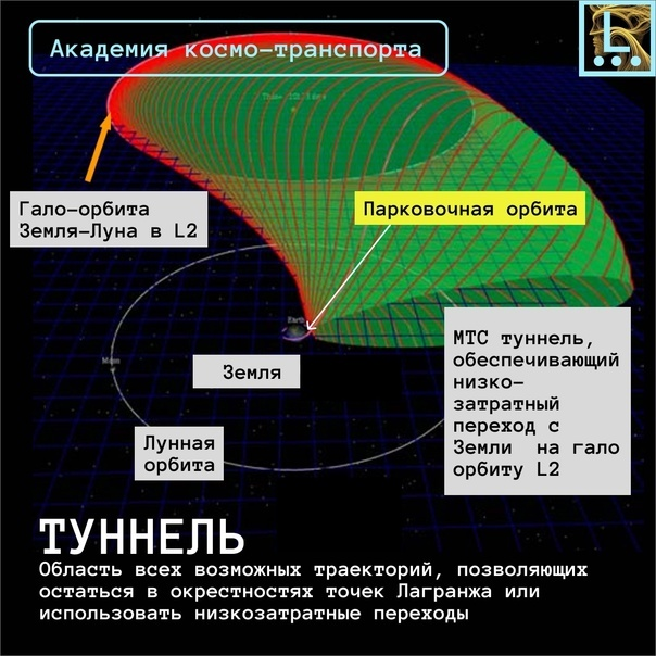 Лагранжевые окрестности - это область (сфера) вокруг космического тела (например, планеты Земля), где действуют особые силы и ограничена она точками Лагранжа L1,L2 и L3. Неустойчивые гало-орбиты в этих точки дают космическому путешественнику интересные преимущества. Так как орбита вокруг точки Лагранжа является нестабильной, то любое тело рано или поздно должно сойти с такой орбиты. При проведении точных расчетов возможно проведение коррекции и выбор одного из многих путей, исходящих из точки Лагранжа. Многие из таких путей ведут к другим планетам или их спутникам. Это означает, что после достижения точки L2 системы Земля-Солнце (окрестности Лагранжа), возможен перелет к значительному количеству мест с небольшими дополнительными затратами топлива, либо вообще без них. Таким образом, небольшое отклонение (например, за счет кратковременного запуска корректирующего двигателя) - и можно улететь в один из туннелей МТС - либо на вход (зеленая область на картинке), либо в сторону выхода (оранжевая) без значительных затрат энергии. Окрестность Лагранжа для системы Солнце-Земля в данном случае - это сфера вокруг Земли радиусом 1,5 млн. км (напомним, что именно на таком расстоянии в точке Лагранжа сейчас работает Телескоп Джеймс Уэбб - но в отличие от межпланетных путешественников он все время корректирует свою орбиту, чтобы не улететь с неё). Во истину, у точек Лагранжа оказалось очень много разных применений!