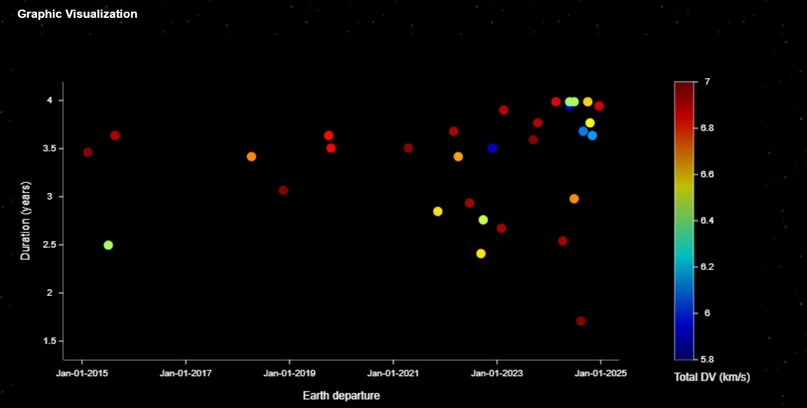 Следующий блок - графическая визуализация всех найденных траекторий. По вертикали - длительность миссии (чем выше, тем дольше), по горизонтали дата запуска, цвет шарика означает суммарный бюджет дельта-В (то есть сумма всех дельта-в за миссию): более темный красный - максимальное значение, синий - минимальное. Так на представленной картинке только 1 миссия имеет синий кружок и ее бюджет дельта-в составит всего 6 км/с, продолжительность этой миссии составит примерно 4,5 года.