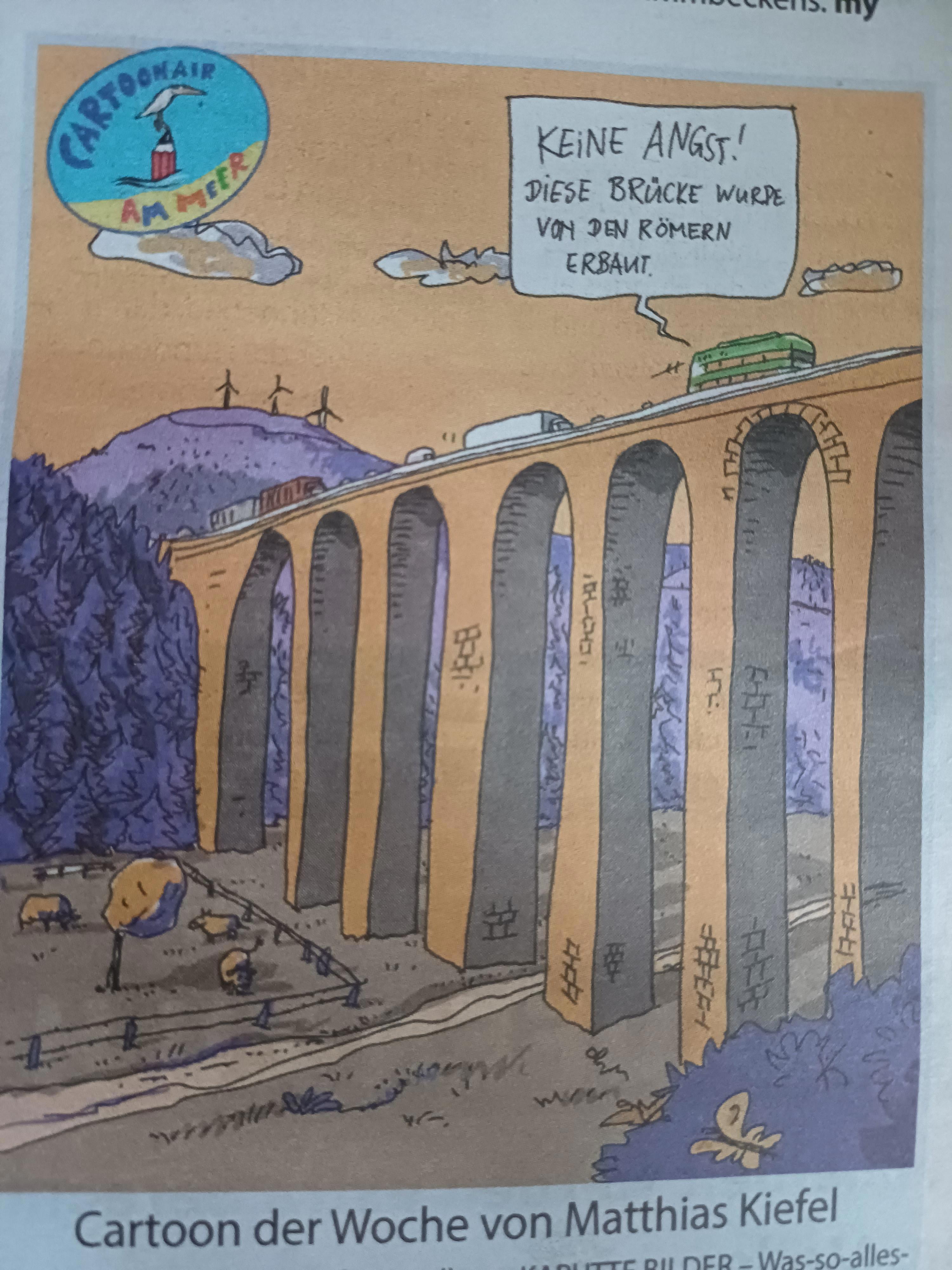 Написано - "Не бойтесь! Этот мост строили древние римляне, не рухнет". Потому что проверено временем