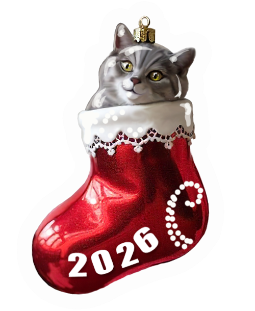С полки свисало два декоративных носка для подарков: вязаный полосатый и красный с широкой белой оторочкой с вышитыми буквами. В красном носке сидел кот.