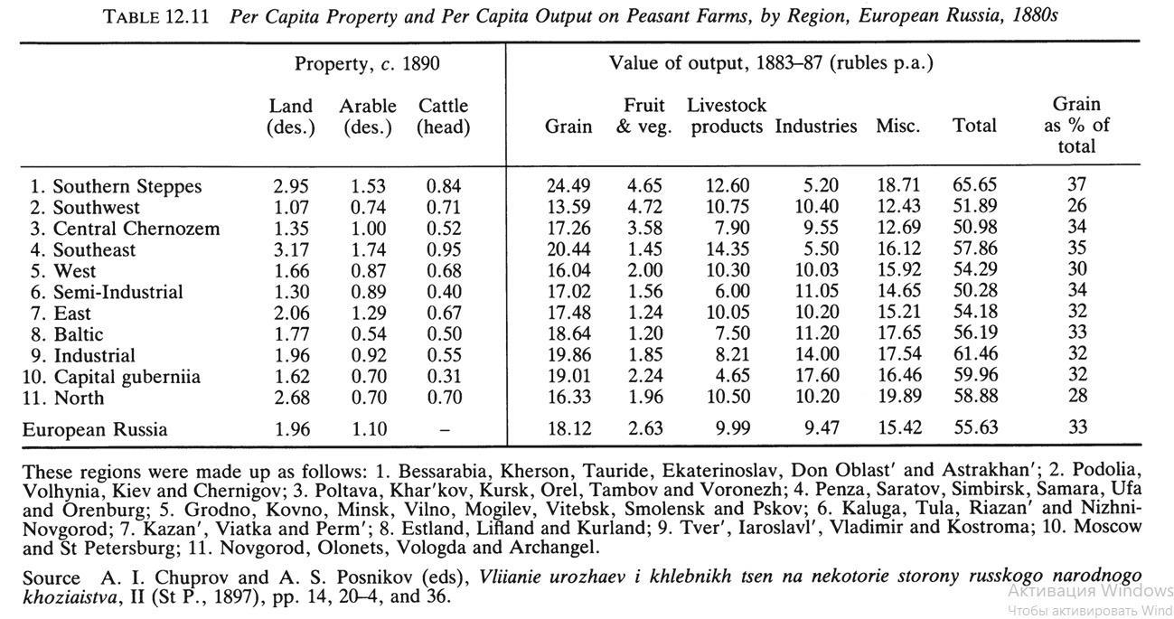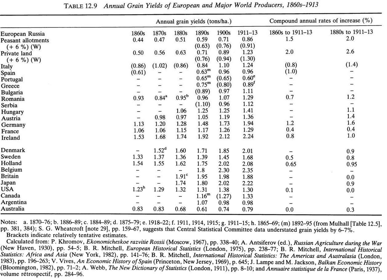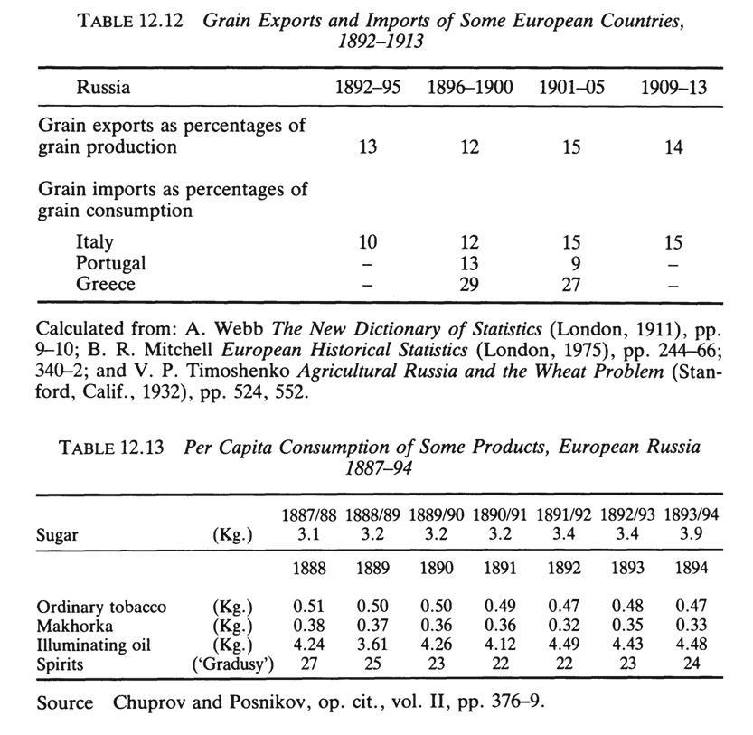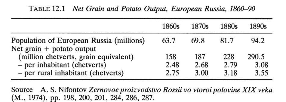 "Подробная и всеобъемлющая работа советских историков по сбору статистических данных по пятидесяти провинциям Европейской России достаточно убедительно продемонстрировала, что чистое производство зерна и картофеля с 1860-х по 1890-е годы увеличивалось на 2,0% в год, значительно опережая рост населения (1,3% в год). и рост численности сельского населения (1,2 процента в год) - см. таблицу 12.1. С учетом того, что (по осторожным оценкам западных историков) чистый объем производства зерна и картофеля в России рос более чем на 3 процента в год в период с 1885-89 по 1909-13 годы, результаты развития сельского хозяйства выглядят вполне достойно.