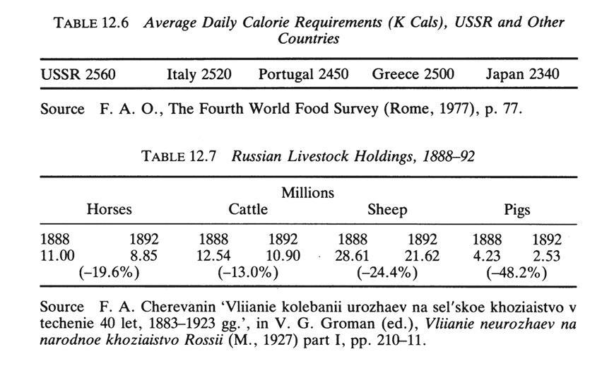 Если итальянцы, португальцы, греки жили употребляя примерно вдвое меньше зерна и картофеля, чем русские (даже с учетом импорта и экспорта зерна), то это ставит под сомнение мнение о том, что Россия жила на грани «голода» в конце девятнадцатого века и что она пережила фактический «голод» катастрофических масштабов в 1891-92 годах, в результате которого якобы погибли сотни тысяч людей. В конце концов, в 1891 году производство зерна и картофеля было соответственно всего лишь на 19,5% и 3% ниже среднего показателя 1881-90 годов; в 1892 году производство зерна и картофеля составляло соответственно 93,5% и 155% от среднего показателя 1881-90 годов; притом было сохранено достаточное количество семян для получения рекордных урожаев в 1893 и 1894 годах. Из-за различий в климате и размерах тела русским нужно большее ежедневное потребление калорий, чем южноевропейцам или японцам, однако это различие..намного меньше, чем различия в производстве зерна и картофеля на душу населения в конце девятнадцатого века (таблицы 12,4-12,6).