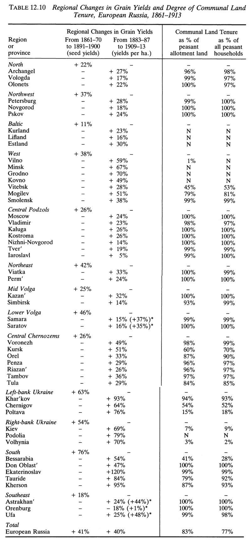 Кроме того, хотя Ленин умело манипулировал статистическими данными свидетельствующих о том, что в 1896-1900 годах 29 процентов русских крестьянских дворов были безлошадными, а 30 процентов имели только одну лошадь на хозяйство… Это верно, но также верно, что в России было примерно в два раза больше лошадей на душу, чем в Европе (без России) и что в России исключением оставались безлошадные хозяйства, в то время как в Европе и Азии они были правилом…. … Хайнц-Дитрих Лёве продемонстрировал, что в российском крестьянстве сельскохозяйственные доходы были даже более равномерно распределены, чем можно было предположить из данных о распределении земли, потому что для основных культур урожайность с гектара была выше в небольших (крестьянских) хозяйствах, чем в более крупных, а также потому (более важный факто), что более мелкие фермы отдавали большую часть своих земель культурам, которые приносили более высокие доходы с гектара. Более мелкие крестьянские хозяйства были в авангарде интенсификации российского аграрного развития, особенно за счет выращивания картофеля, льна, конопли, подсолнечника, табака, овощей и тому подобного (как это было и в западной Европе)... В таблице 12.9 показано, что урожайность зерна с гектара на землях крестьянских общинных наделов в Европейской России после эмансипации росла почти так же быстро, как и на на частных землях, а также то что урожайность на этих землях росла значительно быстрее, чем урожайность с гектара в Европе, Японии, Америке и Австралии, где преобладала частная собственность.