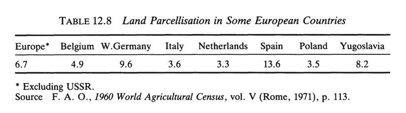 Что касается утверждений о том, что общинная система в России привела к тому, что слишком много земли оставалось под паром, следует отметить, что в странах, где частная собственность преобладала в 1910 году, по-прежнему оставлялись следующие доли пахотных земель под паром: в Польше - 18 процентов; в Италии - 17%; в Болгарии - 20%; во Франции - 11%; Голландии - 10%; в Швеции - 10 процентов; в Финляндии - 12%; в Испании (в 1935 году) - 32%; в Греции (1935-38) 25%. В Европейской России соответствующая доля (земель под паром) составляла 32% в 1903 и «не более 30%» в 1914, и эта разница (со странами Европы) в значительной степени объясняется относительно низкой плотностью сельского населения в России, и особенностями климата. Наконец, можно утверждать, что крестьянское землевладение в России, вероятно, было не более «парцеллированным», чем у крестьян в других частях Европы. «На сегодняшний день большинство фермерских хозяйств во Франции не состояли из цельных участков земли, а представляли собой чересполосицу... В начале Третьей республики средняя величина парцеллы составляла всего 39 акров» (H. D. Clout, The Land of France, 1815-1914 London, 1983). Внедрение частной собственности в крестьянских общинах Европы обычно приводило к закреплению существующей фрагментарности землевладений – частная собственность как таковая не устраняло и не уменьшало процесс фрагментации. Еще в 1960 году показатели чересполосицы в хозяйствах стран Европы были следующими: