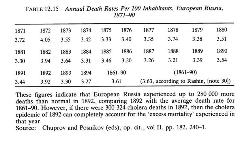 Следует подчеркнуть, что в России в 1880-х и 1890-х годах экспорт зерна… составлял всего 10-15 процентов от общего объема производства зерна и картофеля, что вывозилось очень мало ржи (основного крестьянского продовольственного зерна)… В целом, нет или почти нет никаких веских доказательств того, что увеличение смертности, которое произошло в 1892 году, было прямо или косвенно вызвано плохими урожаями, которые, в свою очередь, можно было частично обвинить в предполагаемых (но недоказанных) недостатках преобладающей великорусской крестьянской системы землевладения. Более того, оценки увеличения смертности в 1892 году, завышаются, за счет сравнения этого года с предыдущим десятилетием (1880-е годы), которое, как выяснилось, содержало необычайно высокое количество «хороших» (климатически благоприятных) лет. По сравнению со среднегодовым уровнем смертности за предыдущие три десятилетия (1861-90), в 1891 и 1893 годах уровень смертности фактически был ниже среднего. Хотя в 1892 году в Европейской России смерность превысила «нормальную» на 260 00 - 280 000 человек (см. Таблица 12.15), в настоящее время широко известноно, что в России в 1892 году около 300 000 человек умерло от холеры, поэтому можно предположить, что эпидемия холеры была причиной всей «избыточной смертности», наблюдавшейся в 1892 году.